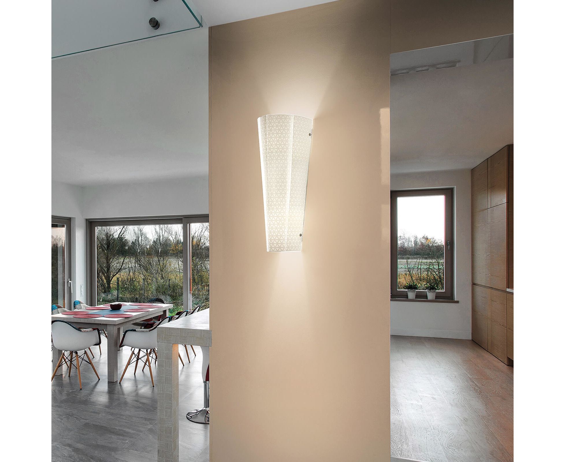 Настенный светильник из белого стекла с трафаретной печатью и белой отделкой.