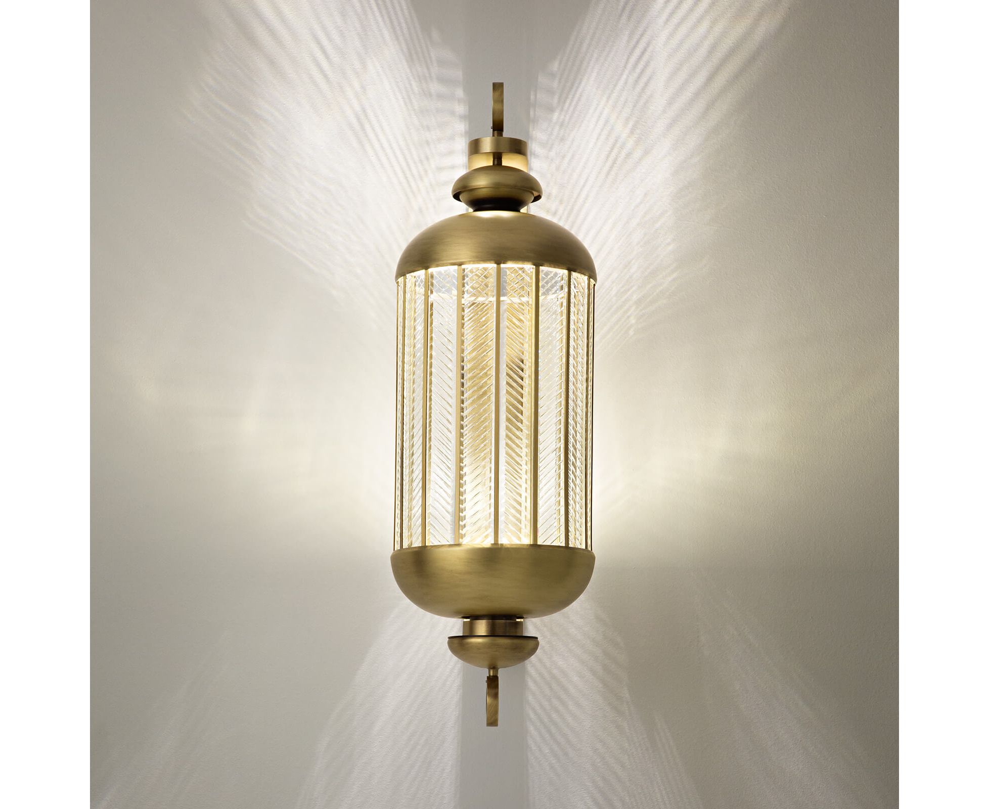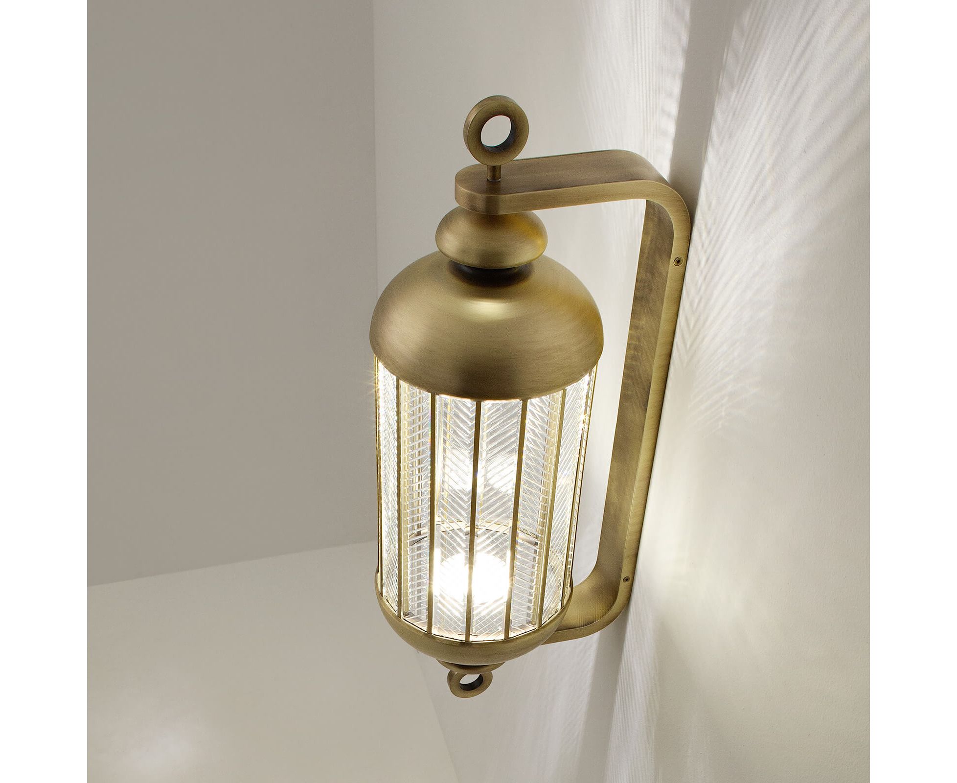 Настенный светильник из металла с отделкой под старинное золото и диффузором из резного стекла. Доступен в разных цветах.