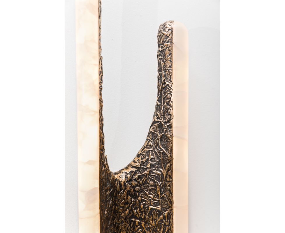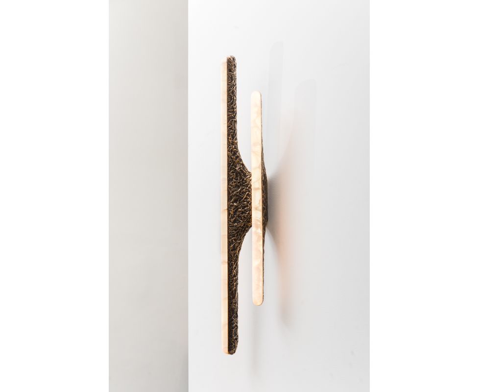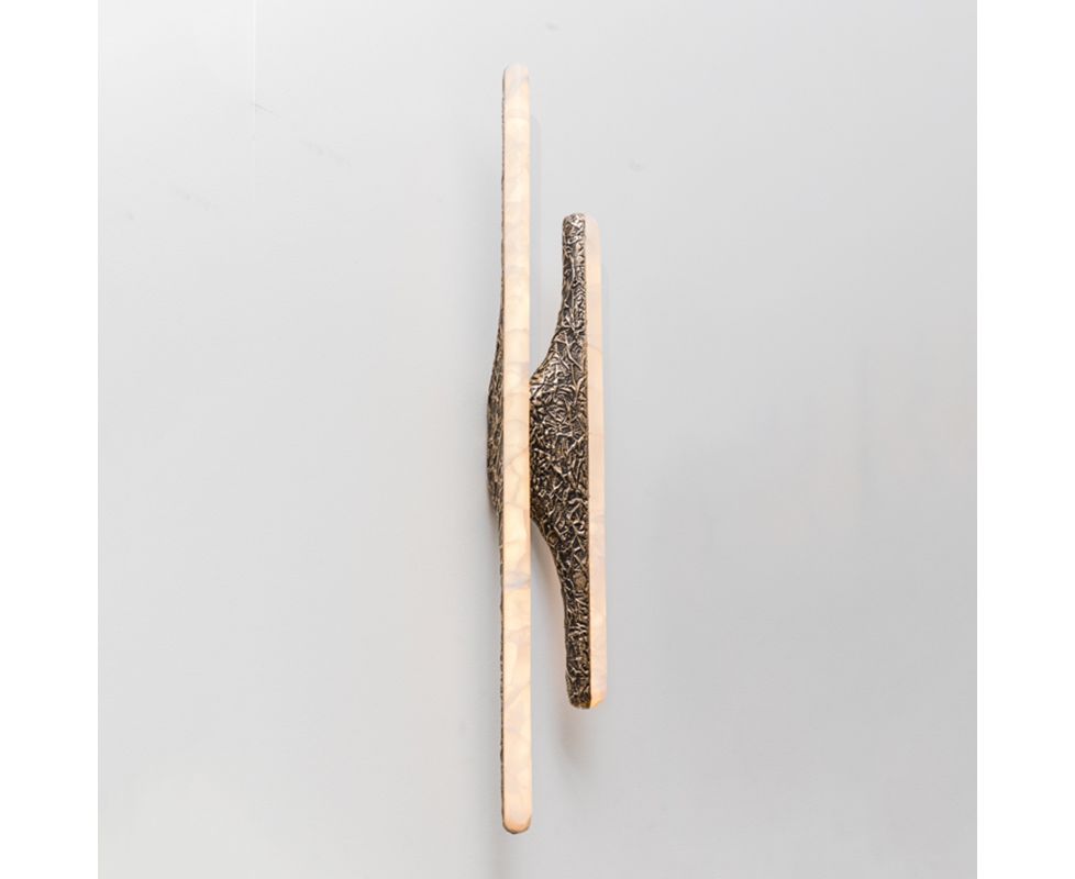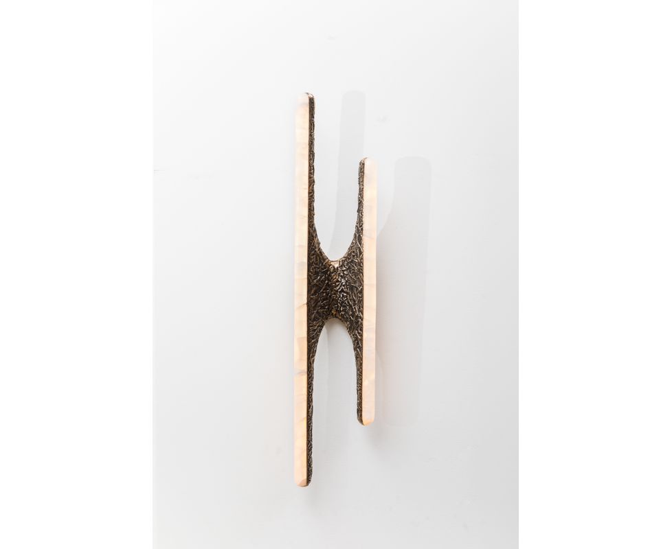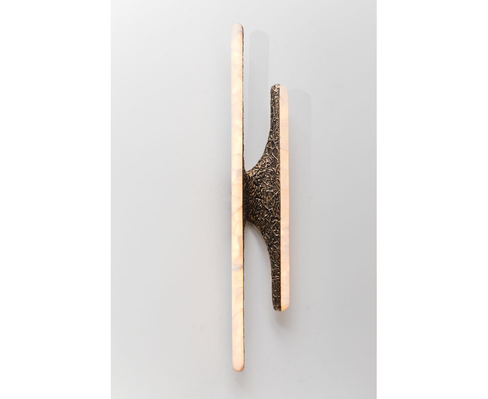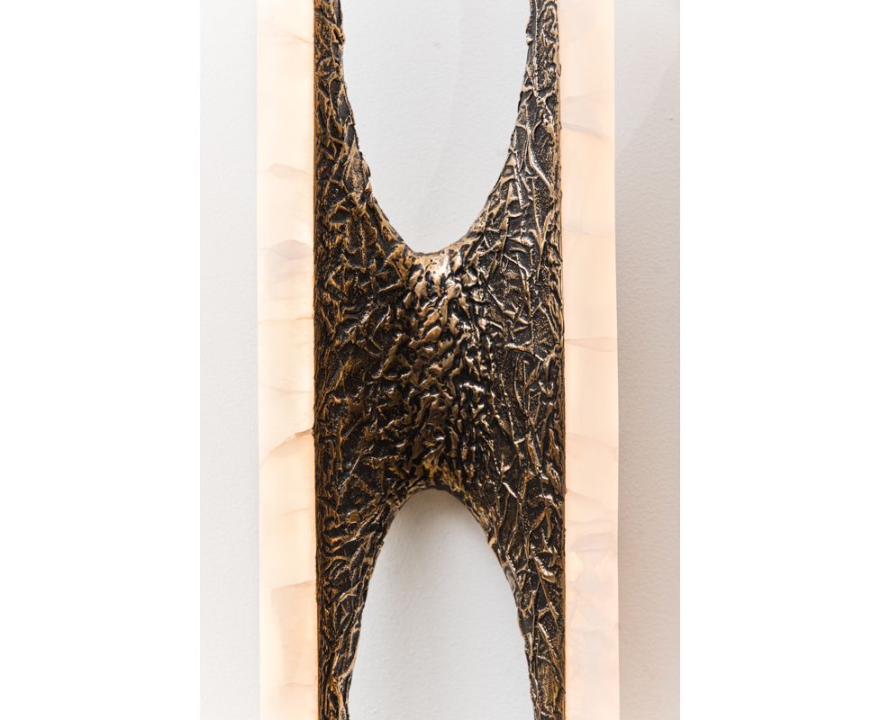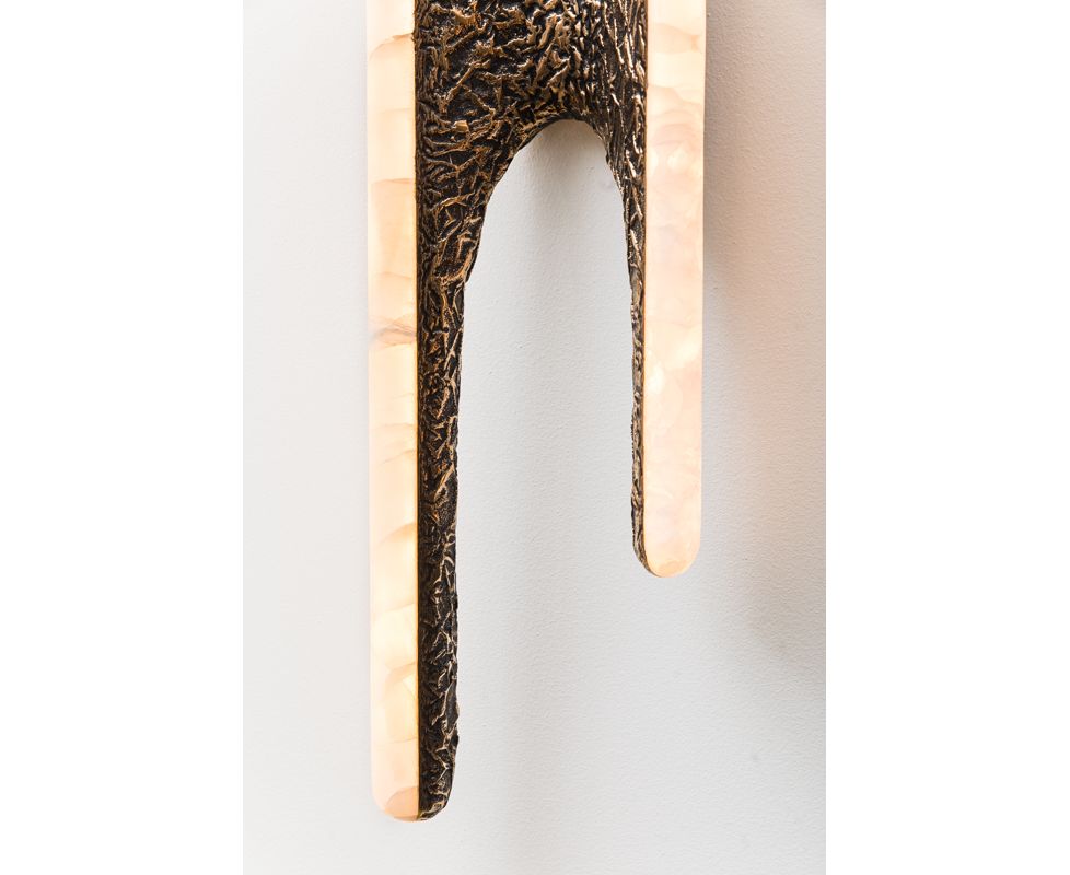 Вдохновленные природой и человеческими формами, бра и люстры серии Sculptural сделаны из бронзы или дерева асимметричной формы бабочки. Каждая вырезанная вручную форма покрыта белым ониксом, заключая в себя регулируемые светодиодные фонари, предлагая теплое, вечное свечение, поскольку светодиоды мягко излучают свет через камень.