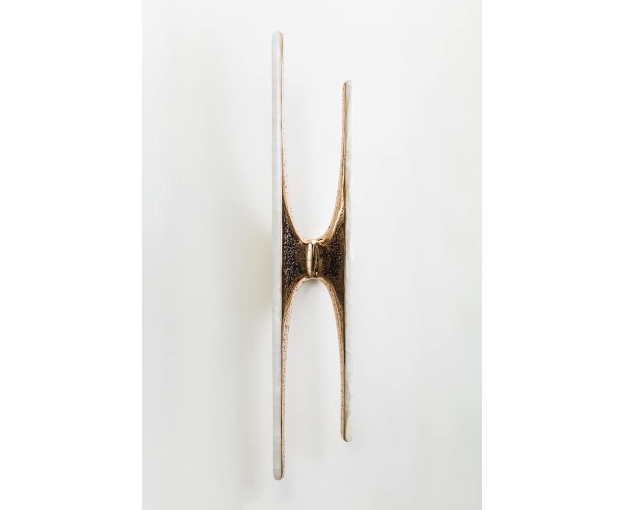 Вдохновленные природой и человеческими формами, бра и люстры серии Sculptural сделаны из бронзы или дерева асимметричной формы бабочки. Каждая вырезанная вручную форма покрыта белым ониксом, заключая в себя регулируемые светодиодные фонари, предлагая теплое, вечное свечение, поскольку светодиоды мягко излучают свет через камень.