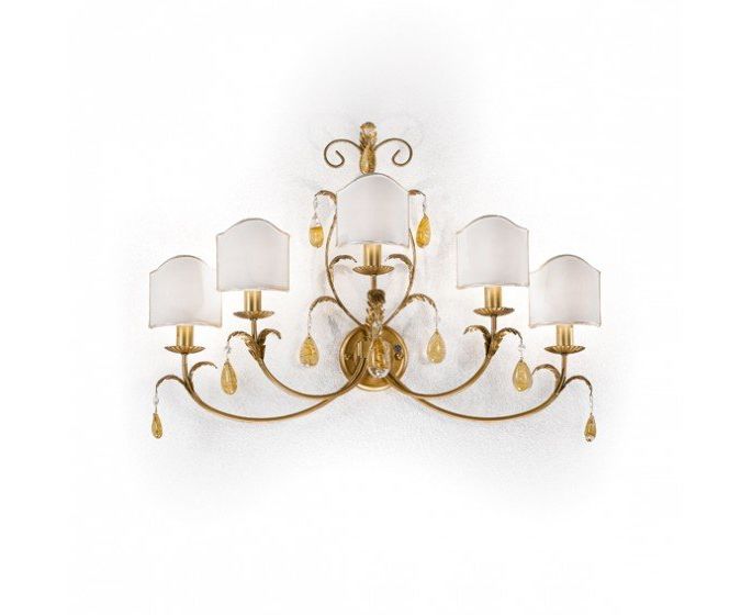 Коллекция создана из металла с листьями барокко, приваренными к простой раме, и дополненными прозрачными и янтарными каплями. Свет проникает более живописным образом благодаря зеркальной базе, которая отражает ее. Доступны также с тканевыми абажурами для версии настенного светильника.
