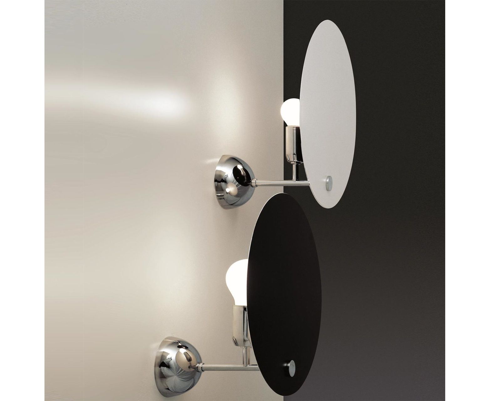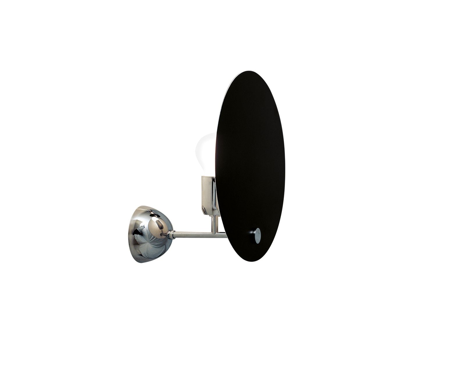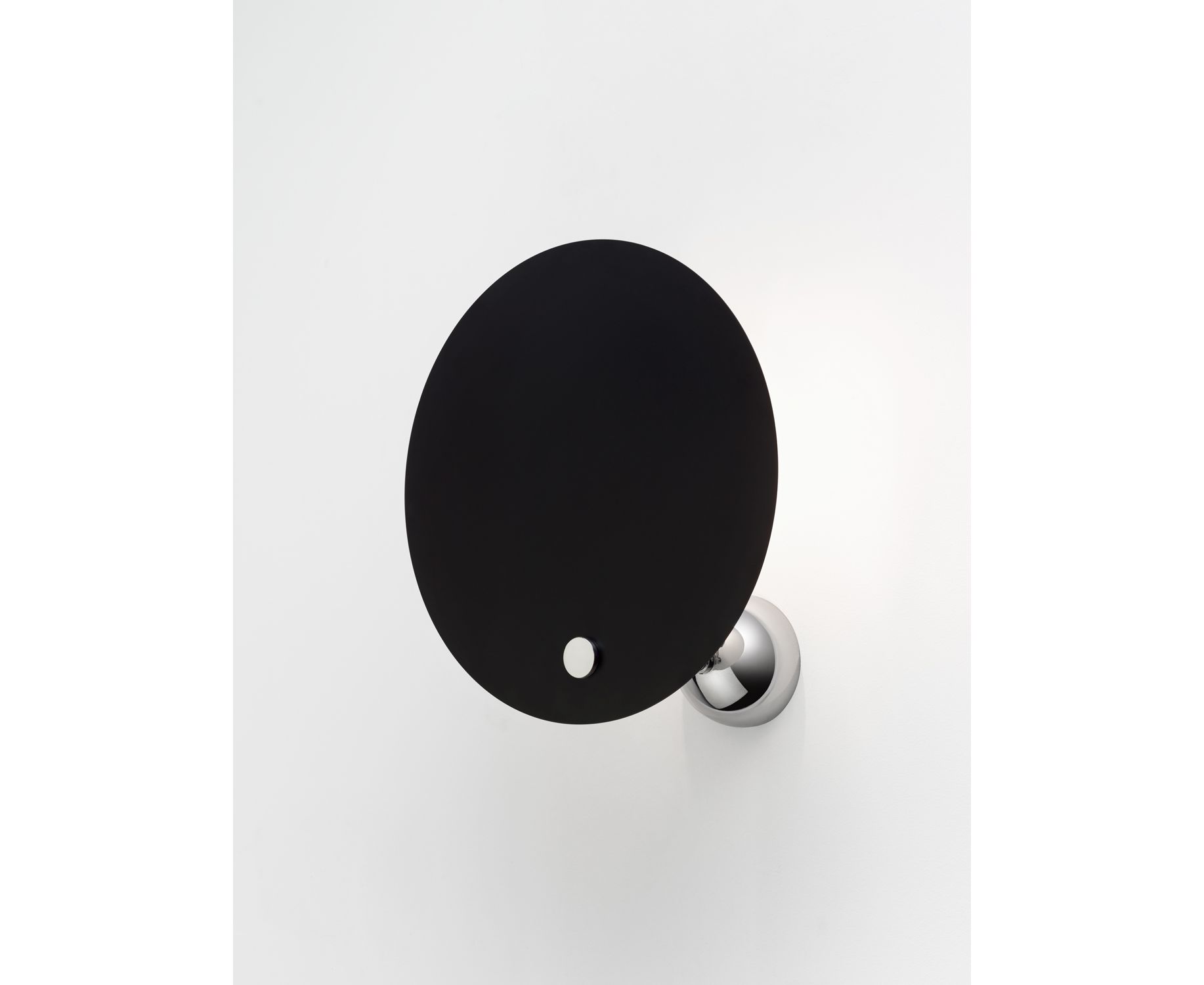Настенный светильник с круглым отражателем из алюминия, который экранирует распределение освещения, создавая эффект солнечного затмения. Круглый экран окрашен в белый и черный цвета, стебель и мелкие металлические детали и полусферическая опора хромированы.