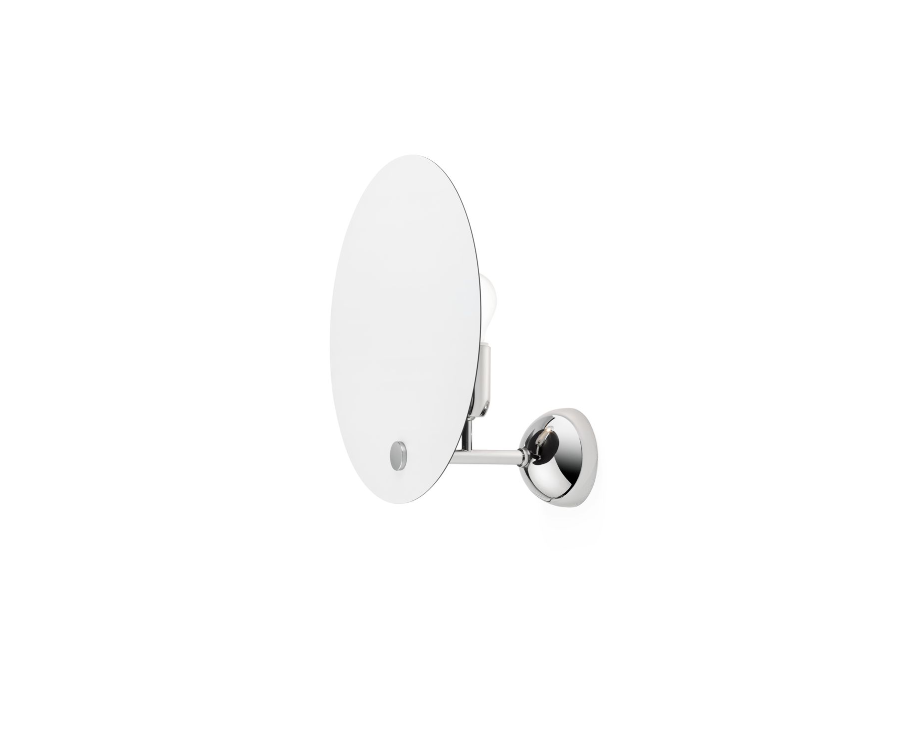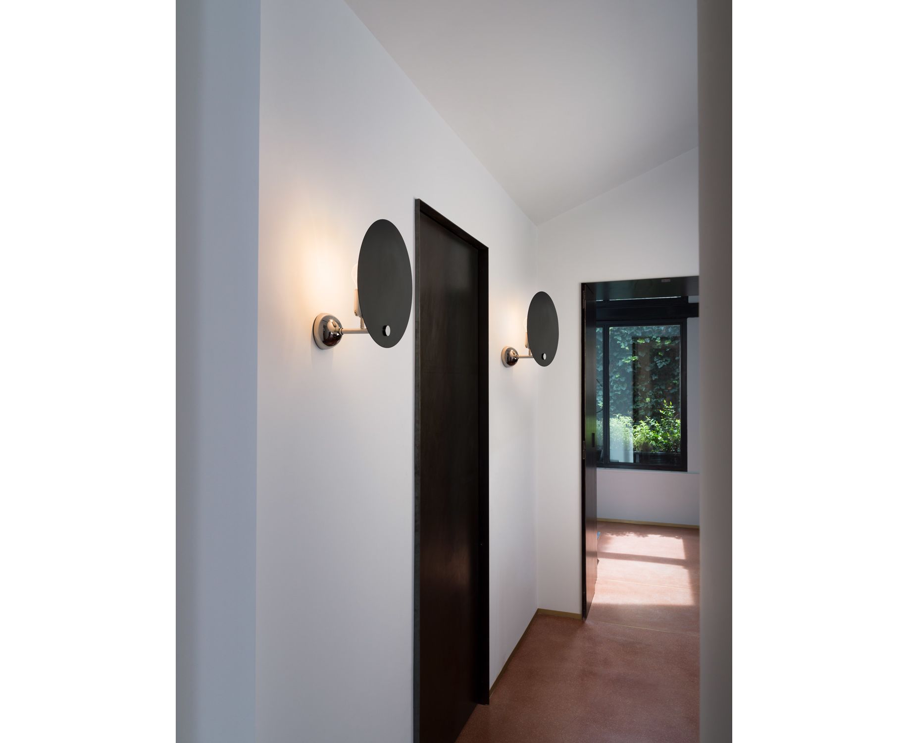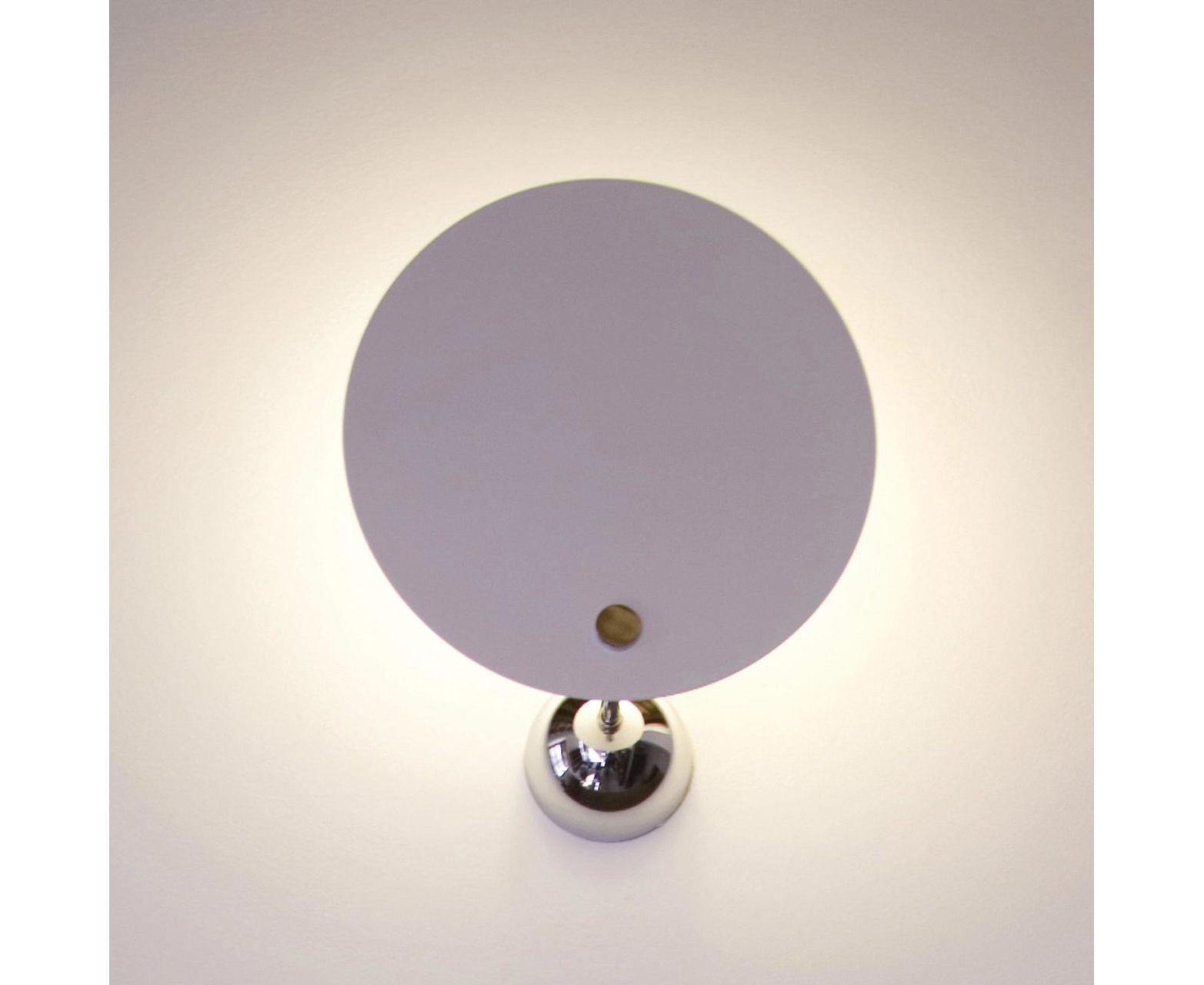 Настенный светильник с круглым отражателем из алюминия, который экранирует распределение освещения, создавая эффект солнечного затмения. Круглый экран окрашен в белый и черный цвета, стебель и мелкие металлические детали и полусферическая опора хромированы.