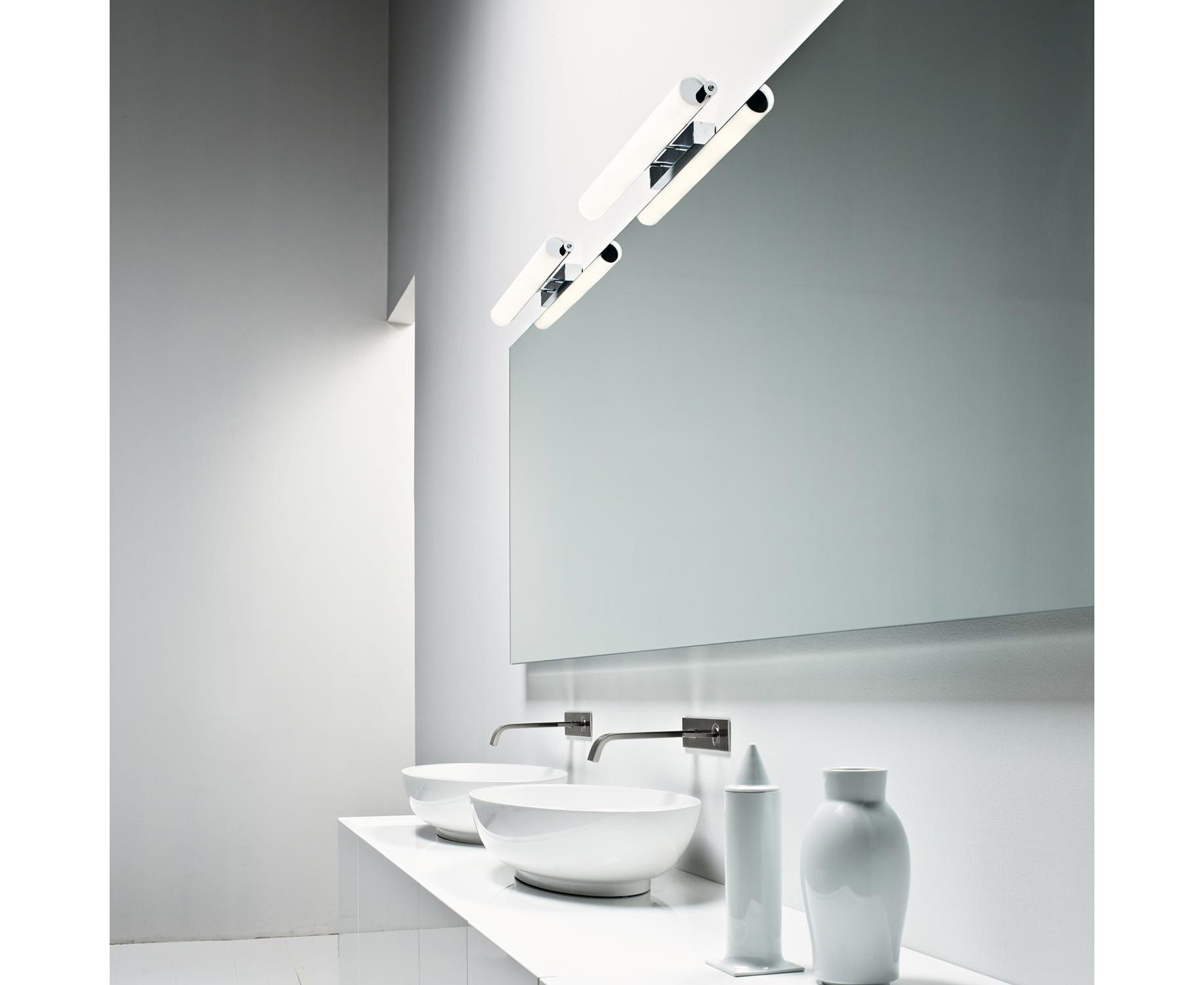 Светодиодные и галогенные настенные светильники с широко распространенным освещением. Трубный диффузор из стекла Pyrex пескоструйной обработки или из опалового метакрилата (LED), установленный на глянцевой полированной алюминиевой конструкции.