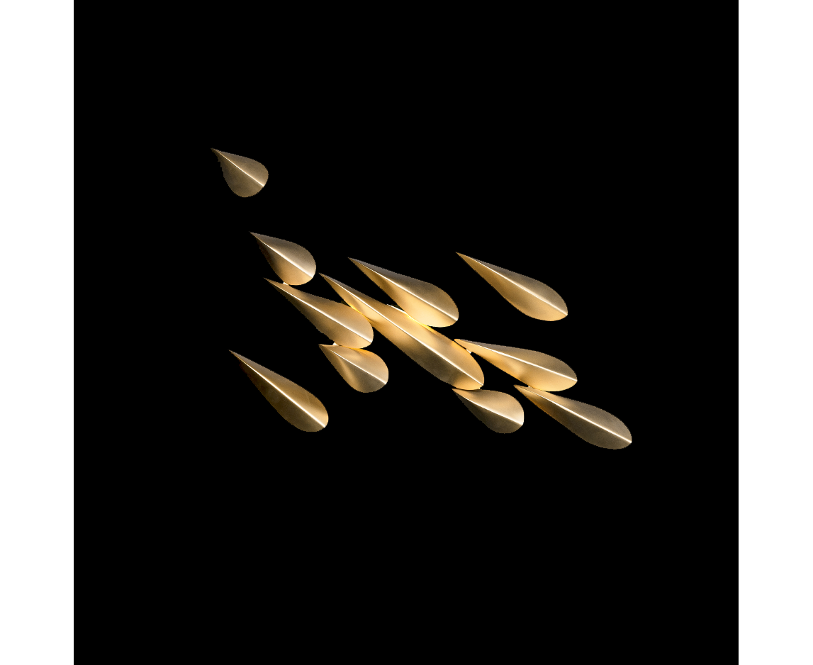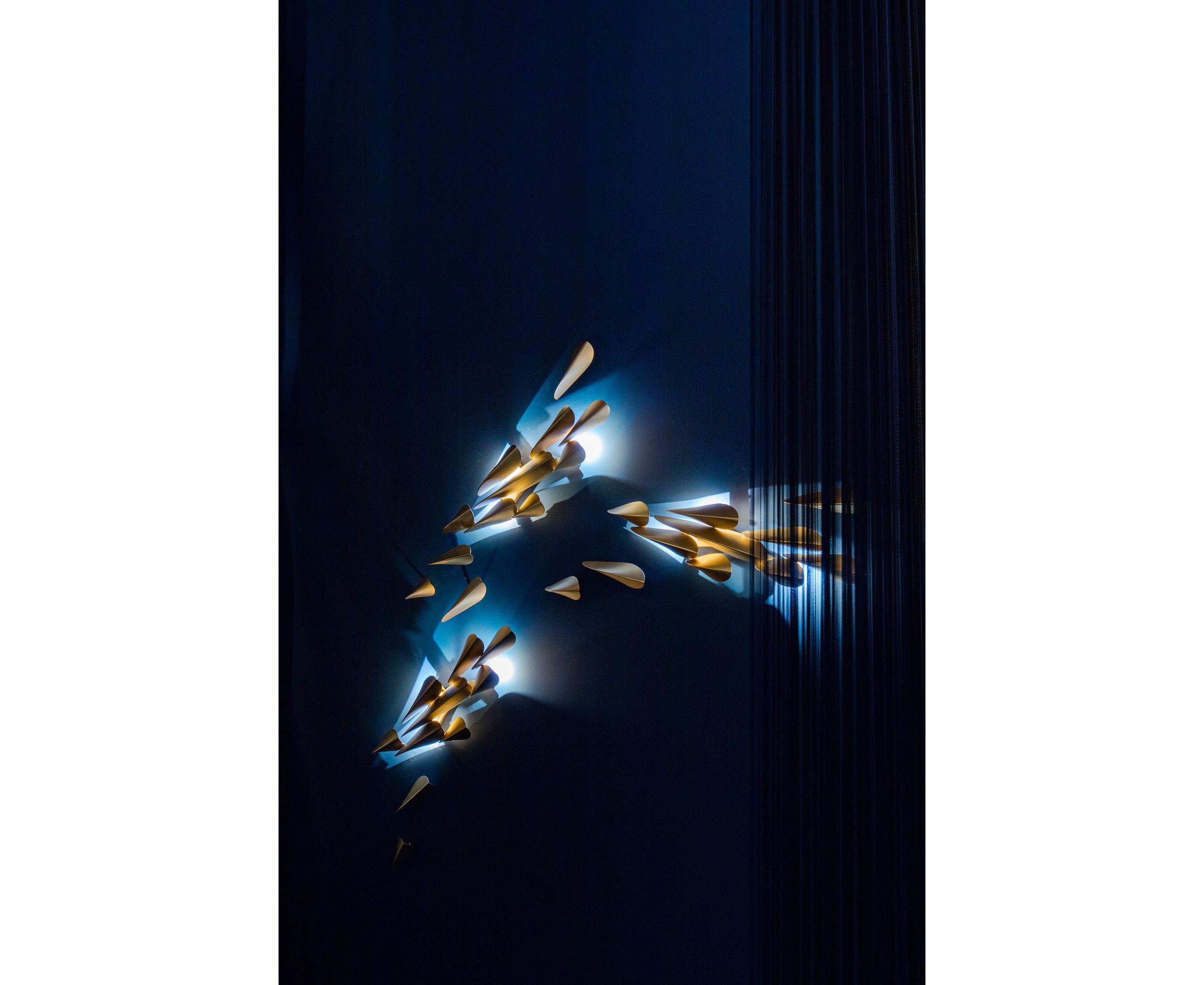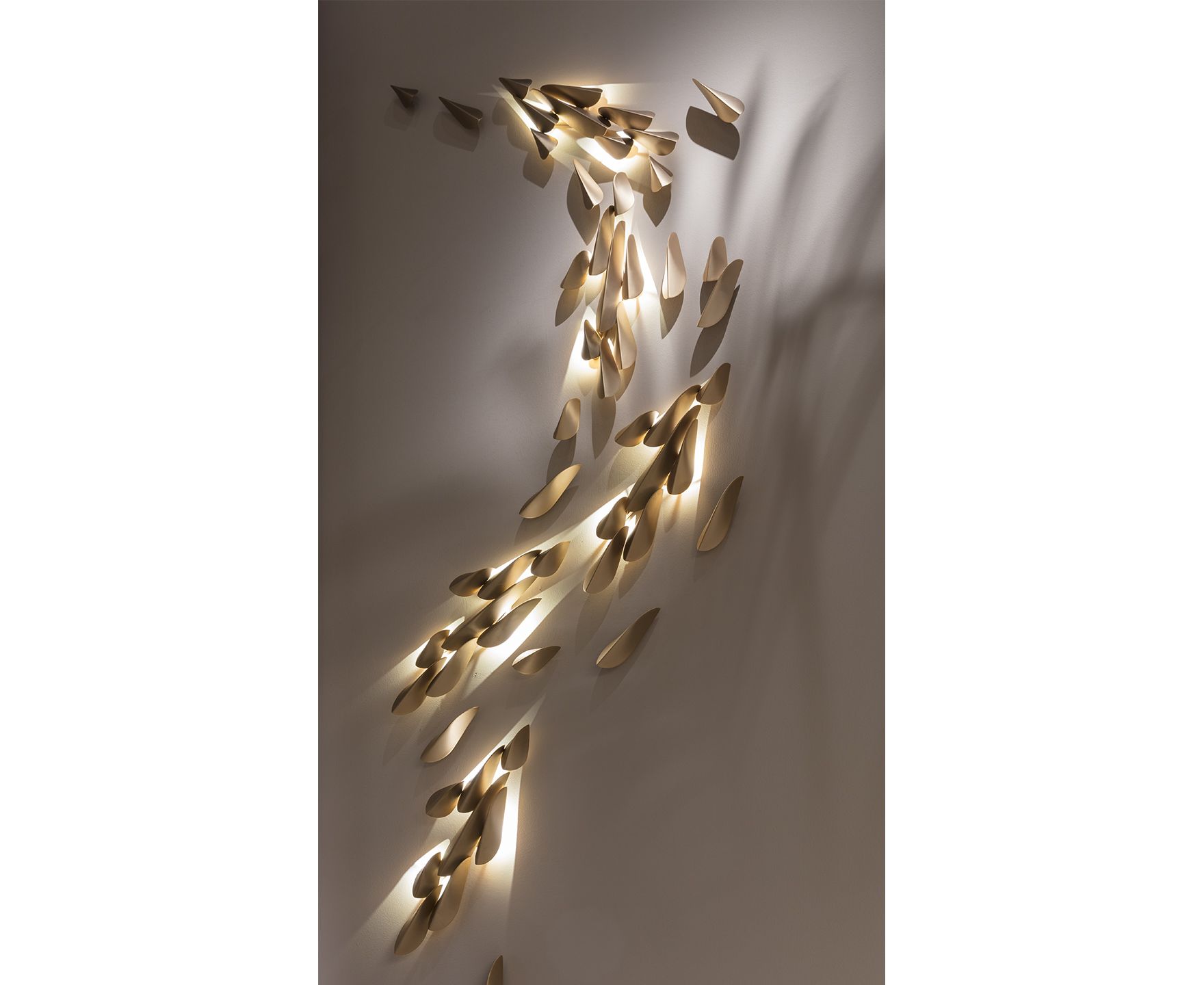 Anodine Wall - это изысканный настенный светильник, который преобразует свет в картину, отражающую концепцию «формы, не формы» света, которая добавляет художественную атмосферу в интерьер. Он состоит из 11 блестящих металлических листов, все они асимметричны и сделаны вручную опытными мастерами с гальваническим покрытием из матового золота. В фиксированном восьмиэлементном модуле три листа освещаются светодиодом 2 Вт каждый. Композиция состоит из 3 отдельных элементов, которые устанавливаются по выбору для создания бесконечных комбинаций. Благодаря ручным технологиям изготовления, каждая часть коллекции уникальна.