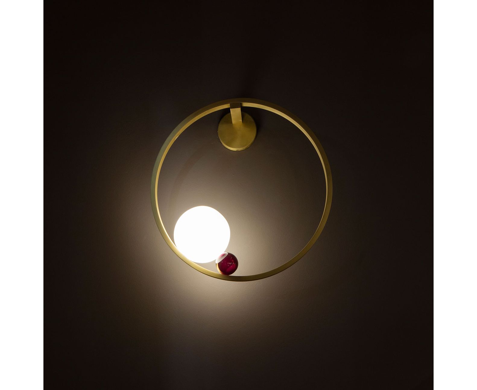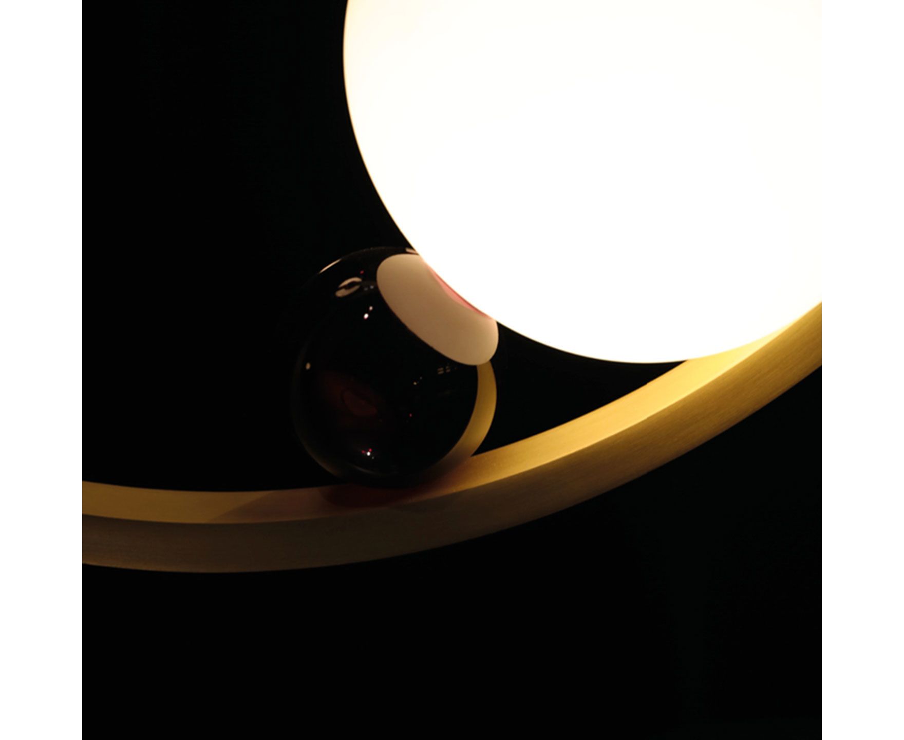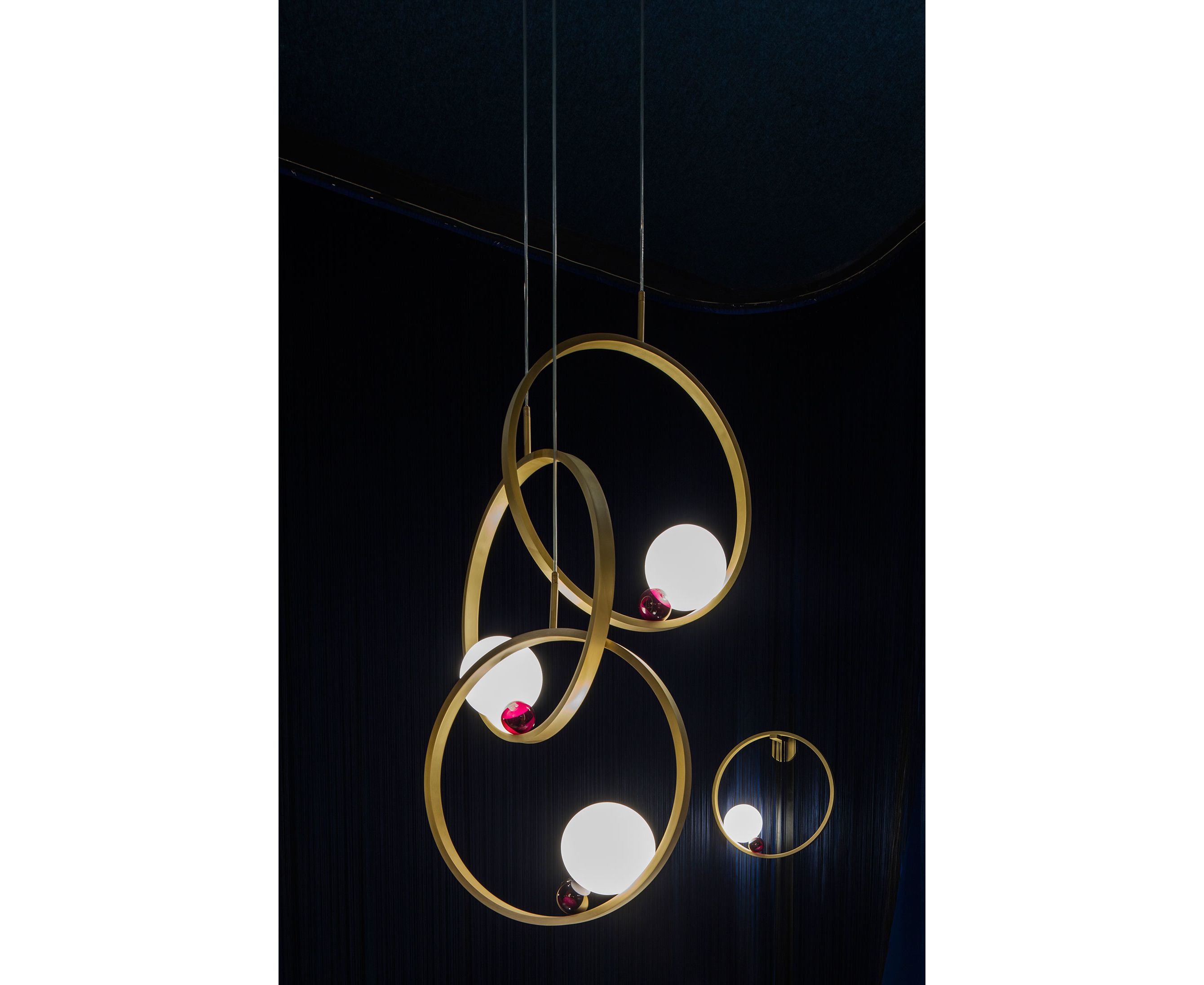 Композиция Joy родилась из идеи придания формы свету. Лампа состоит из трех латунных колец с переменной высотой и сфер из выдувного белого атласного стекла (большая сфера) и розового прозрачного (маленькая сфера), магически подвешенного в тонкой металлической структуре. Игра круговых масс и траекторий создает сбалансированный дизайн гравитационной динамики. Свет от сферы рассеивается в окружающем пространстве, освещая раму. Отражения латуни делают световое поле видимым по его ауре. Доступные версии: одна осветительная лампа и настенная версия.