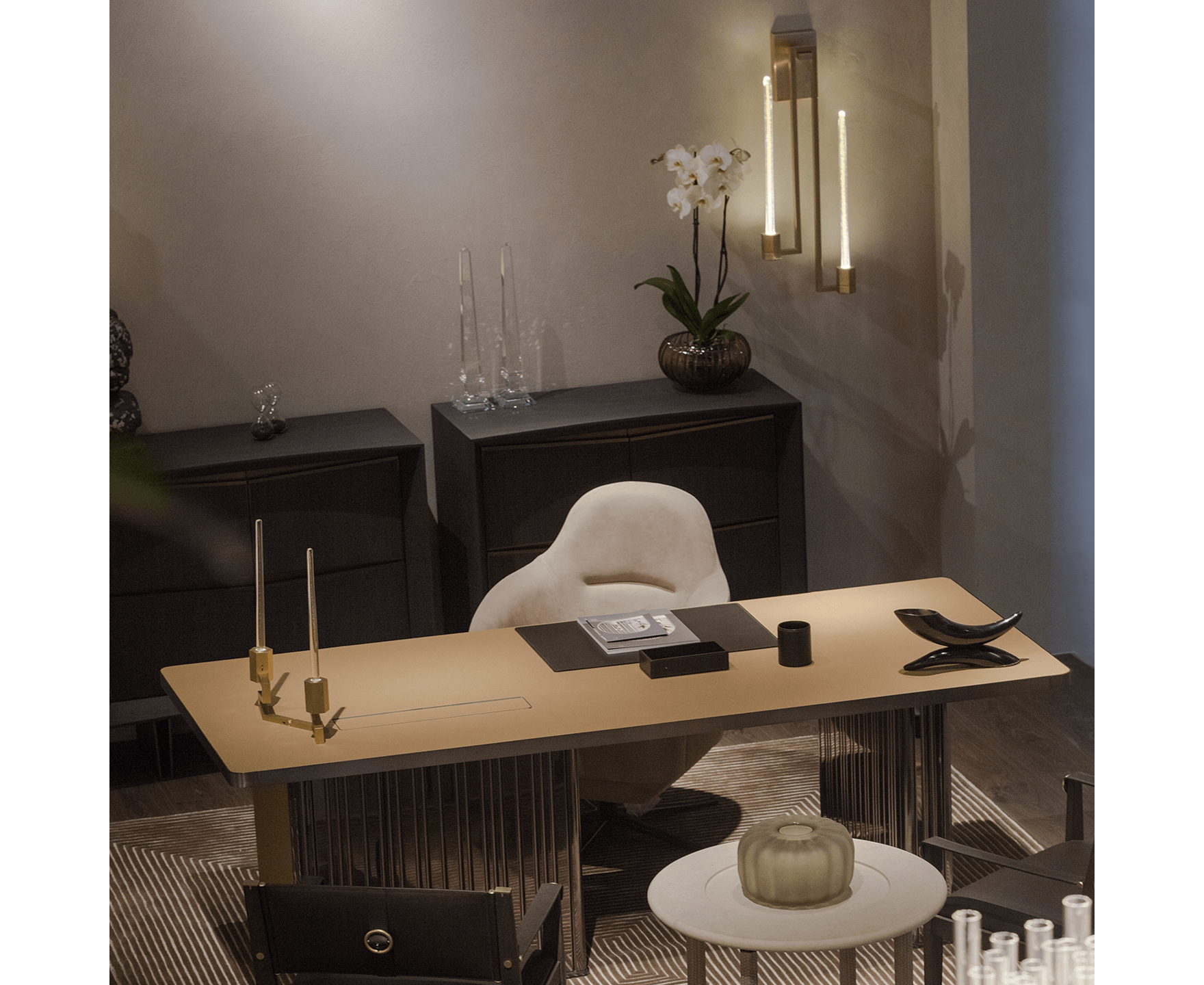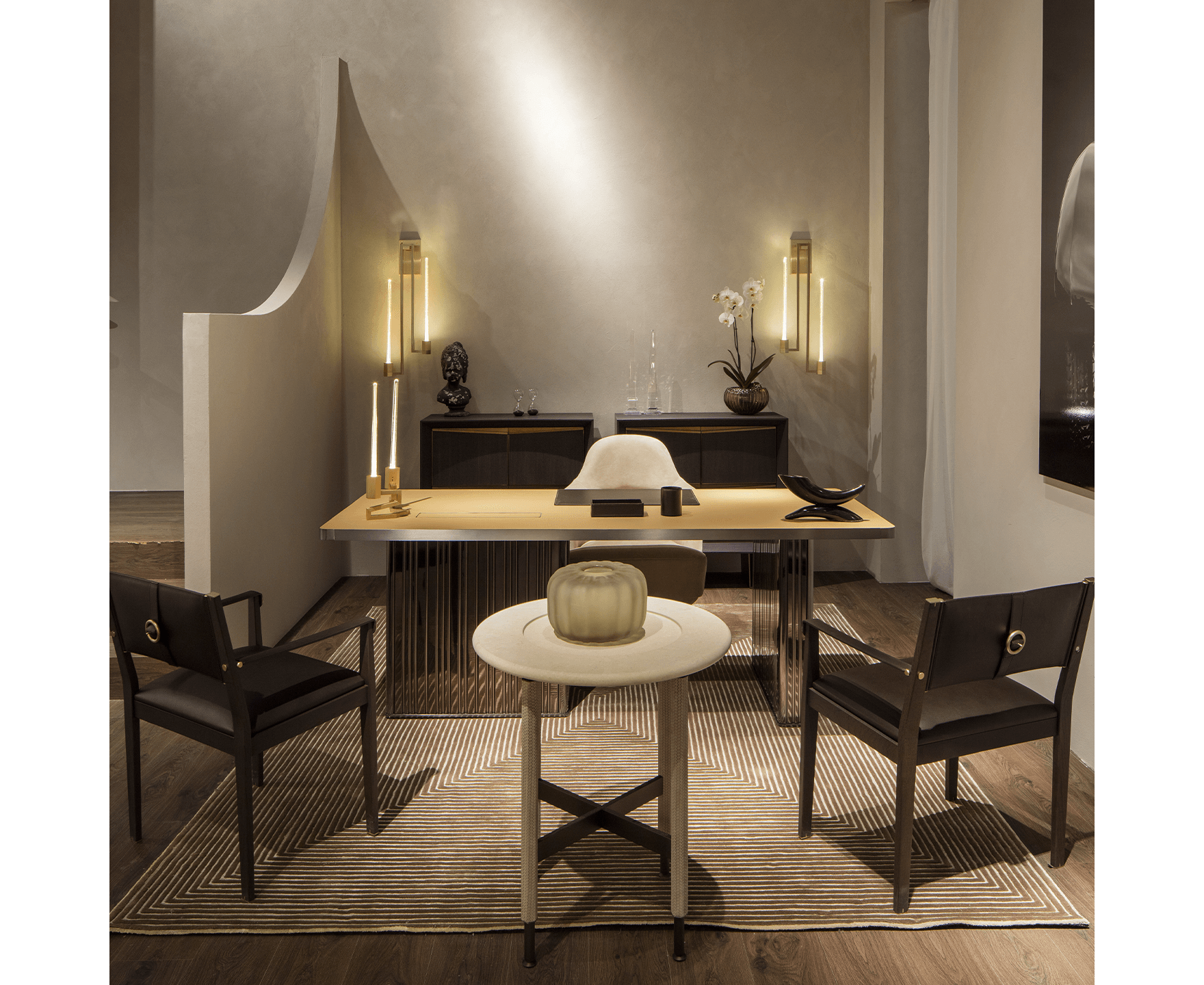 Kalì является результатом ремесленного мастерства, полностью сделанного на острове Мурано. Настенная версия Kalì также является частью этой коллекции. Она сделана с медными элементами с отделкой из матового золота, имеющей два элемента из муранского стекла с 24-каратным золотым листом.