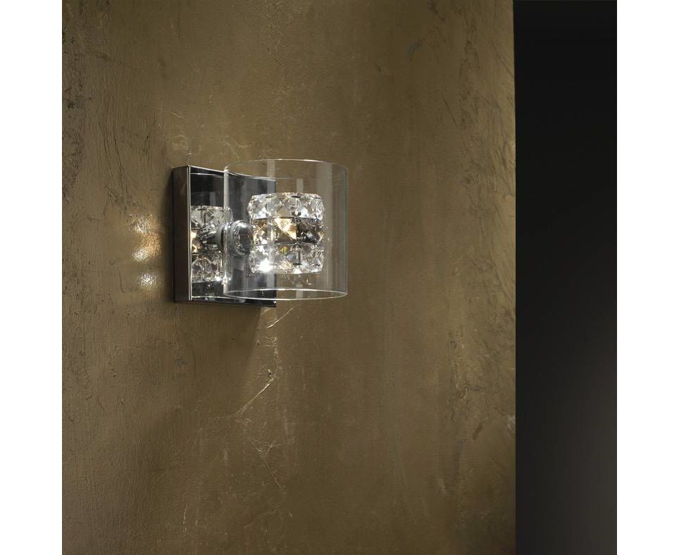 Настенный светильник из металла с 1 лампой, с покрытием "блестящий хром", двойной плафон: внешний - из прессованного стекла и внутренний - из кристаллов из прозрачного и дымчатого гранёного стекла