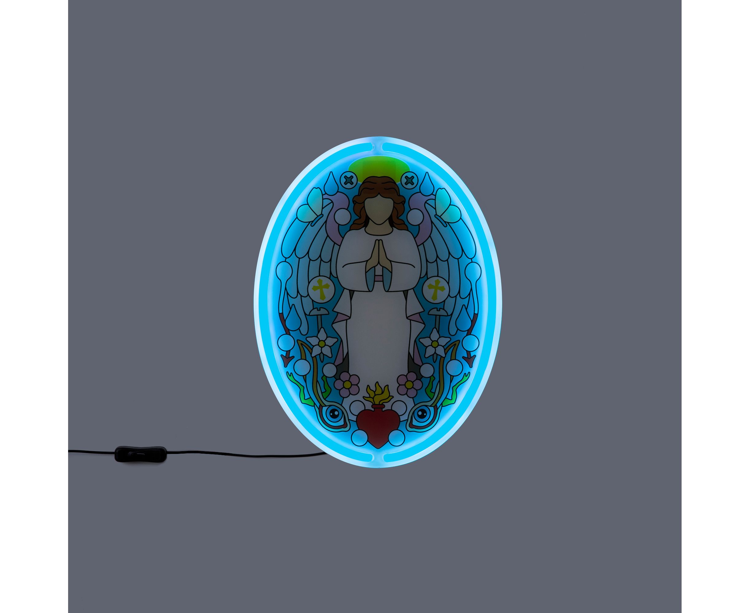 Ангел Гавриил, Дева Мария и Иисус на кресте становятся чередой святых неоновых огней, готовых наполнить вашу жизнь божественным сиянием. Получите свою ежедневную дозу библейского фанка!