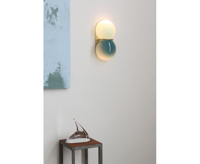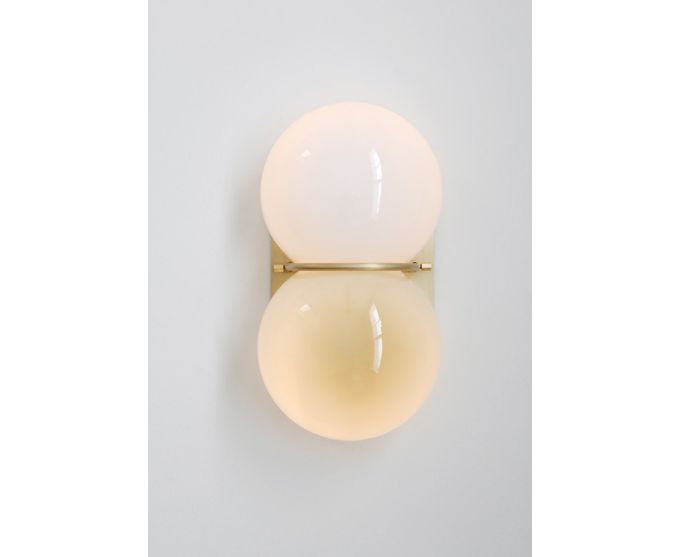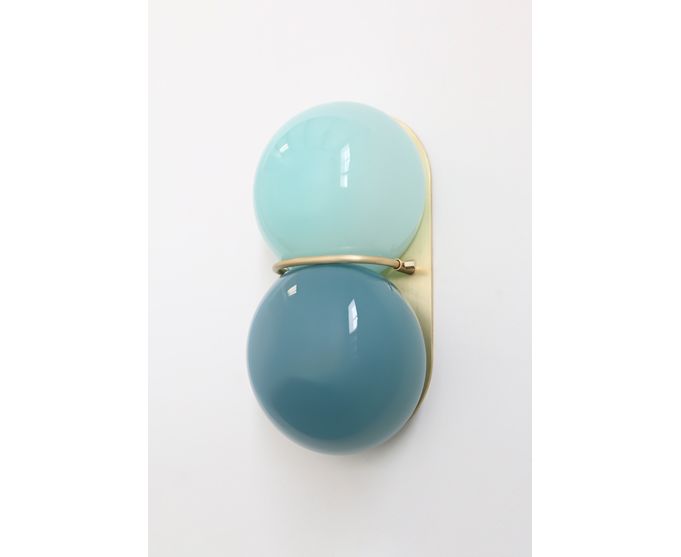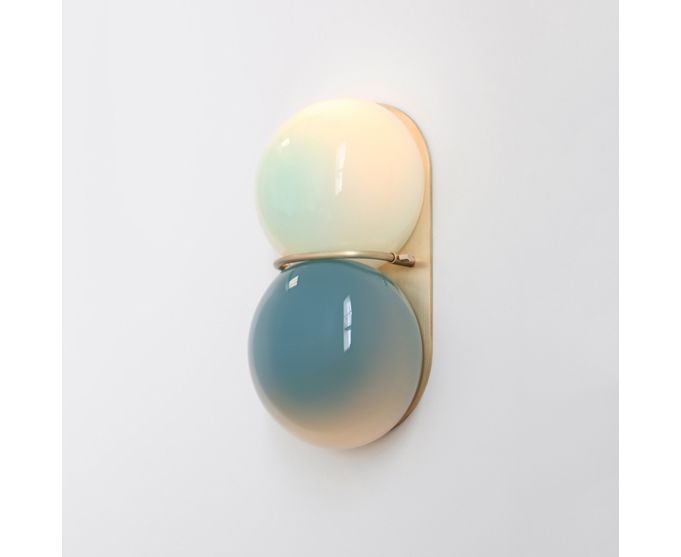 SkLO twin sconce - это выдувной стеклянный диффузор, состоящий из двух сплюснутых сферических фигур в двух цветах (один белый, один не совсем белый), которые при нагревании на трубах стеклодува смешиваются друг с другом. Каждая сфера освещена изнутри двумя лампочками, по одной в каждой сфере. Стакан крепится к навесу из цельной латунной пластины с помощью медной ленты, которая находится между двумя сферами. Латунный навес доступен в двух разных версиях: плоский и поднятый.