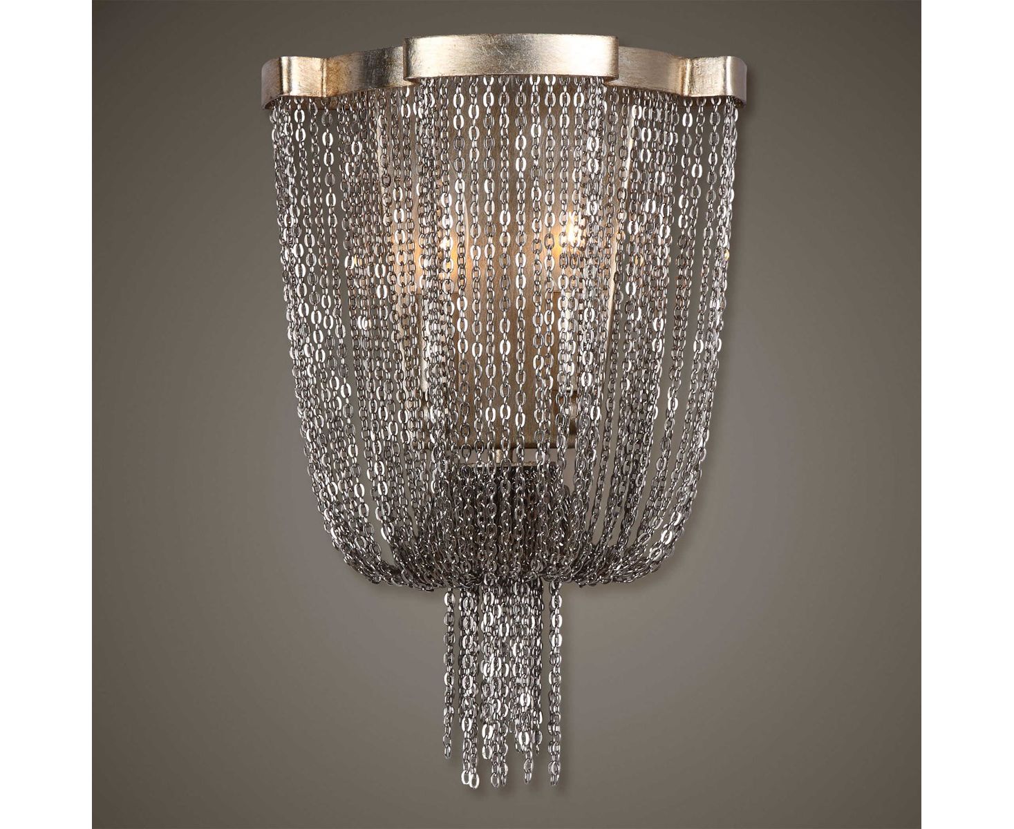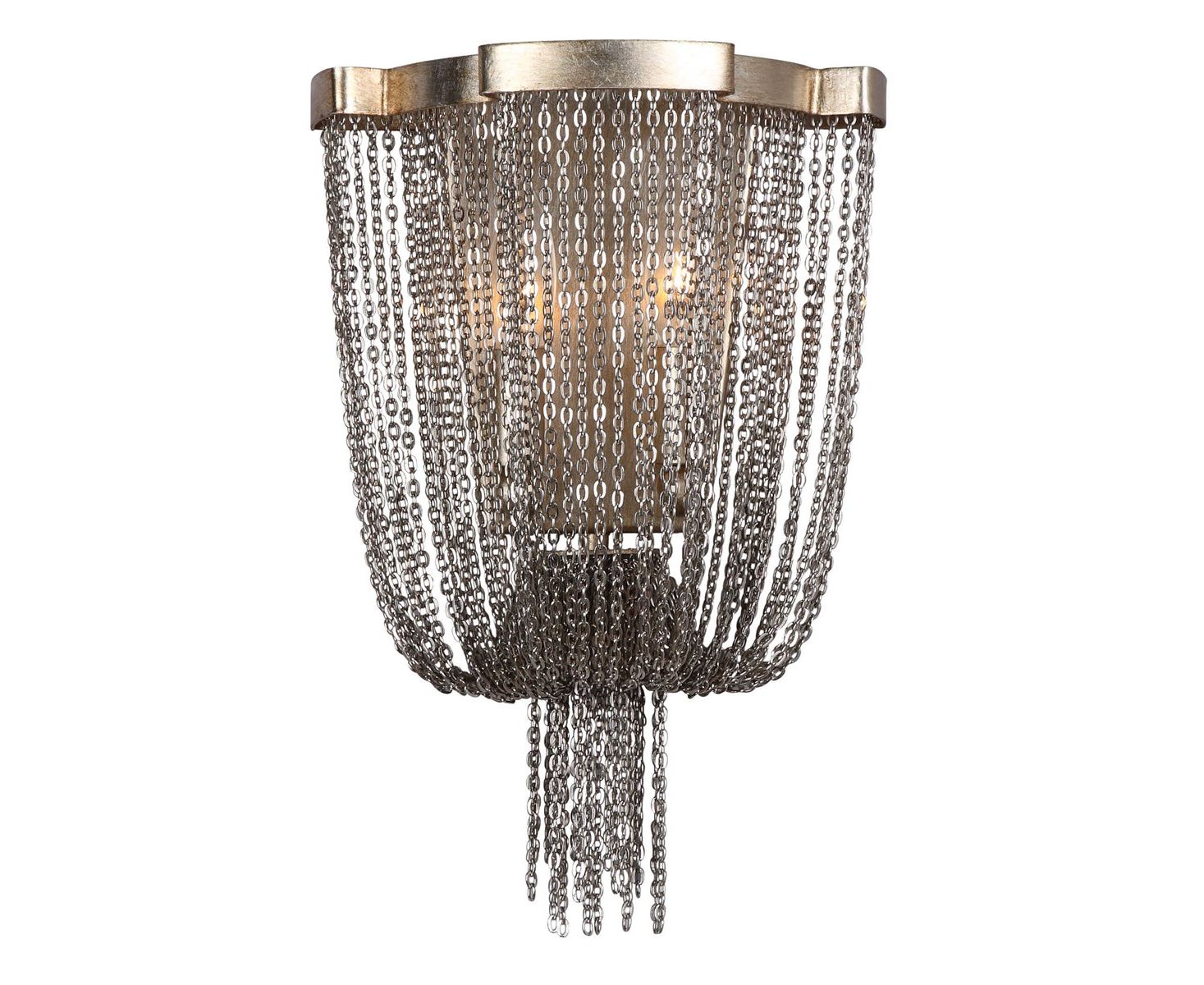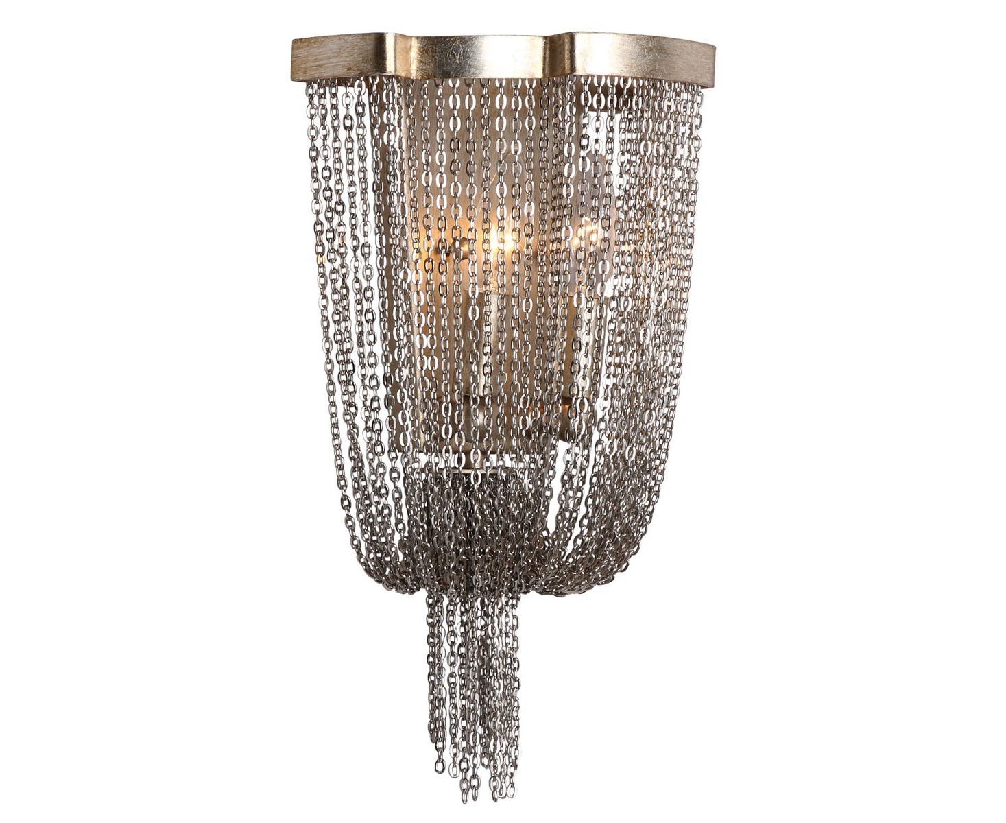 Богатая отделка темного античного серебряного листа с каскадами из полированных никелевых ювелирных цепочек сгибается в нижней корзине этого бра.