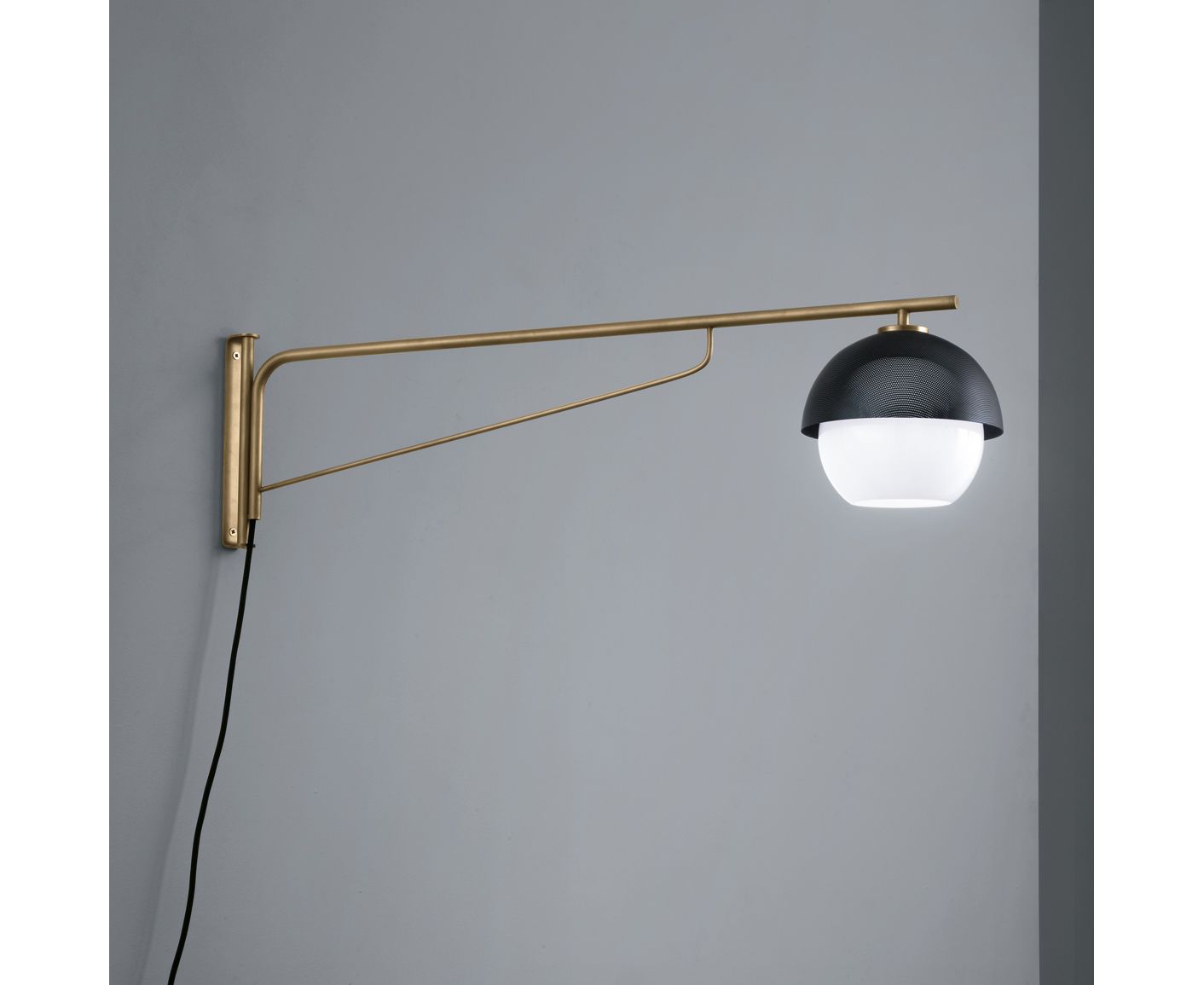 Настенный светильник с регулируемым кронштейном. Его светлая или темная полированная латунная структура идеально подходит для различного использования. Элегантный металлический микроперфорированный абажур, доступный в двух цветах, смягчает яркость диффузора из выдувного стекла.