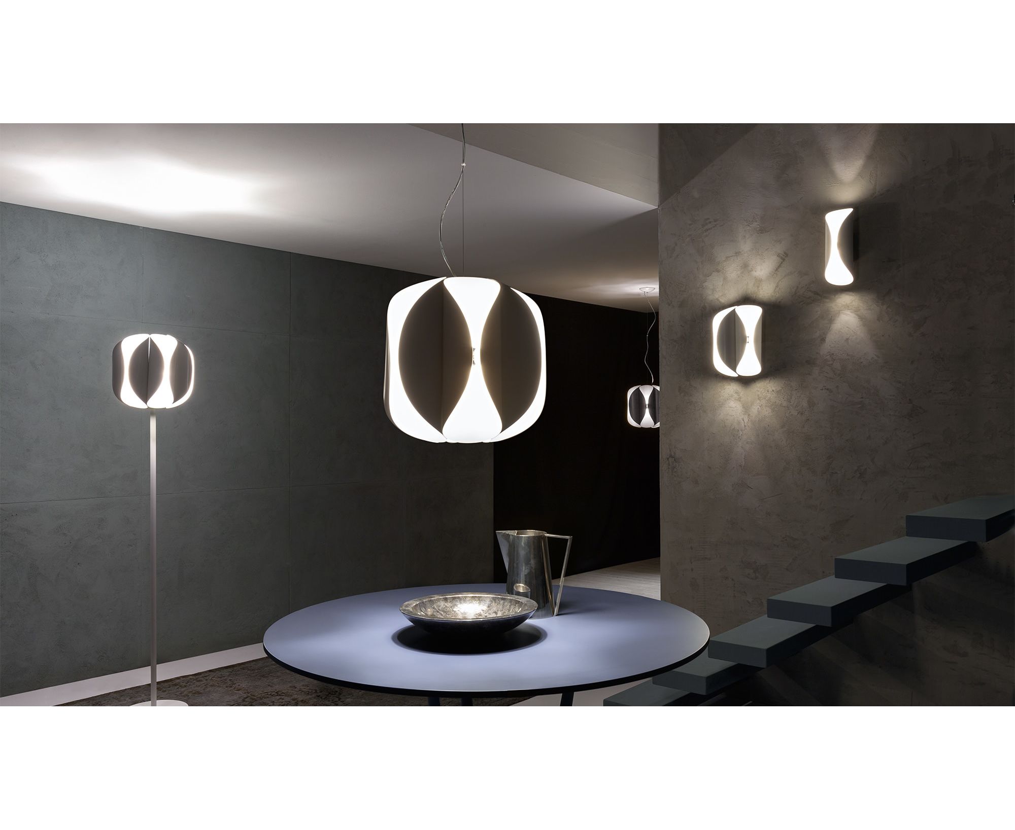 Коллекция светильников в винтажном стиле, состоящая из изогнутых алюминиевых элементов. Каждый элемент содержит лампочку E14, которая создает отраженный и непрямой свет. Свет внутри каждого изогнутого элемента, преломляясь с внешней его частью, производит особый эффект свет-тень. В коллекцию входят: подвесной, настенный 1л и 2л светильники, торшер.