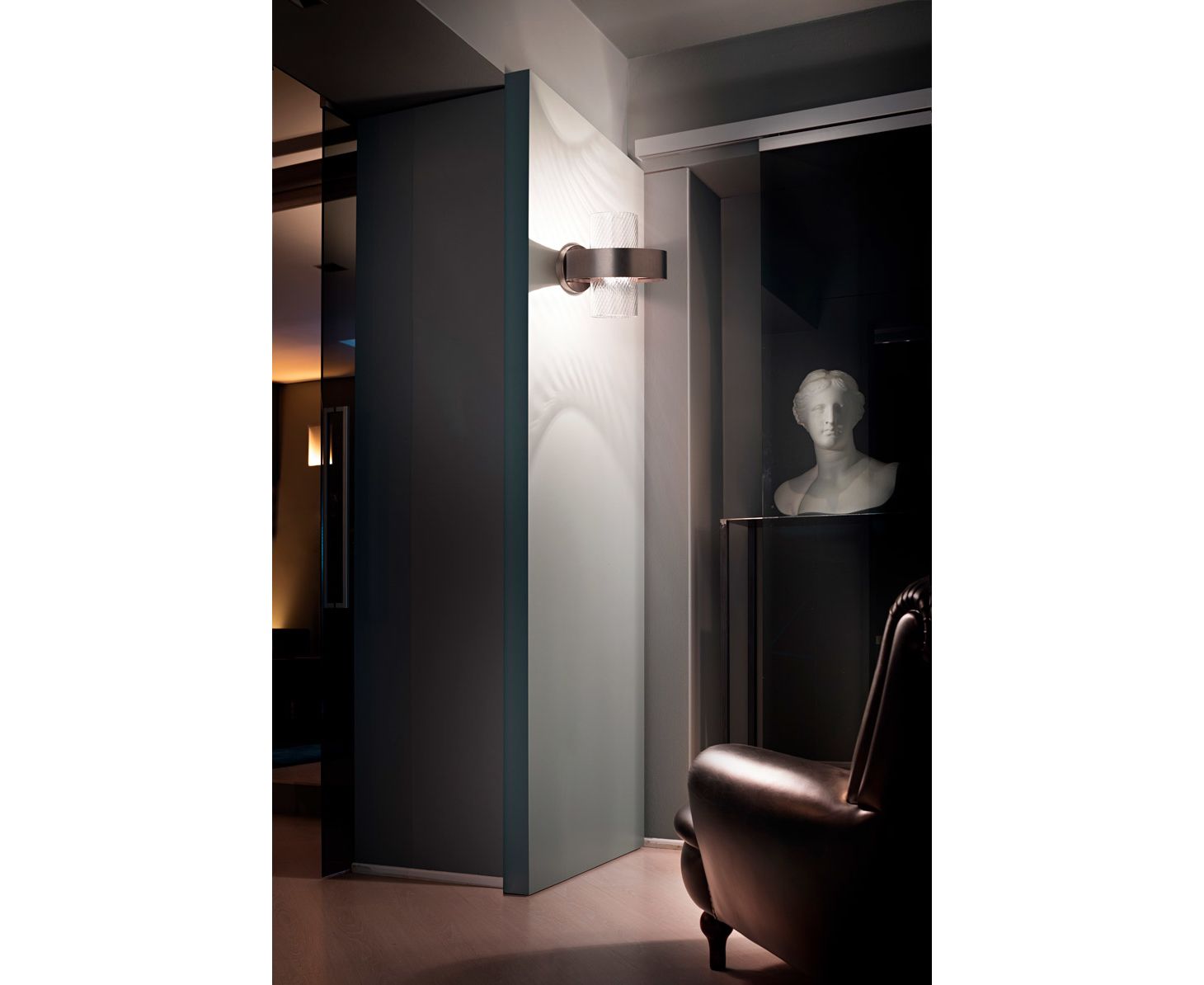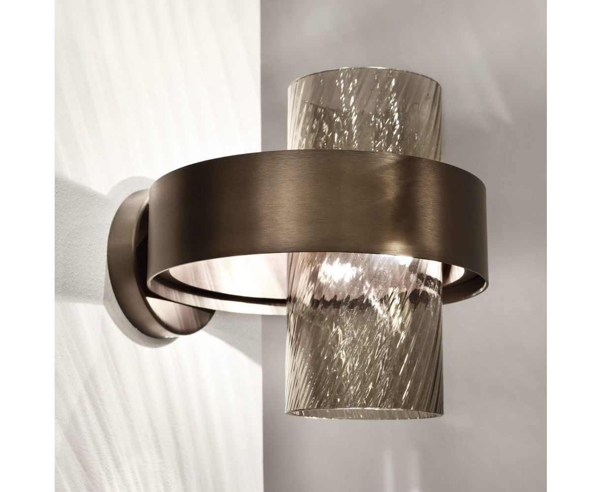 Игры металлических окружностей вокруг стеклянных цилиндров, как будто для создания бесконечных колец. Коллекция с современными коннотациями и светодиодным источником, которая содержит ценные исторические черты: обработки стекла, такие как баллоттон и прямой и витой ригадин, все изящно обработанные теплыми тонами хрусталя, дыма, янтаря и легкого аметиста.