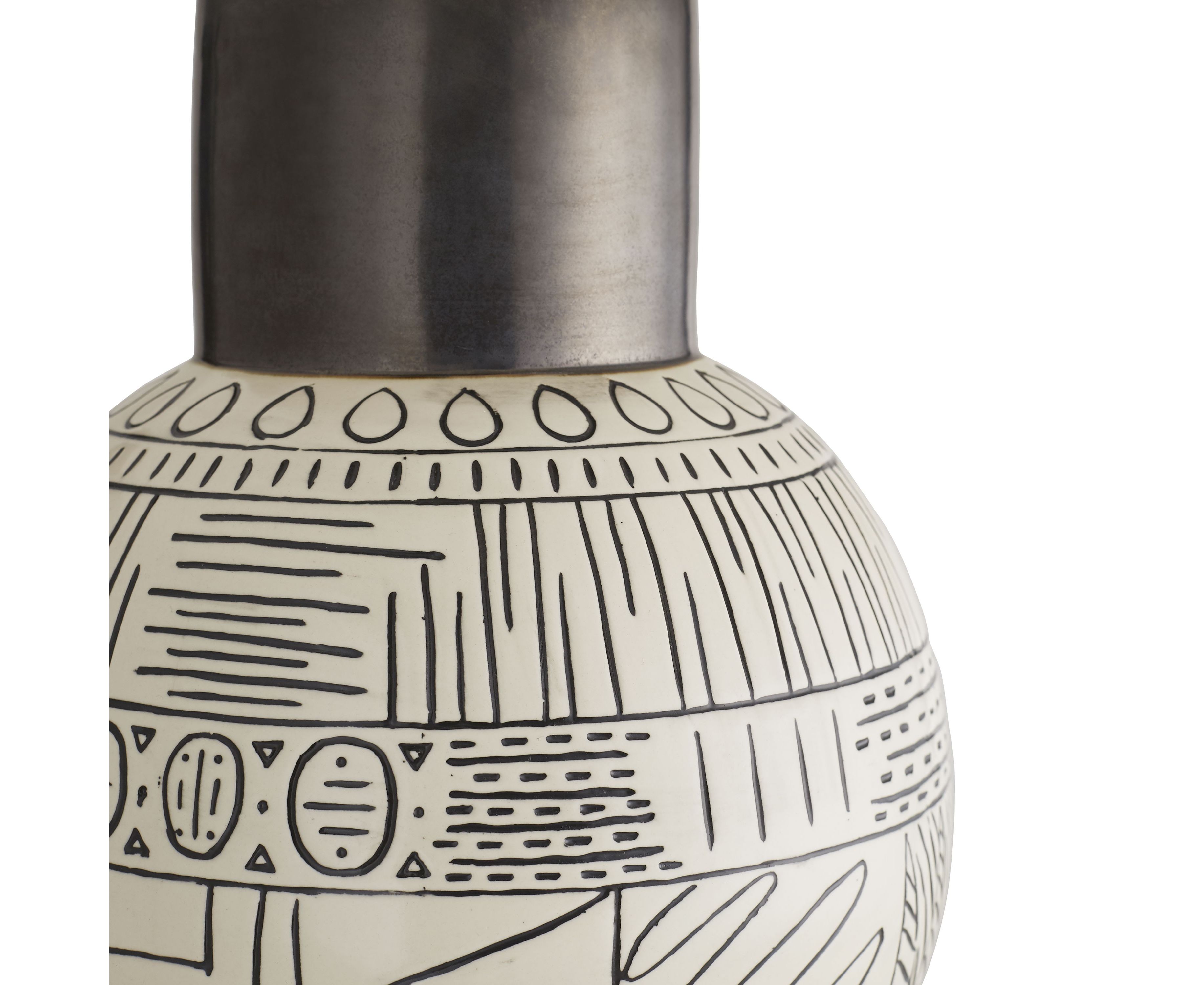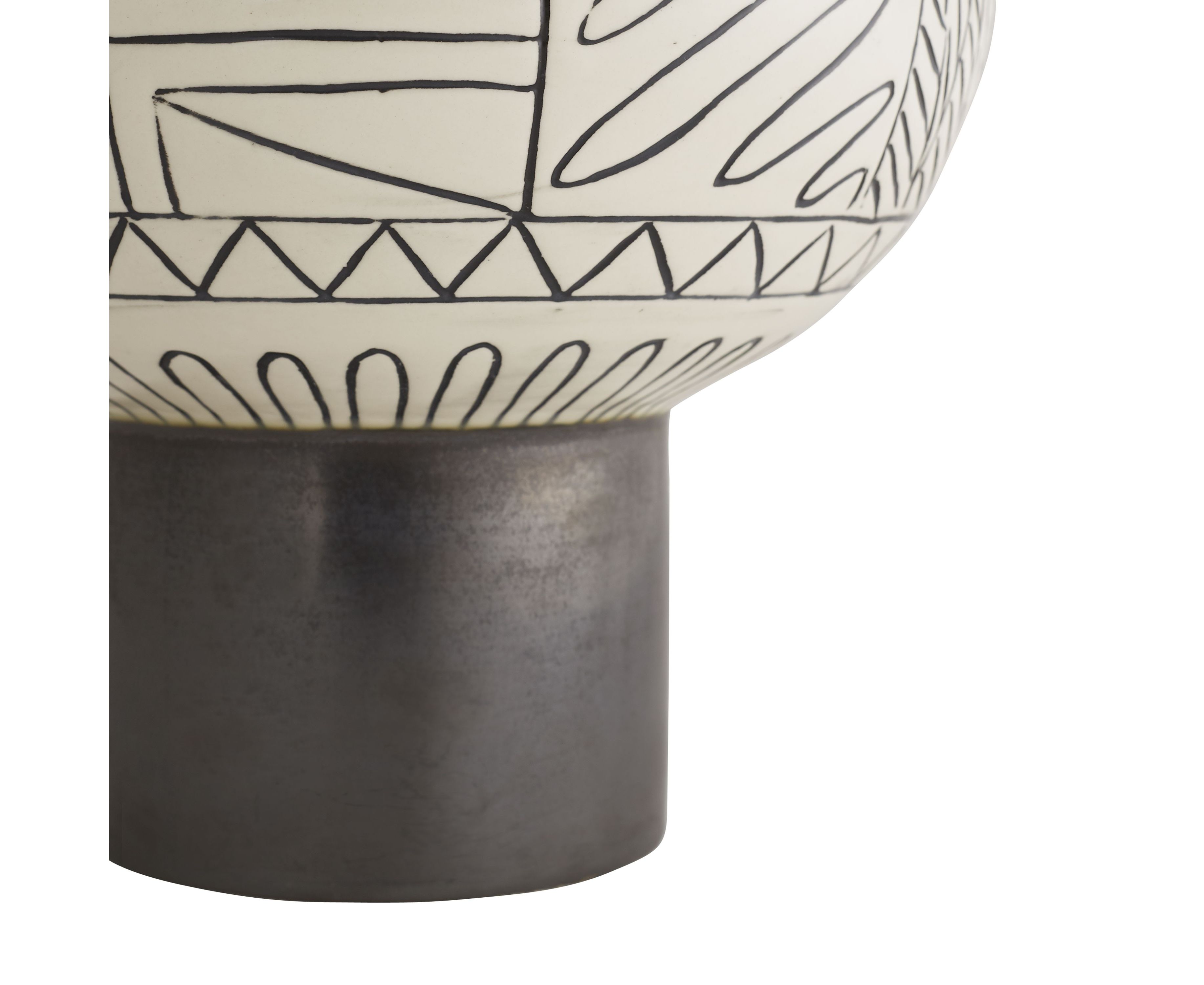 Мизансцены для любой обстановки, эта лампа имеет племенной узор в виде подвесной шаровидной формы. Используя гончарную технику, называемую сграффито, дизайн сначала нацарапывают вручную на керамическую поверхность, а затем раскрашивают вручную, чтобы подчеркнуть сложность деталей ручной работы. Покрыт не совсем белым хлопковым абажуром-барабаном с не совсем белой хлопковой подкладкой. Отделка может отличаться.
