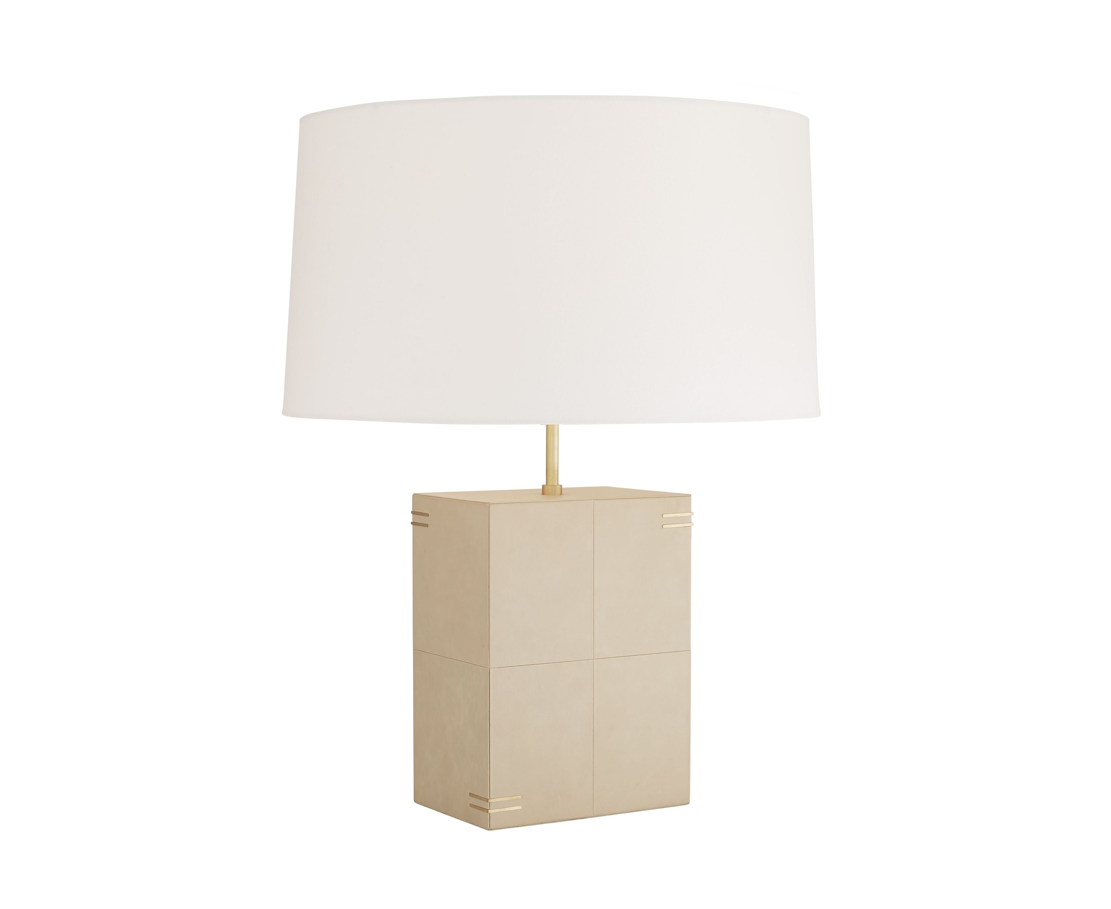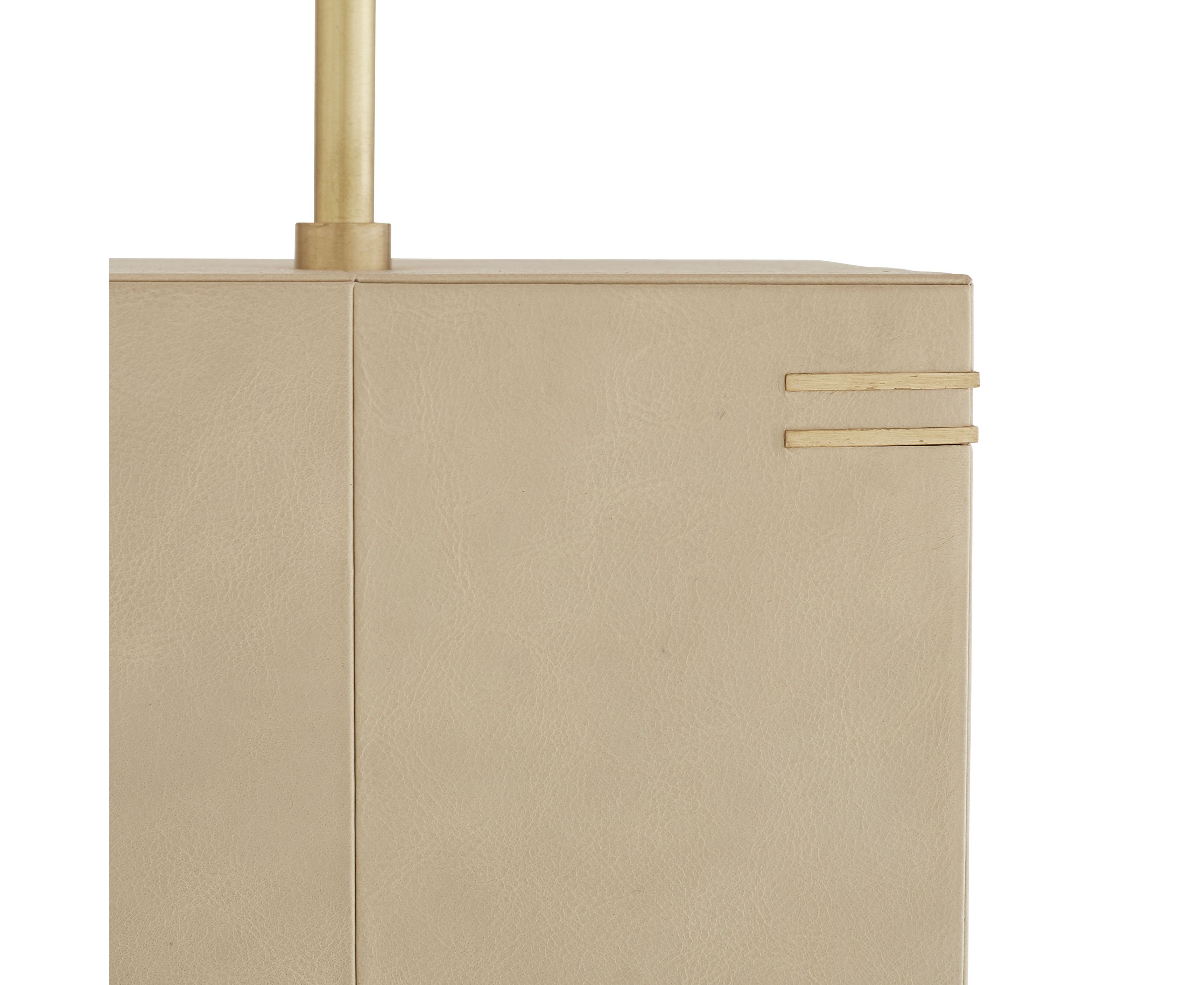 Фуллертон: классический по форме и современный по дизайну. Эта лампа модернизирована с бежевым кожаным основанием и подчеркнута сложными деталями ее открытых швов и тонкими античными медными акцентами. Удлиненная античная латунная горловина покрыта белым льняным абажуром с белой хлопчатобумажной подкладкой и соответствующим античным латунным украшением. Модный и слегка мужской дизайн для любого стиля. Отделка может отличаться.