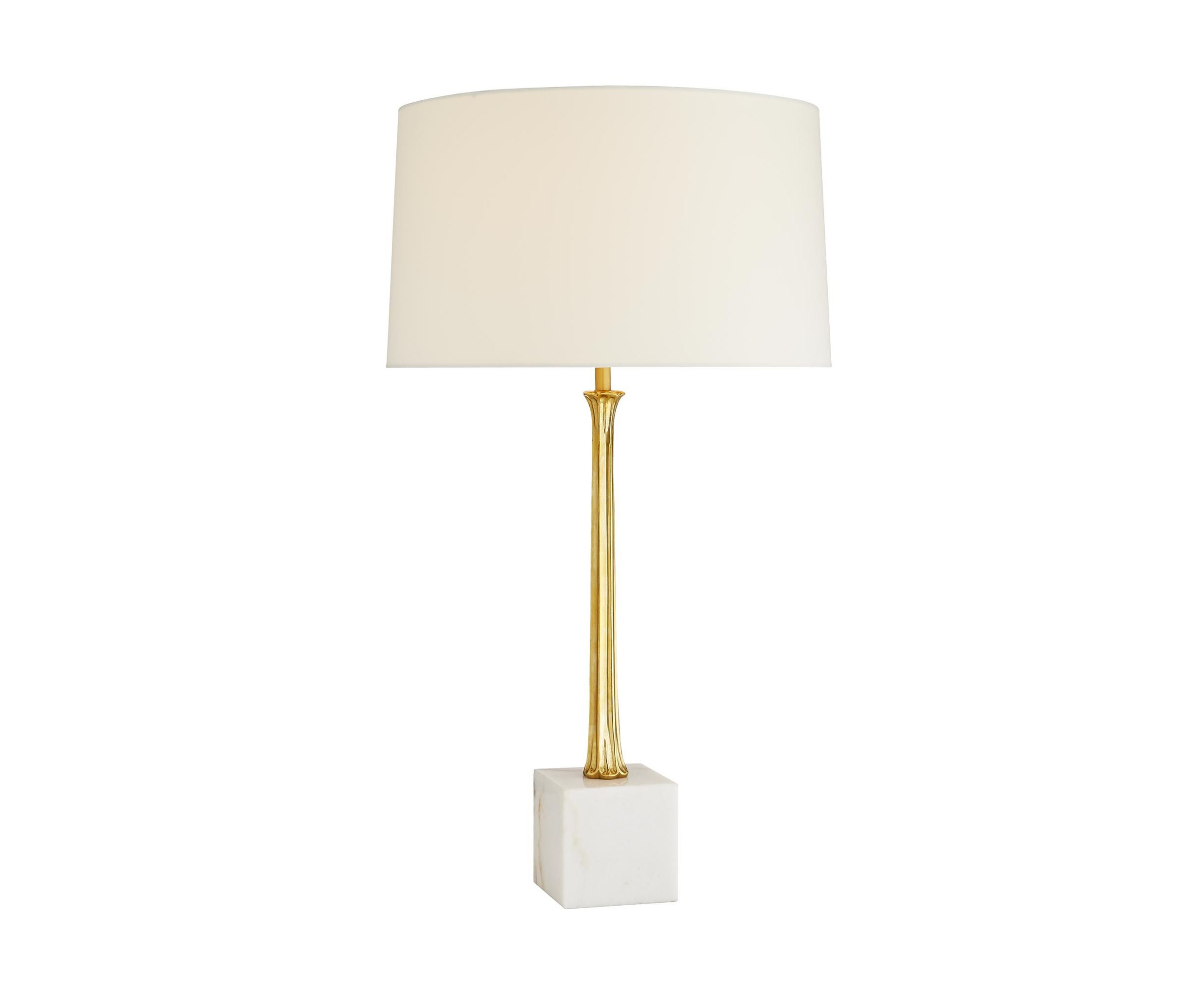 Элементы прекрасного освещения приобретены в этом единственном экземпляре. Простая полированная латунная форма выходит на сцену из полированной белой мраморной основы со скошенной кромкой. Силуэт подсвечника украшен мелкими фактурными деталями, напоминающими старинный французский дизайн. Отличное дополнение к традиционным настройкам. Покрыта абажуром из микрофибры и подходящим металлическим наконечником.