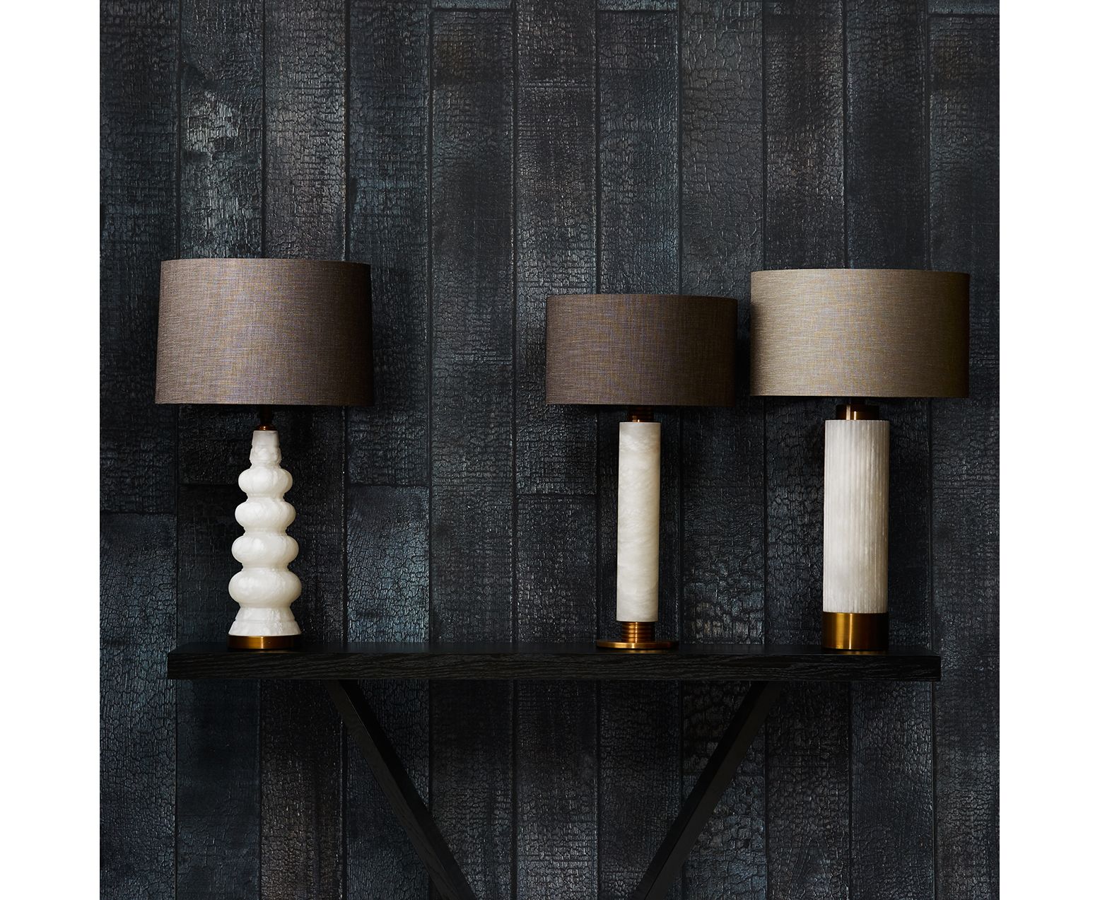 Диапазон ламп Алабстер черпает вдохновение из драматических, смелых форм египетской и греческой архитектуры. Сам камень создает тонкую палитру каскадных тонов слоновой кости. Естественная прозрачность создает эфирную глубину, в то время как тонкий натуральный блеск предлагает роскошную тактильность. Естественный рисунок создает уникальные предметы, которые отмечают органическую красоту материала.