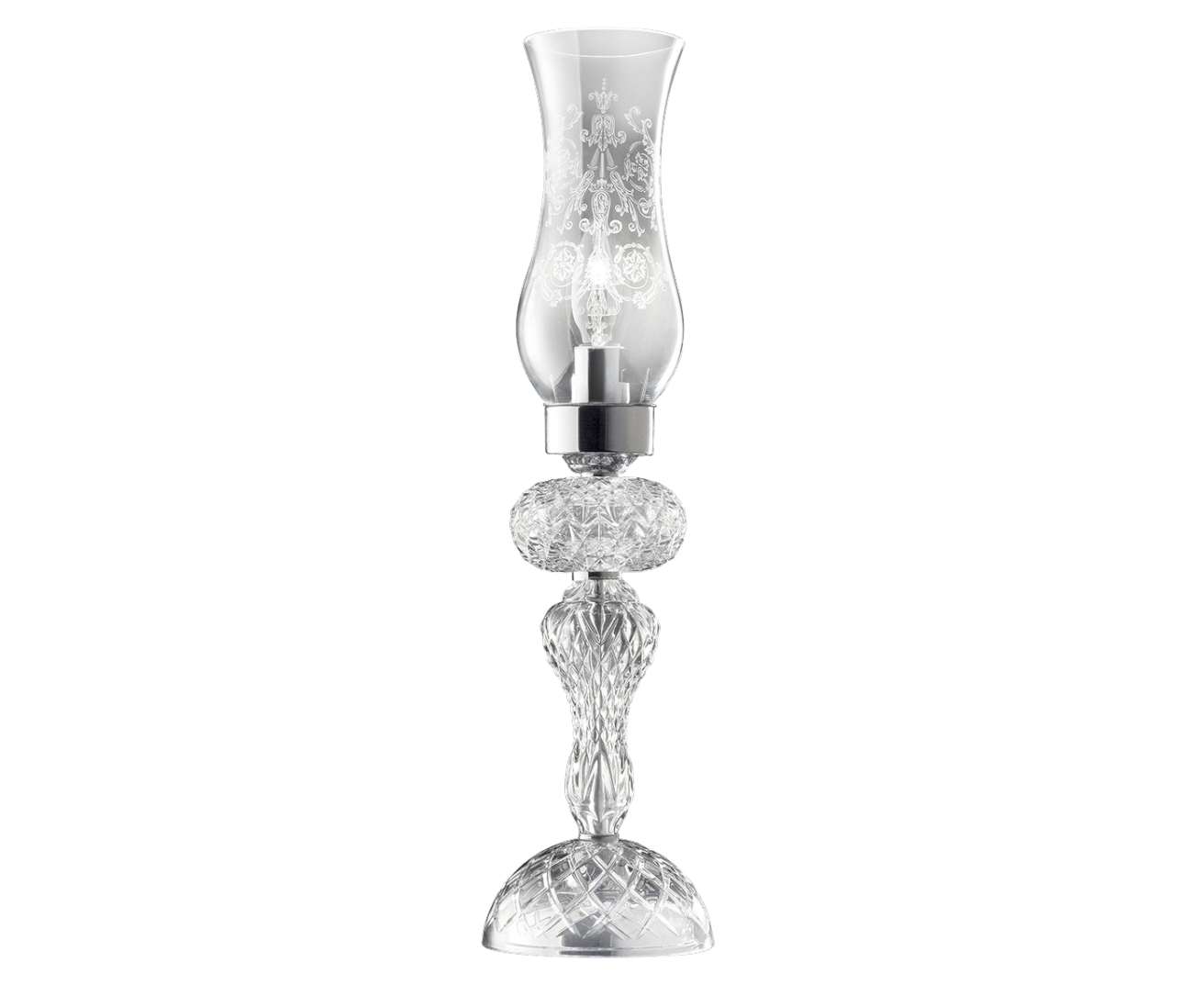 Настольная лампа из резного хрусталя со стеклянными рассеивателями и подвесками Swarovski Elements. Металл с хромированной отделкой. Доступны в разных размерах. Коллекция Opera Classic.