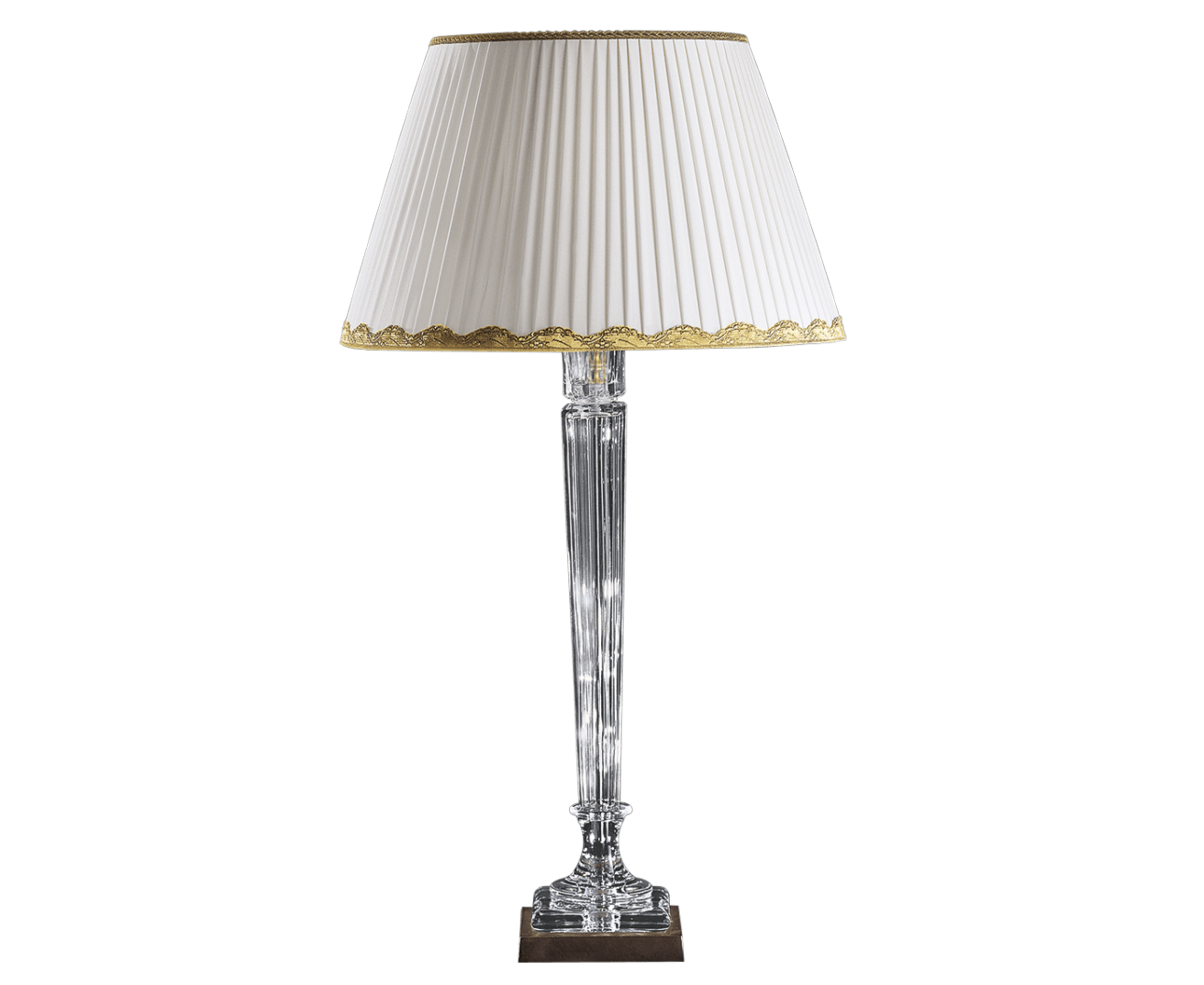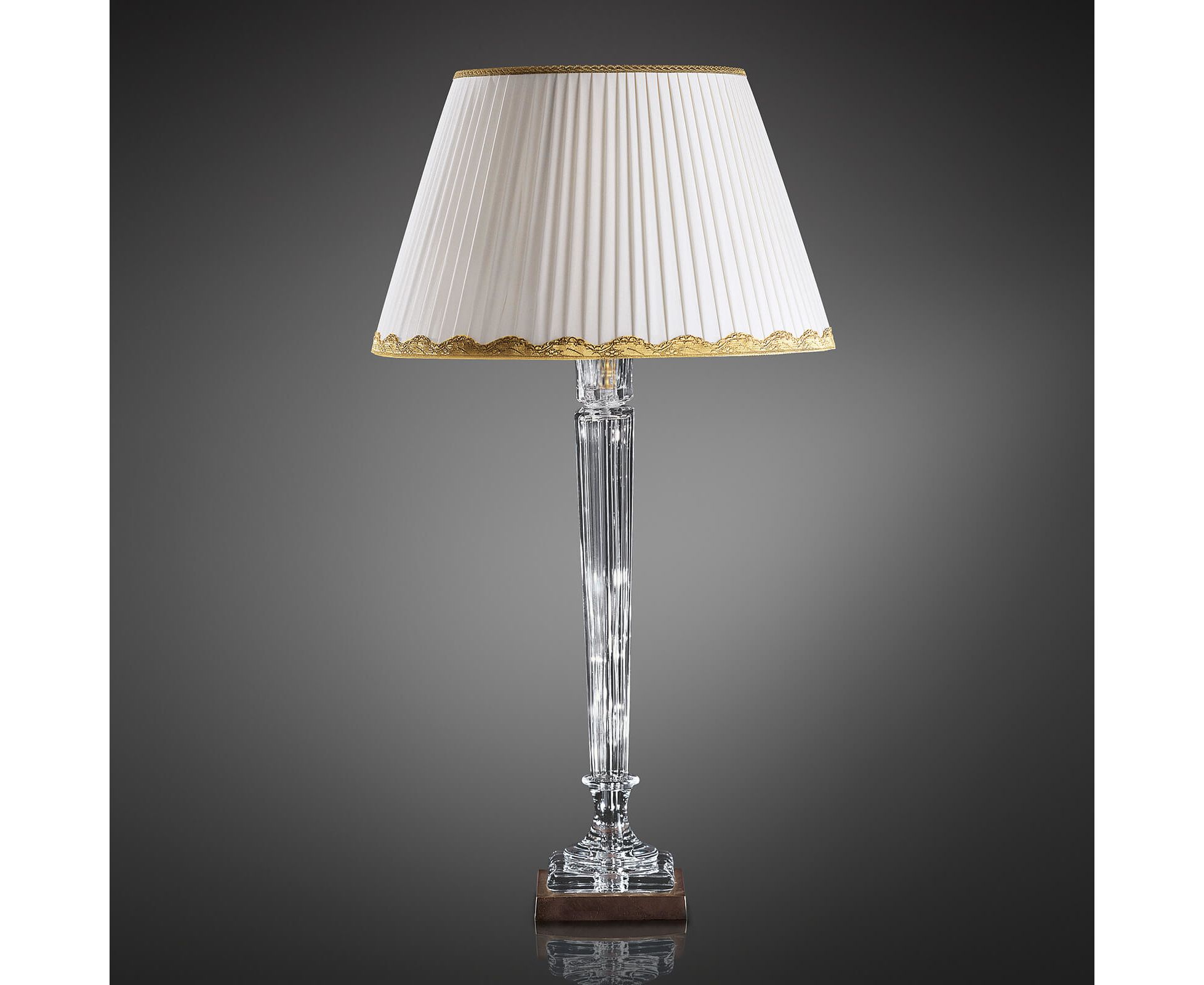 Настольная лампа из прозрачного хрусталя, металлическая основа с отделкой под старинное золото и абажур из бежевого текстиля. Доступны в разных размерах. Коллекция Opera Classic.