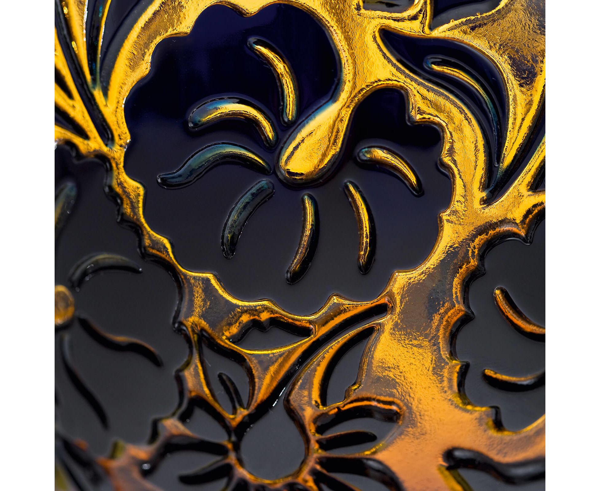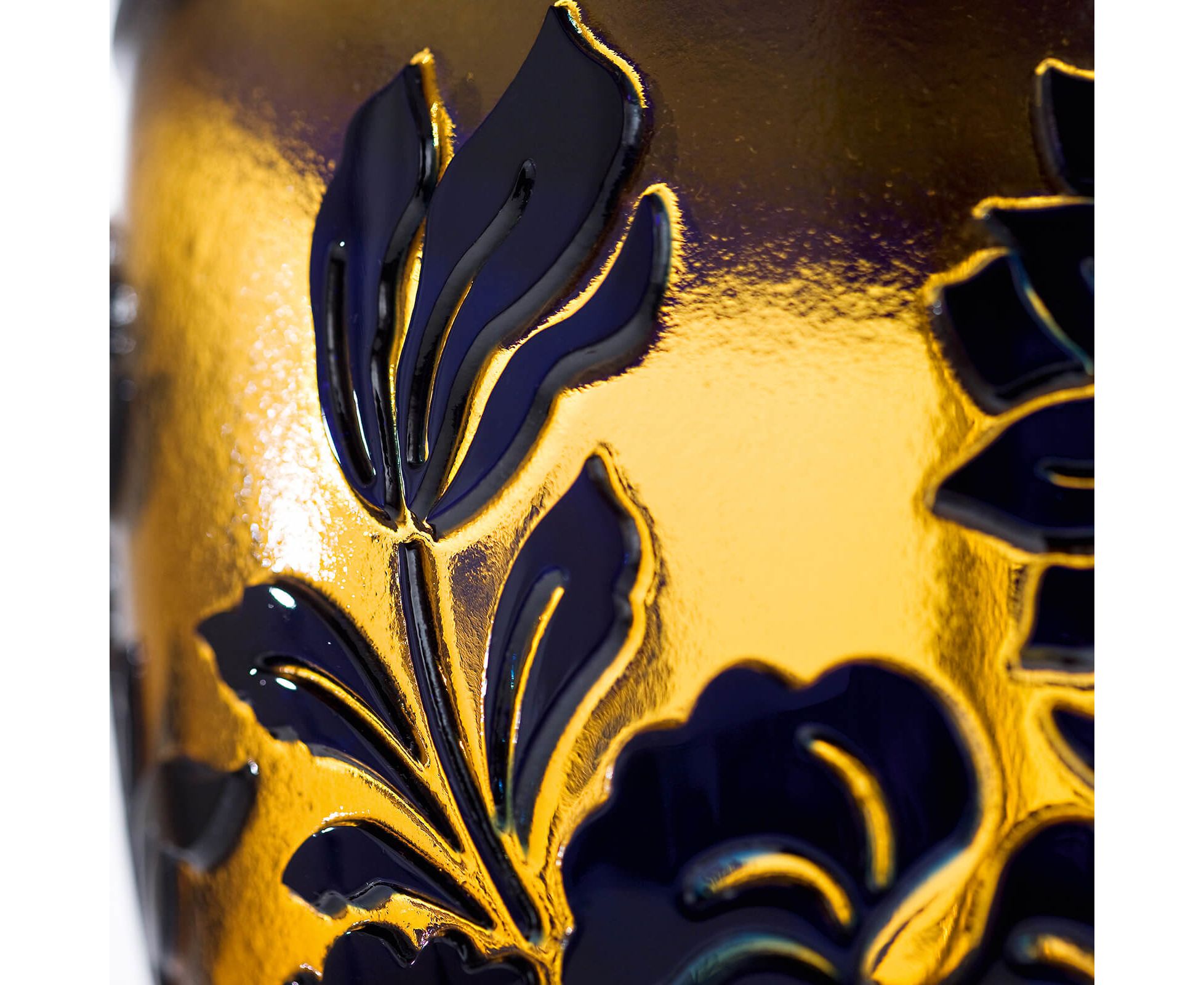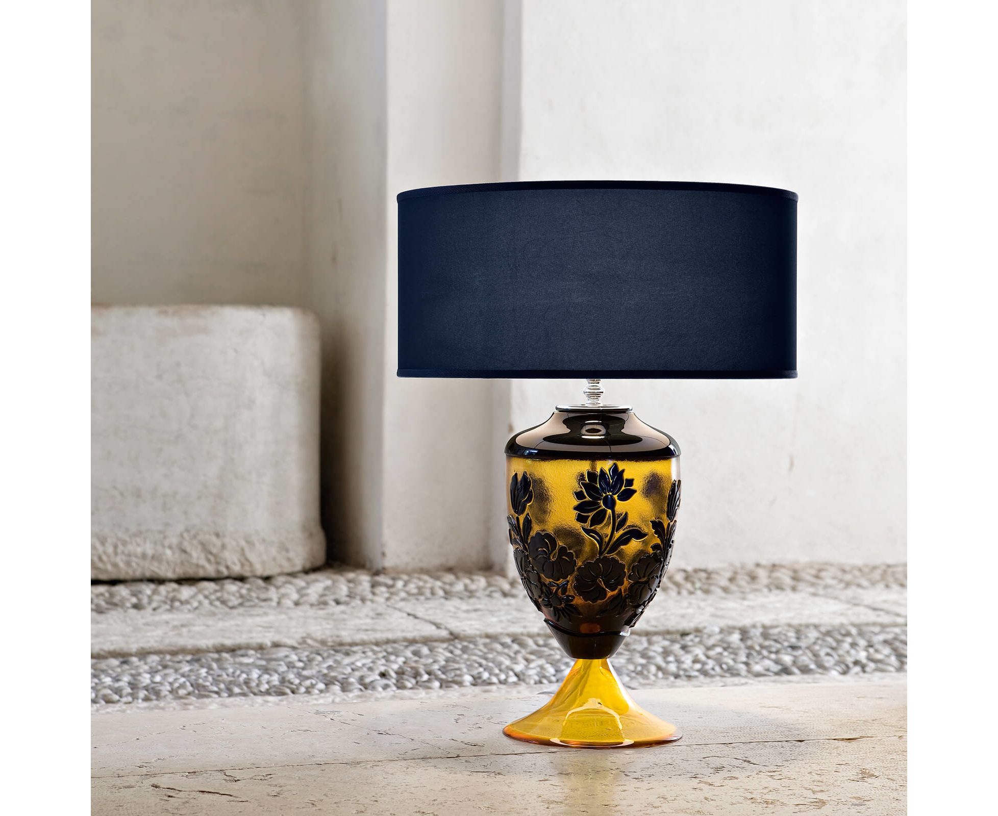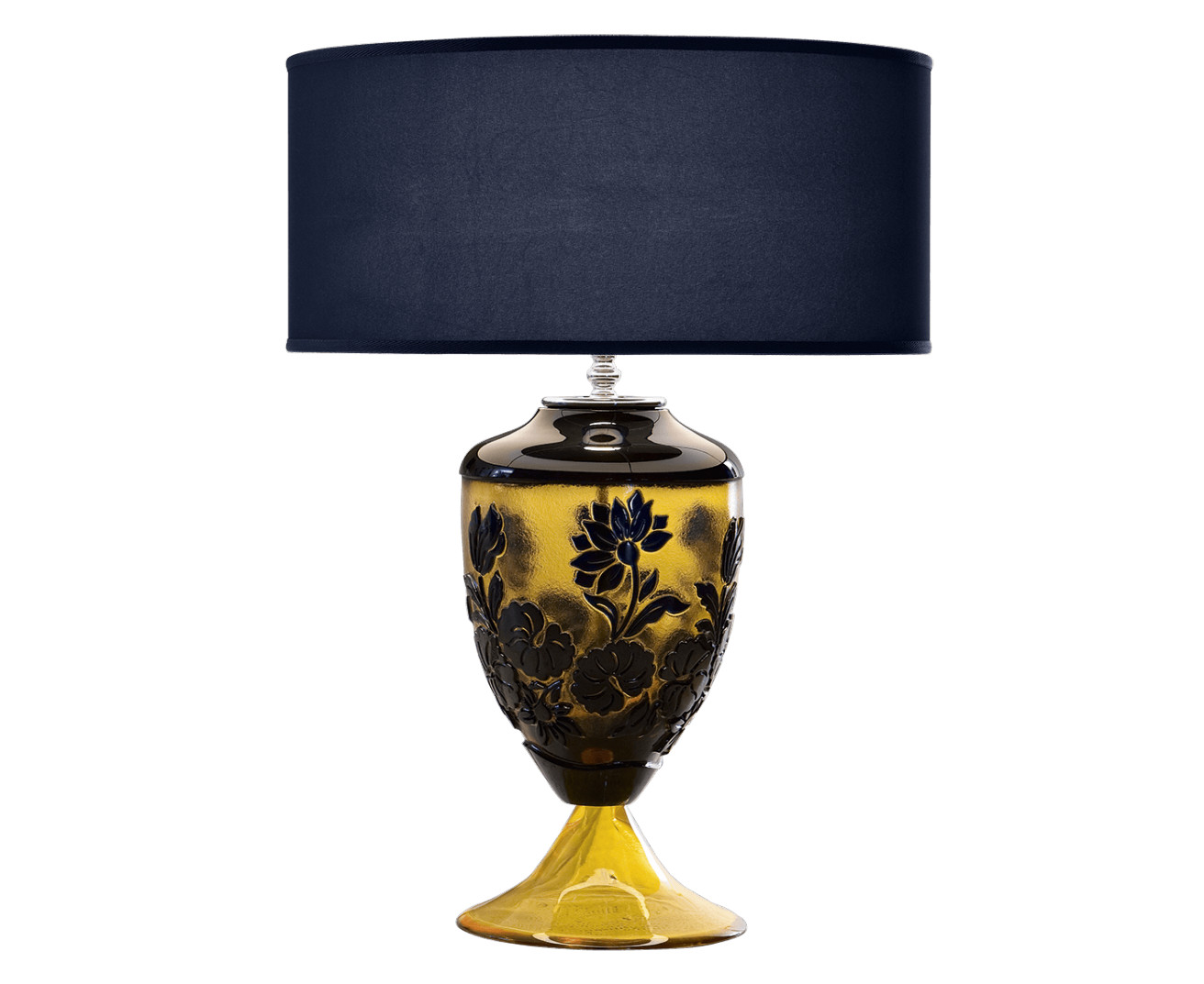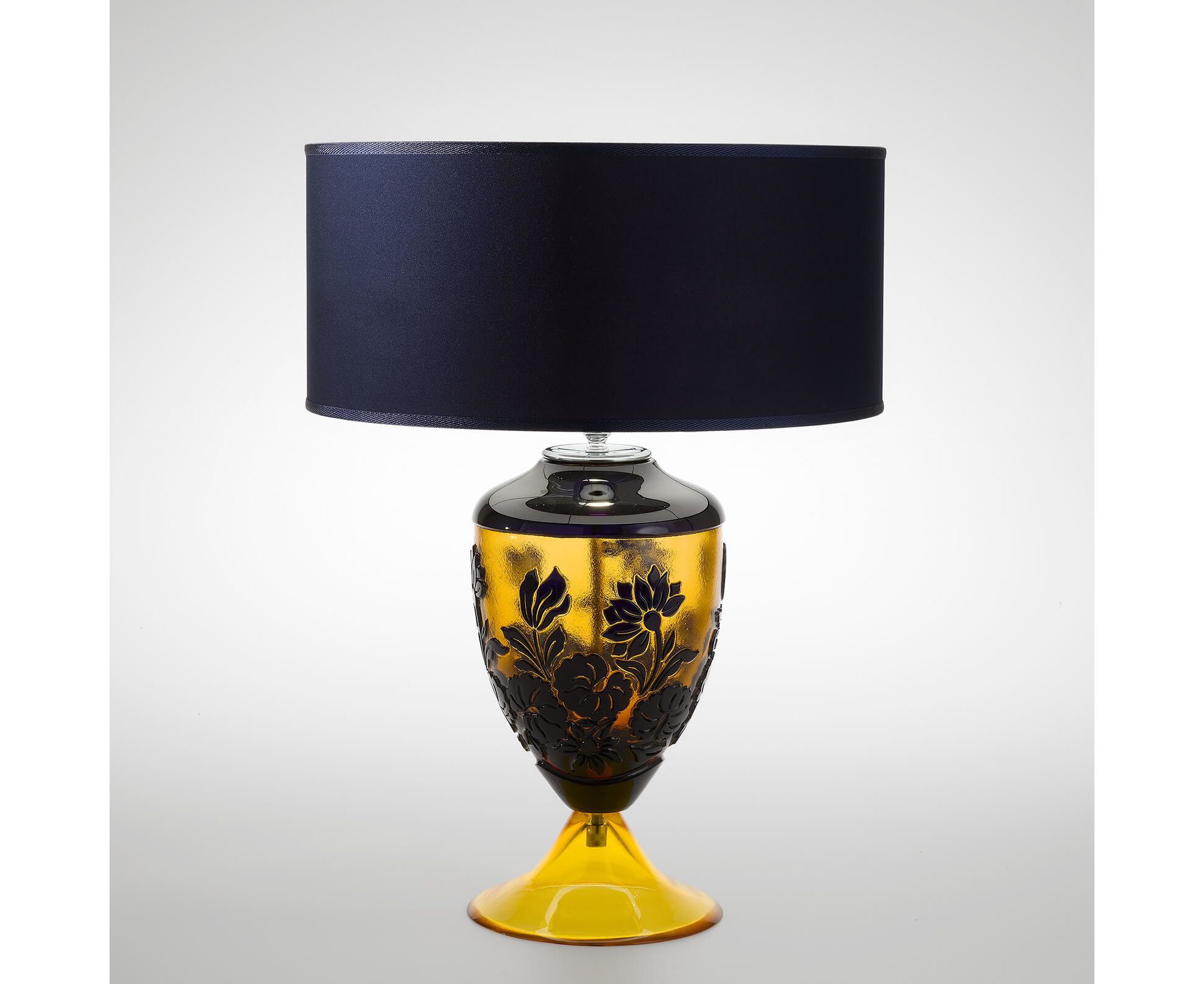 Настольный светильник из янтарного и синего хрусталя с темно-синим абажуром из ткани. Металлические детали с никелевым покрытием. Доступен в разных цветах. Коллекция Opera Classic.