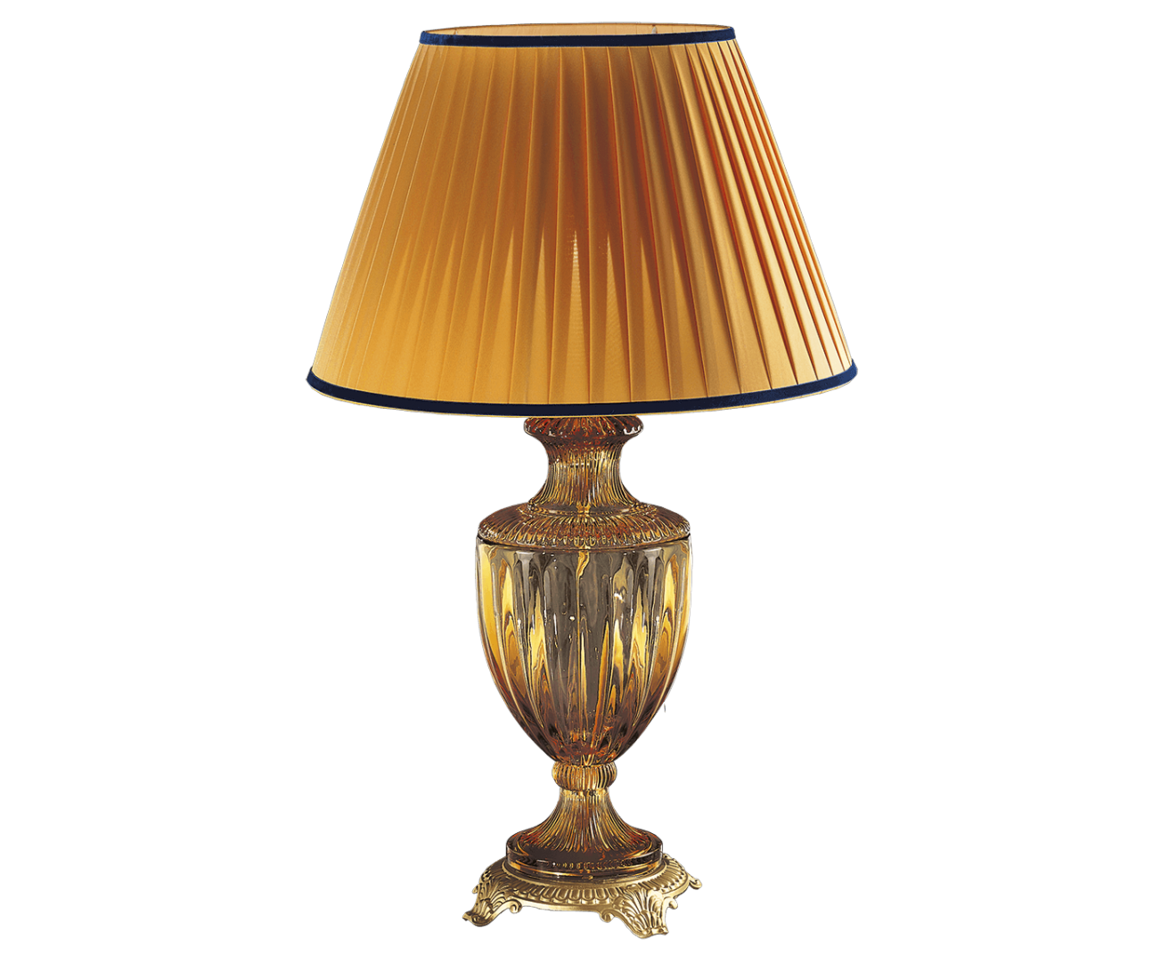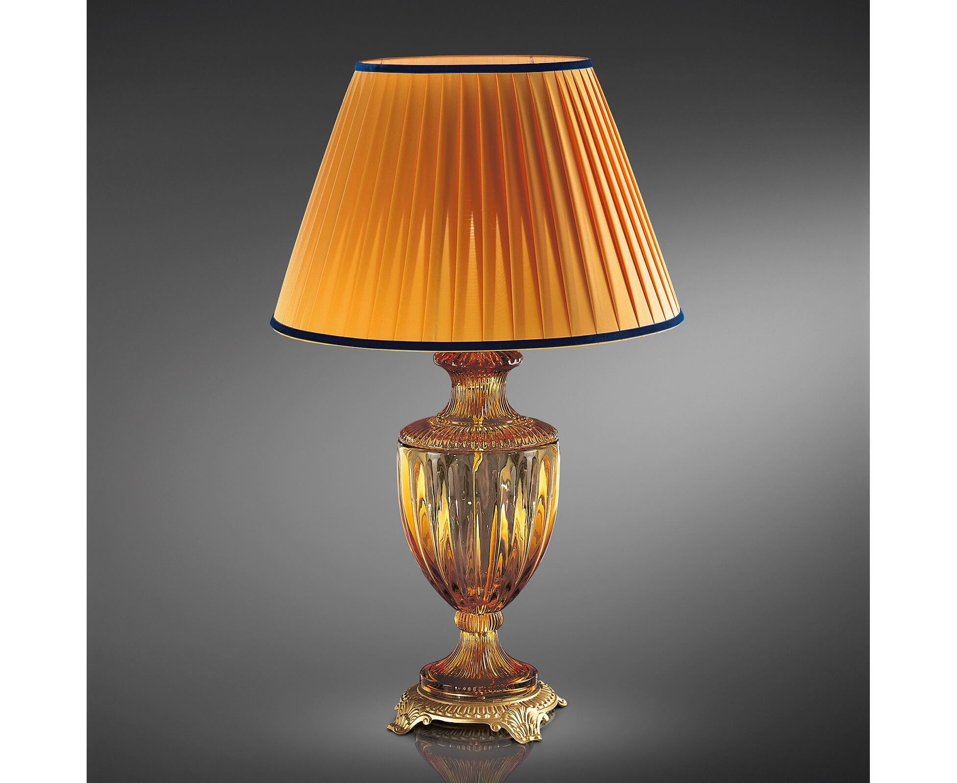 Настольная лампа из янтарного хрусталя, металлическая основа с отделкой из матового золота и жёлтой плиссированной ткани. Доступны в разных размерах и цветах. Коллекция Opera Classic.