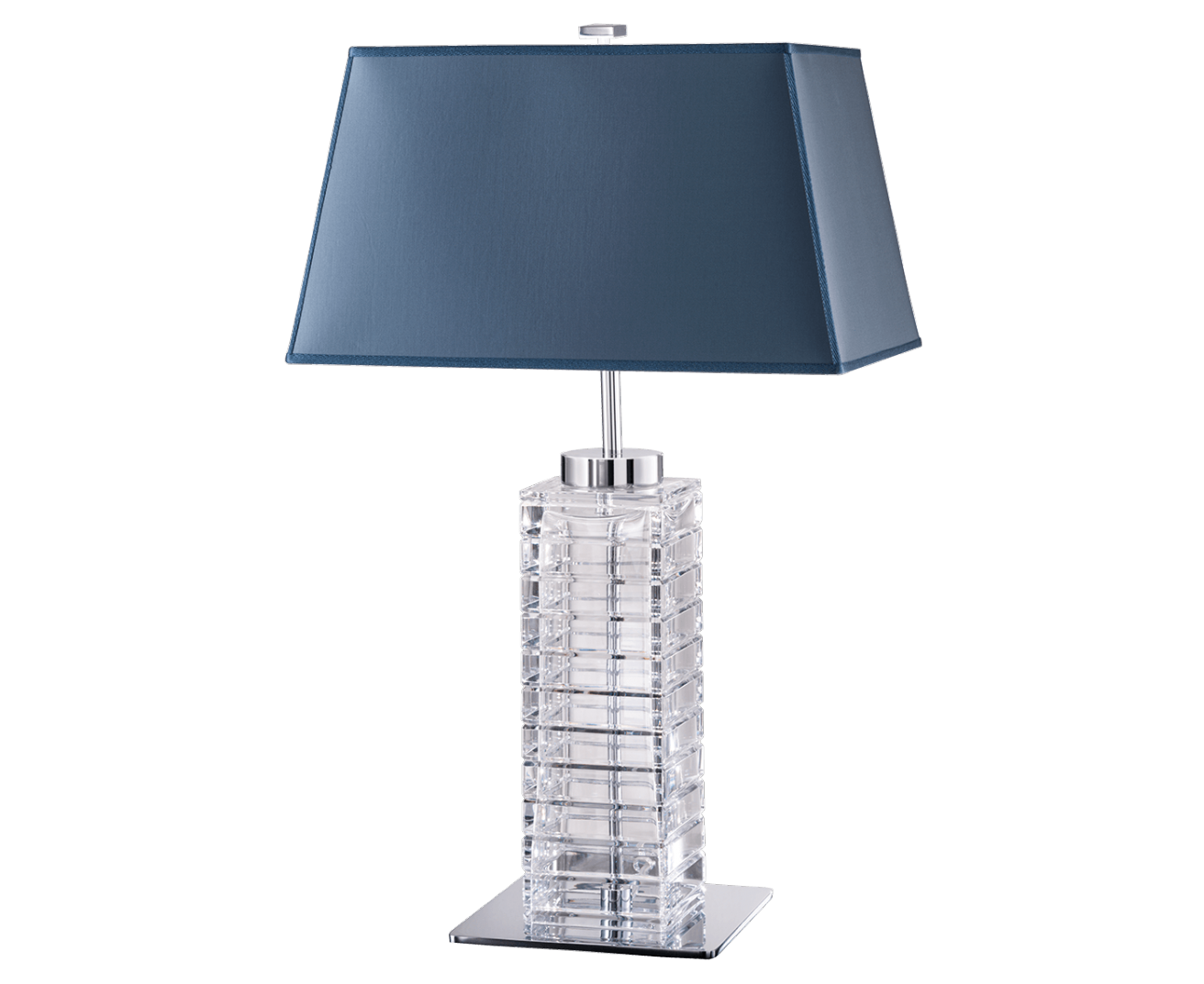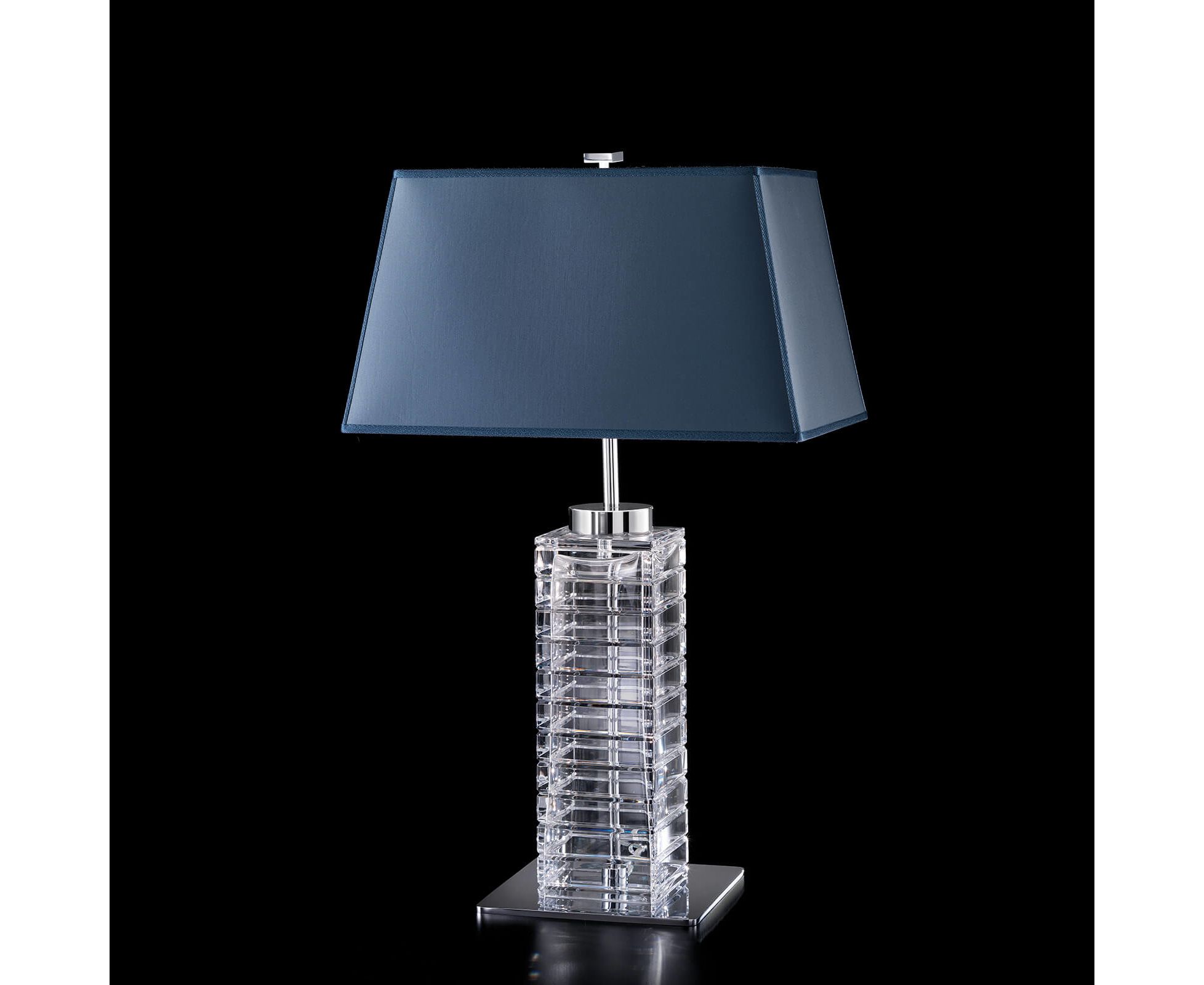 Настольная лампа из прозрачного хрусталя с синим абажуром из бумажной ткани. Металлические детали с хромированной отделкой. Доступен в разных цветах. Коллекция Opera Classic.