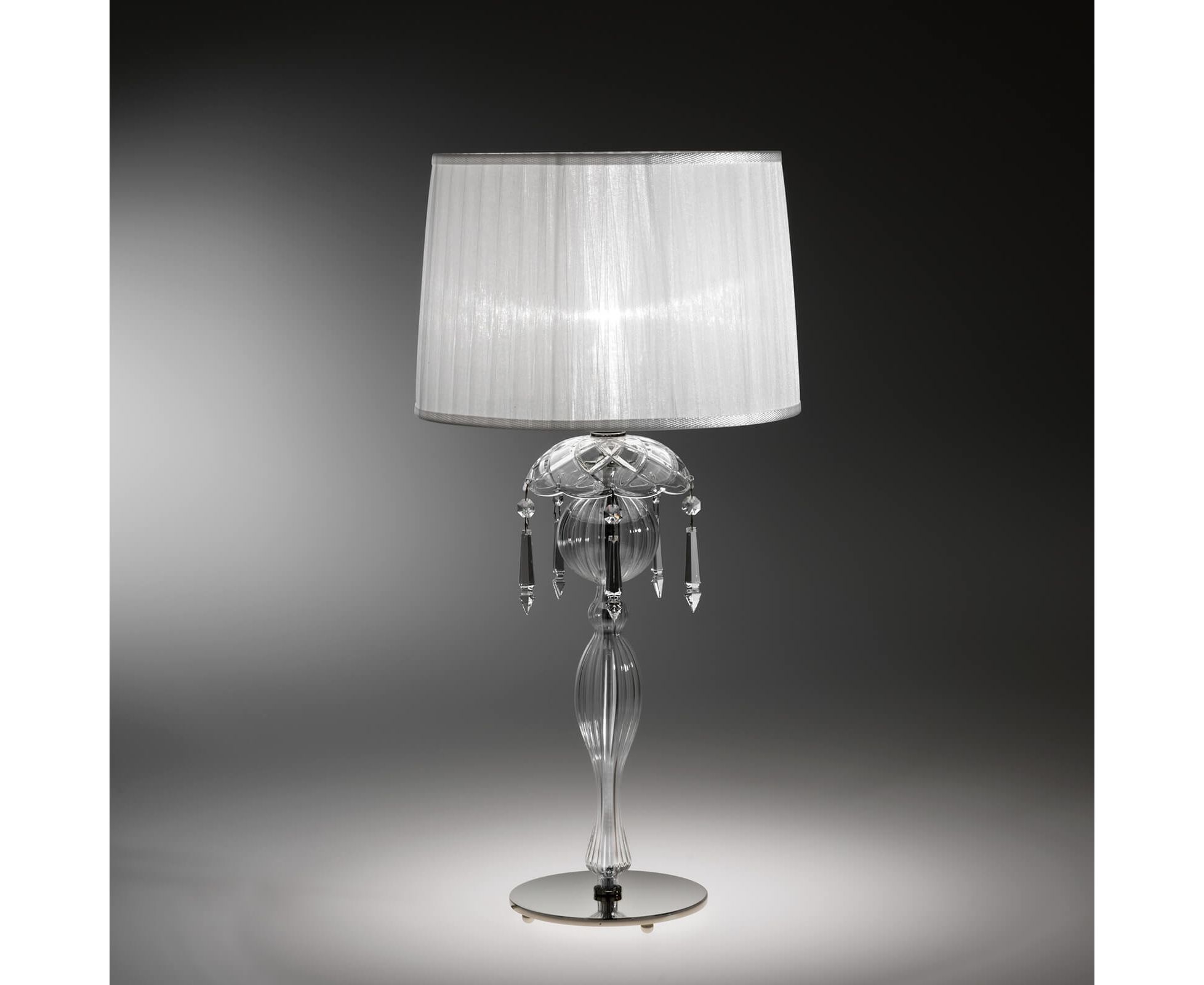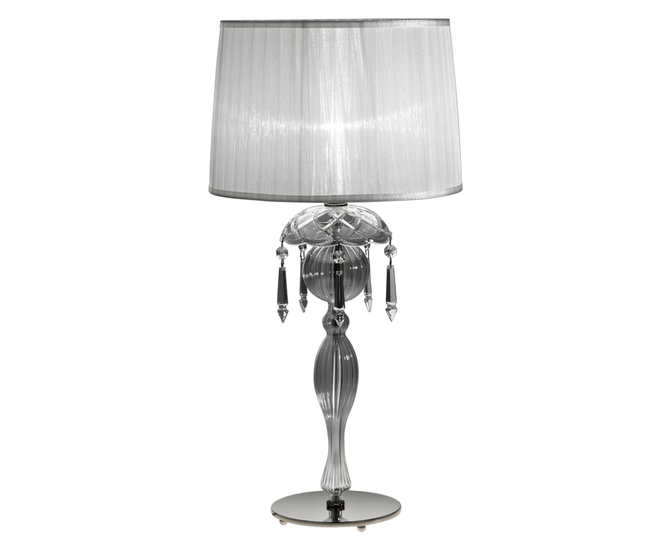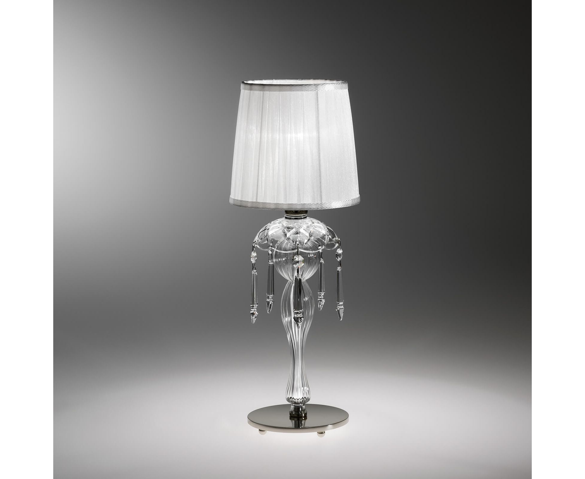 Настольная лампа из резного хрусталя и стекла, металл с никелевым покрытием, текстильный абажур цвета слоновой кости и подвески Swarovski Elements. Доступен в разных цветах. Коллекция Opera Classic.