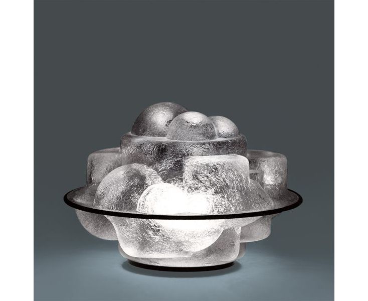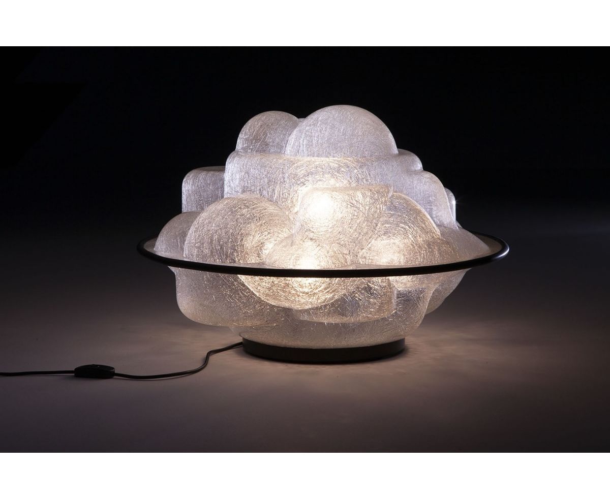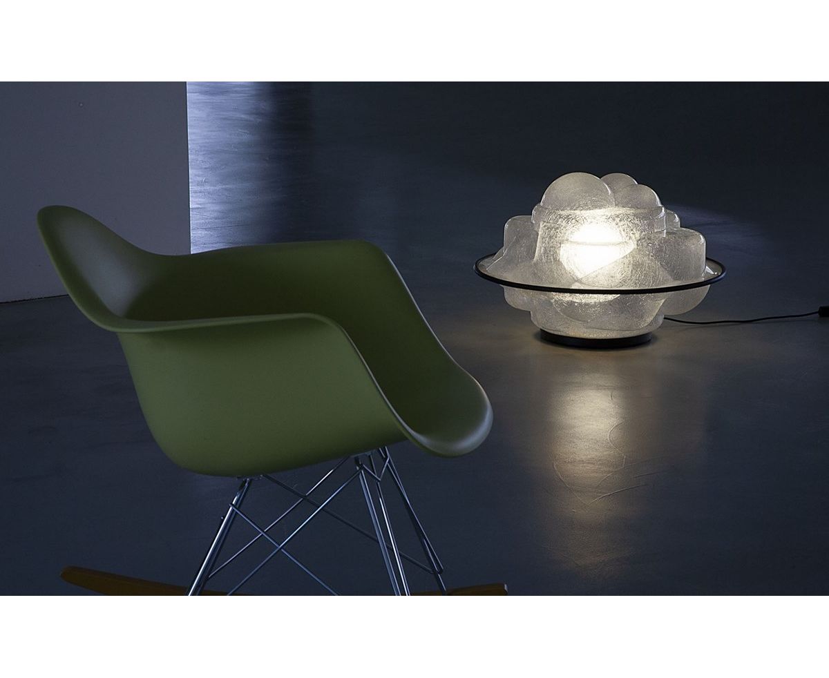 Настольный светильник с рассеянным светом. Рассеиватель из прозрачного метакрилата и полиэфирной смолы со стекловолоконным кристаллом. Соединительное кольцо из черной резины, основание из черного лакированного алюминия. Для светодиодных ламп. Переиздание 1968 года.