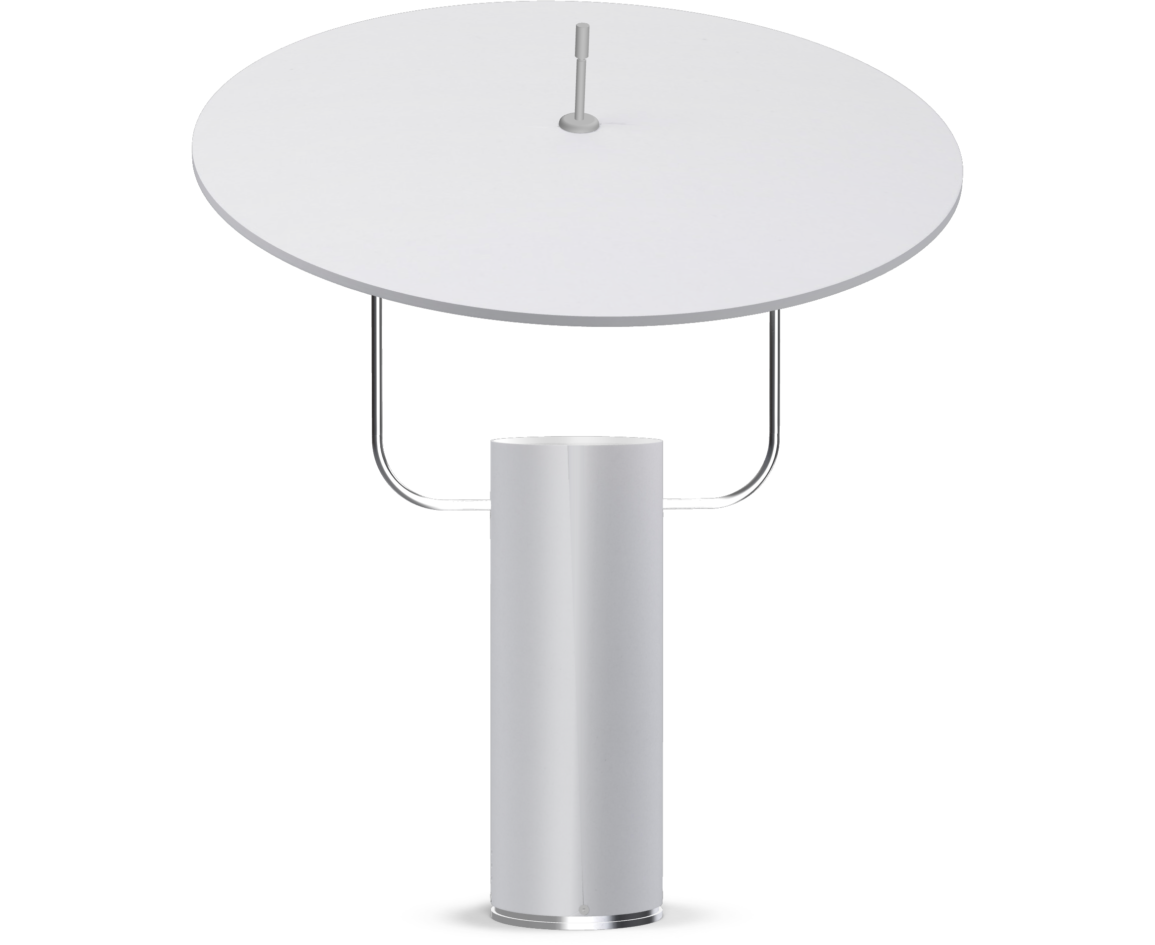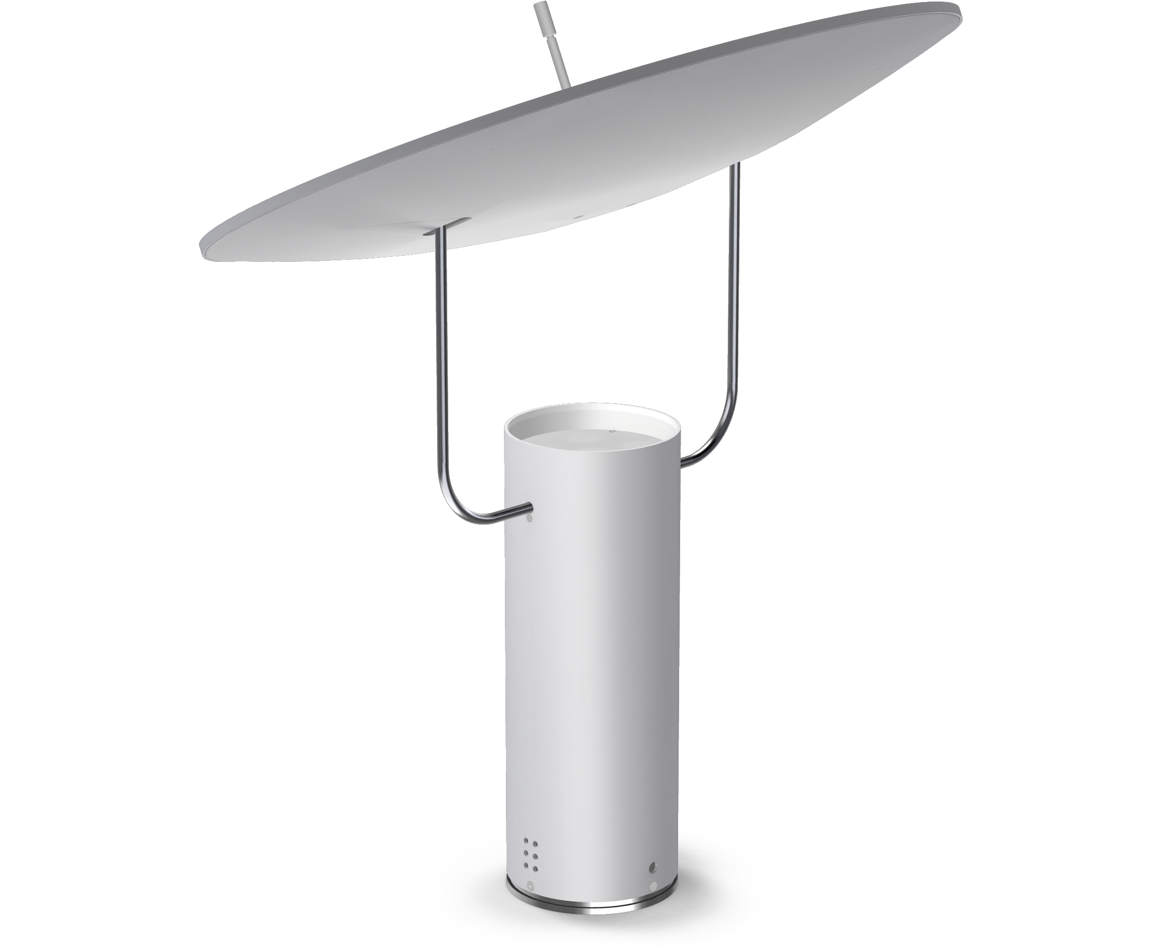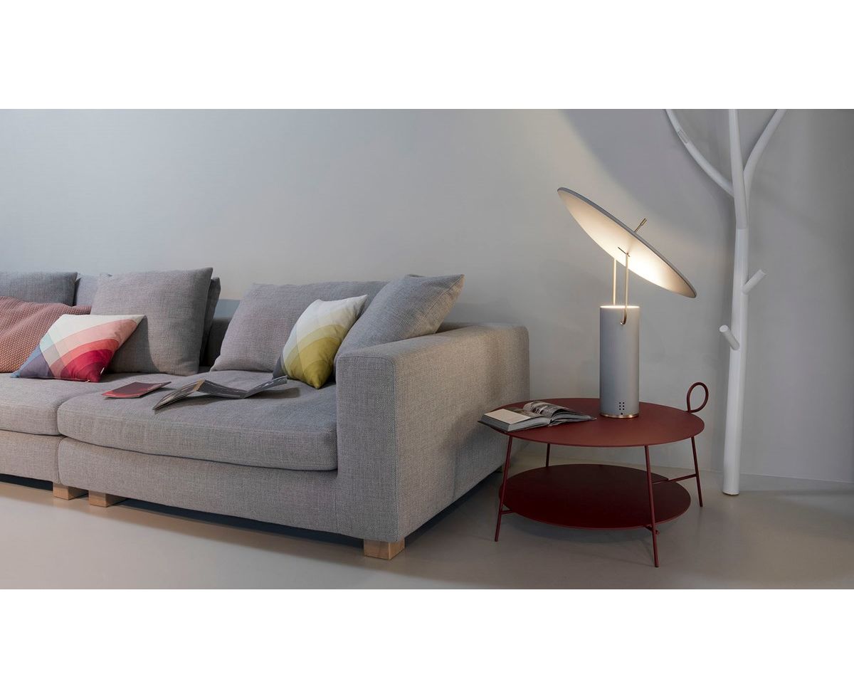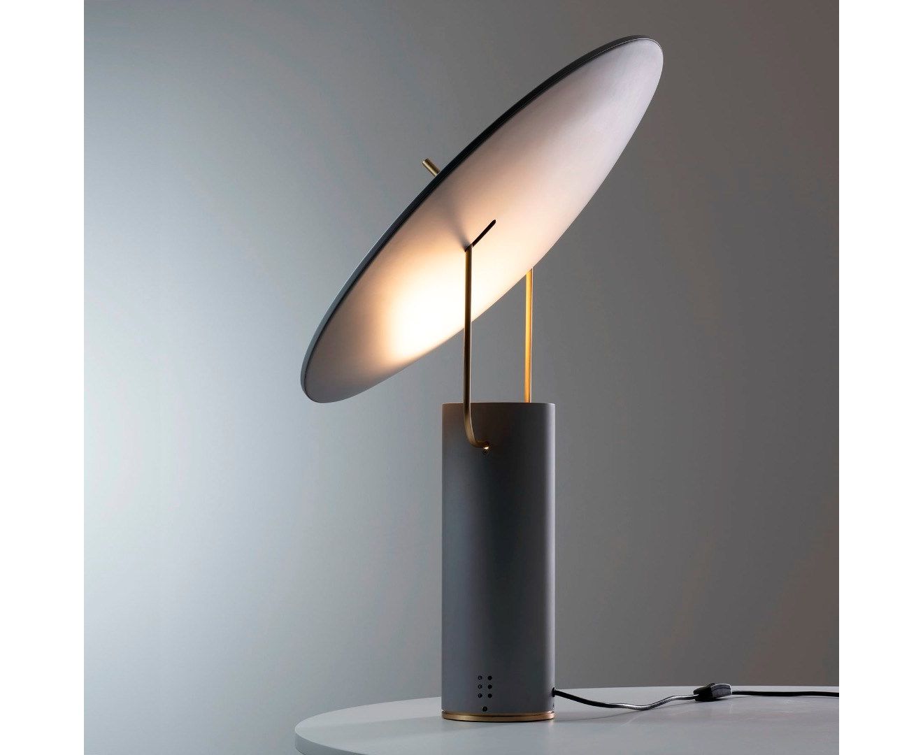 Настольная лампа отраженного света, регулируемый отражатель. Конструкция из алюминия, лакированного серого цвета, опора из латуни. Светодиодный источник света. Доступен также в версии RGB с интерфейсом Bluetooth. Электронный драйвер и светодиод встроены в корпус лампы. Кабель питания в комплекте.