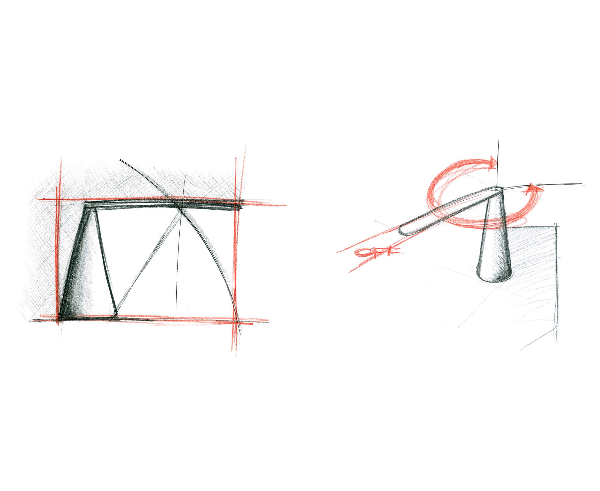 Эти зарисовки были сделаны Брайаном Сирони, чтобы дать представление о его изобретении в реальности. Они представляют лампу в двух разных ракурсах: на первом изображении он представлен спереди, чтобы вы могли видеть каждый отдельный элемент, составляющий лампу, а на втором изображении он представлен сверху, чтобы понять его активацию / функциональность.