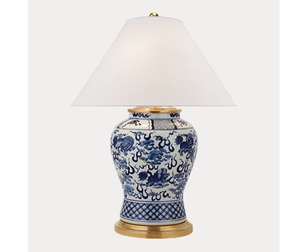 Дизайн в китайском стиле, создающий эту фарфоровую настольную лампу, украшен живописными собаками, что является художественным намеком на богатую историю символа. Конический шелковый абажур прекрасно рассеивает свет и дополняет элегантный светильник.