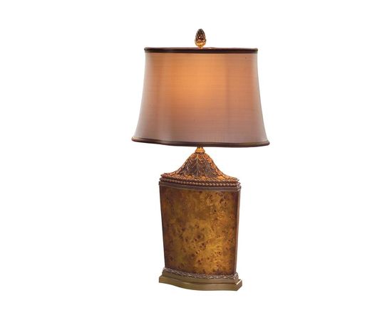 Изящно отлитая настольная лампа из мозаики из латуни и тополя с абажуром, основание из аканта с лавровым венком на форме фигурного тела, увенчанного яйцевидным шелковым абажуром. В стиле французской империи.