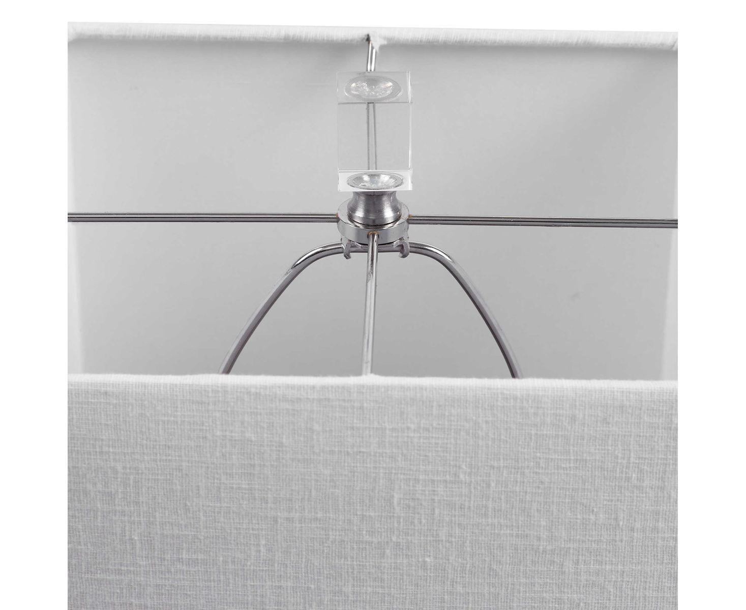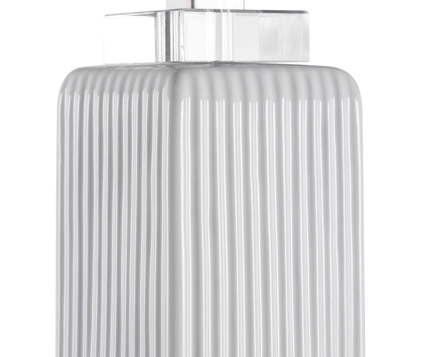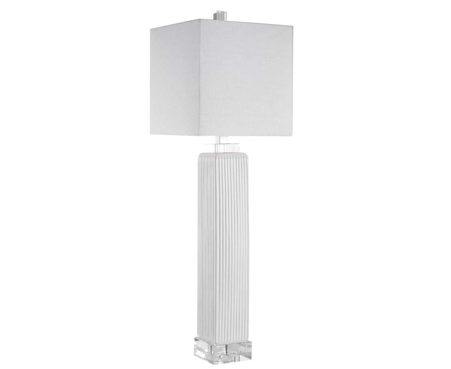 Демонстрируя утонченный переходный стиль, эта лампа может быть легко размещена с квадратной ребристой основой, отделанной глянцевой белой глазурью, в сочетании с толстыми деталями из хрусталя и матовыми никелевыми вставками. Квадратный абажур - белая льняная ткань.