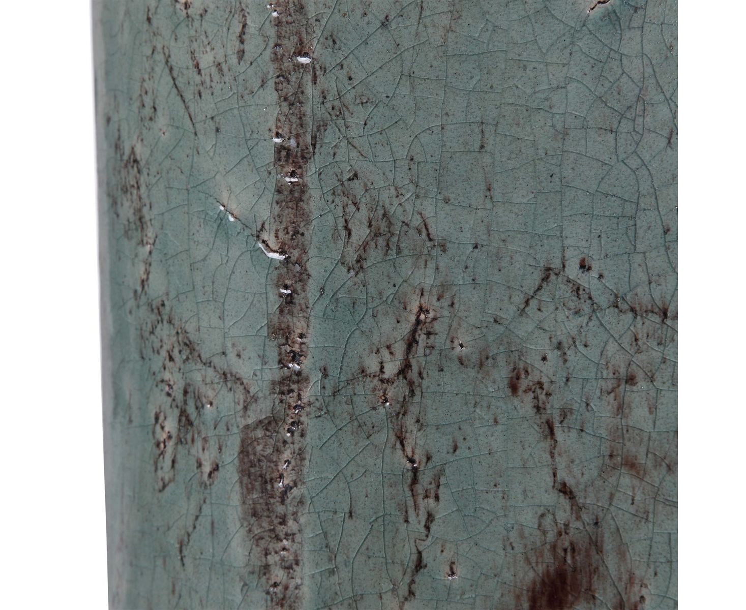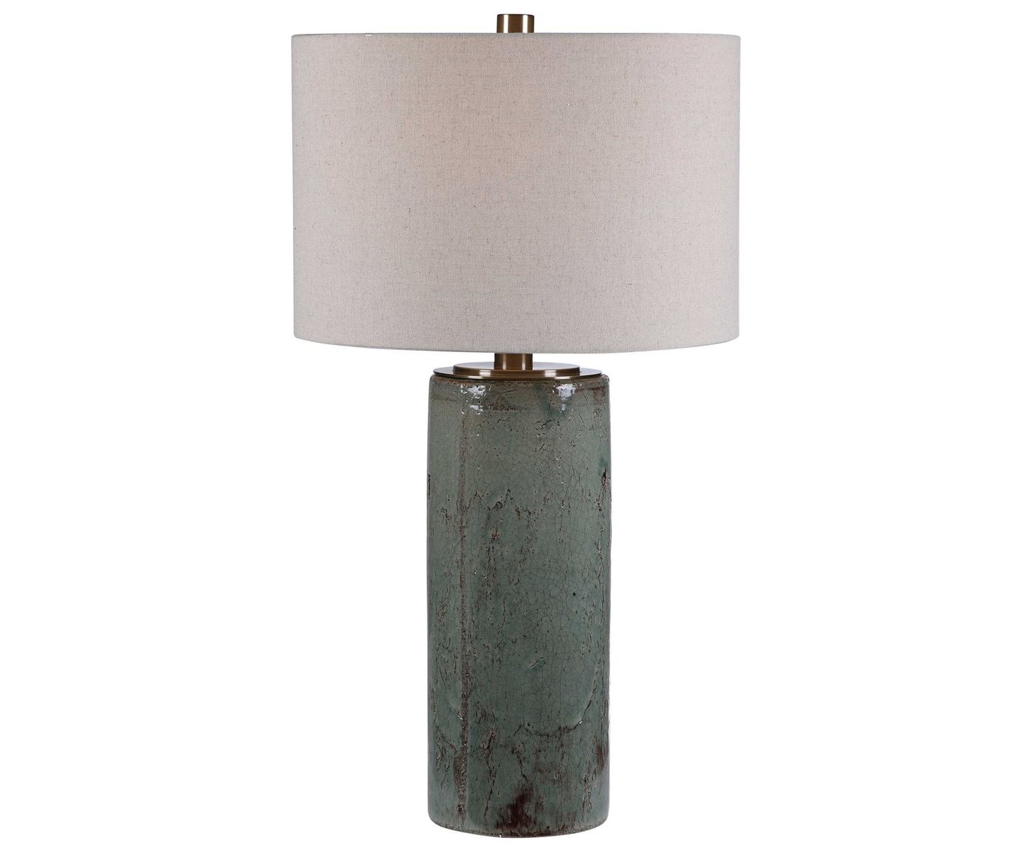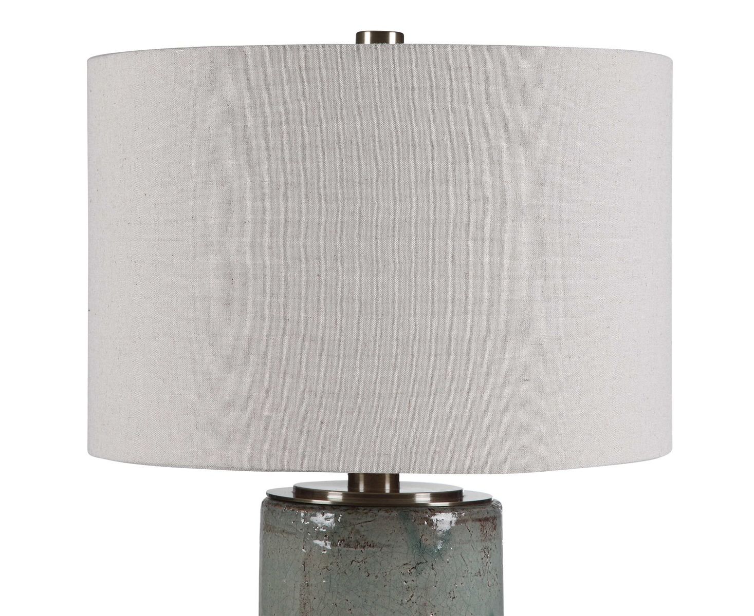 Керамическая настольная лампа, отделанная потрескавшейся светло-голубой глазурью с темной бронзой в деревенском стиле, с акцентом из матового никеля. Круглый твердый абажур - это светло-бежевая льняная ткань.