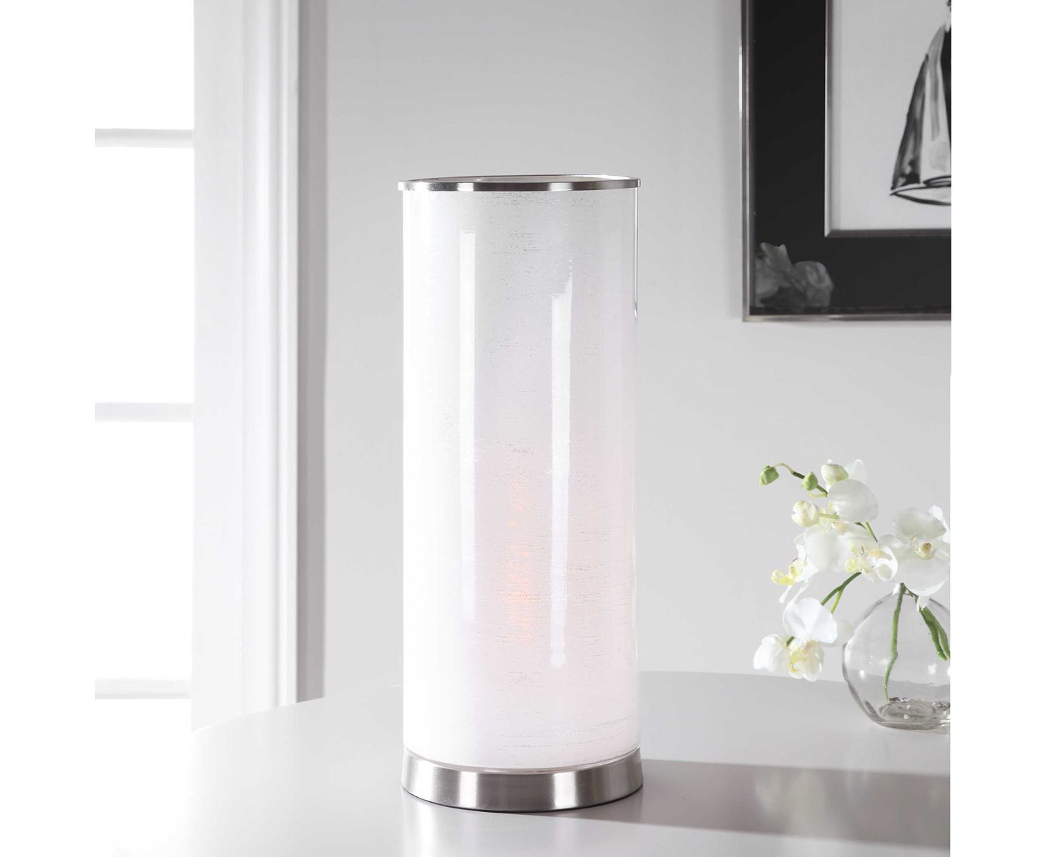 Эта акцентная лампа имеет цилиндрический рассеиватель белого стекла с выгравированными деталями, напоминающими ветвь березы, с акцентами из матового никеля. Одна лампочка Edison мощностью 40 Вт входит в комплект.