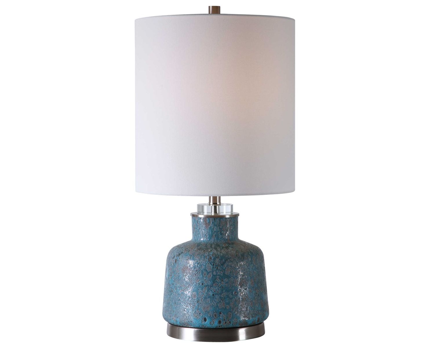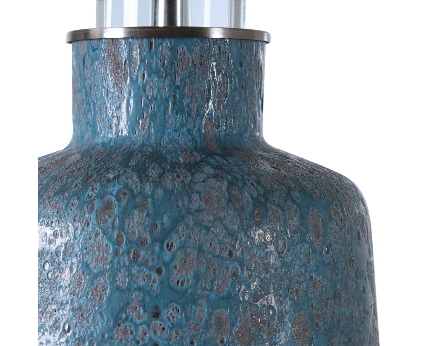 Современная стеклянная акцентная лампа отделана пятнистой бирюзой с дымчато-серыми оттенками, акцентированной деталями из матового никеля и хрустальным орнаментом. Нижняя часть соединена с белой льняной тканью.