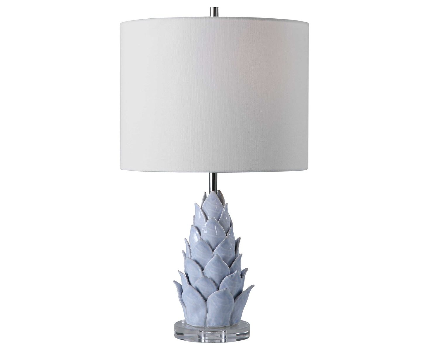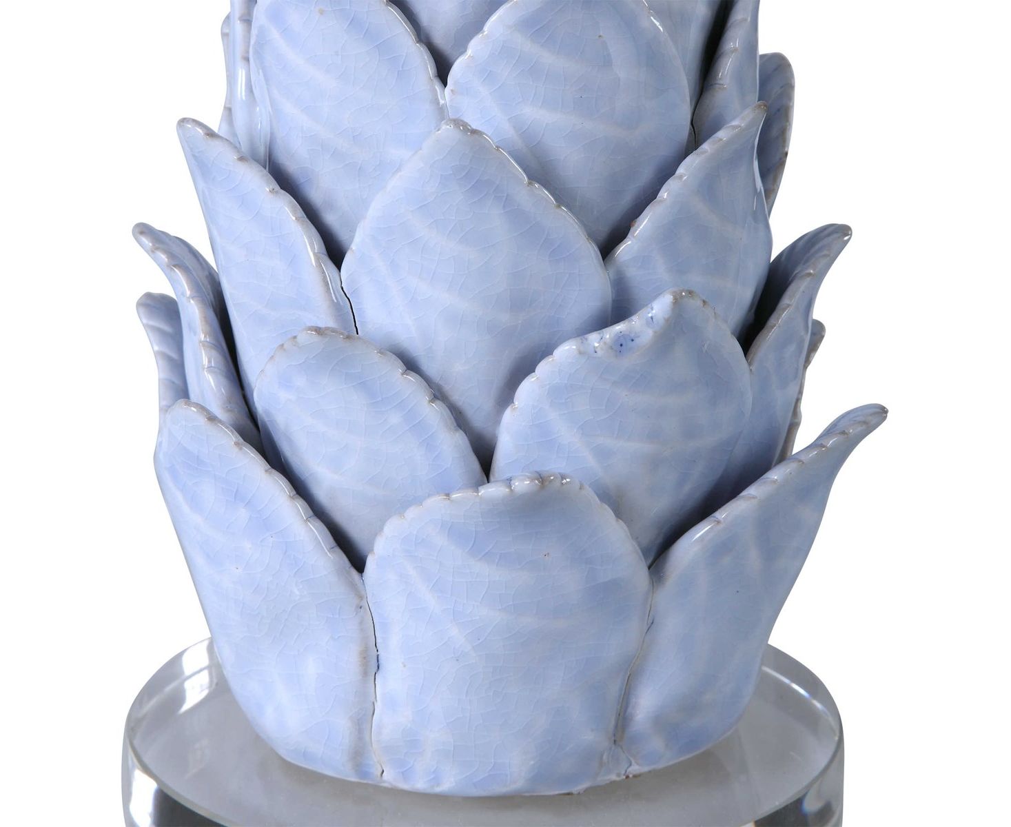 Эта деликатная керамическая лампа с дизайном в виде цветка лотоса отделана потрескавшейся светло-голубой глазурью с тонким ржавым коричневым оттенком, подчеркнутым деталями из полированного никеля и толстой хрустальной ножкой. Абажур представляет собой круглый барабан из белой льняной ткани.