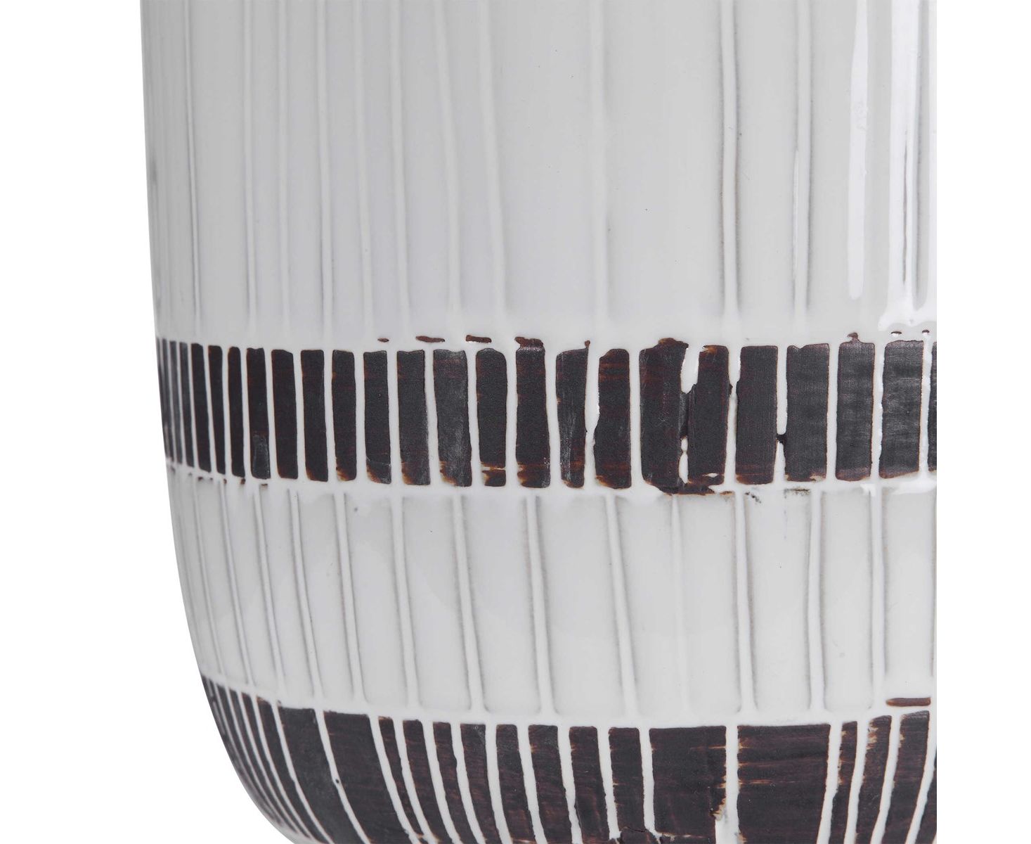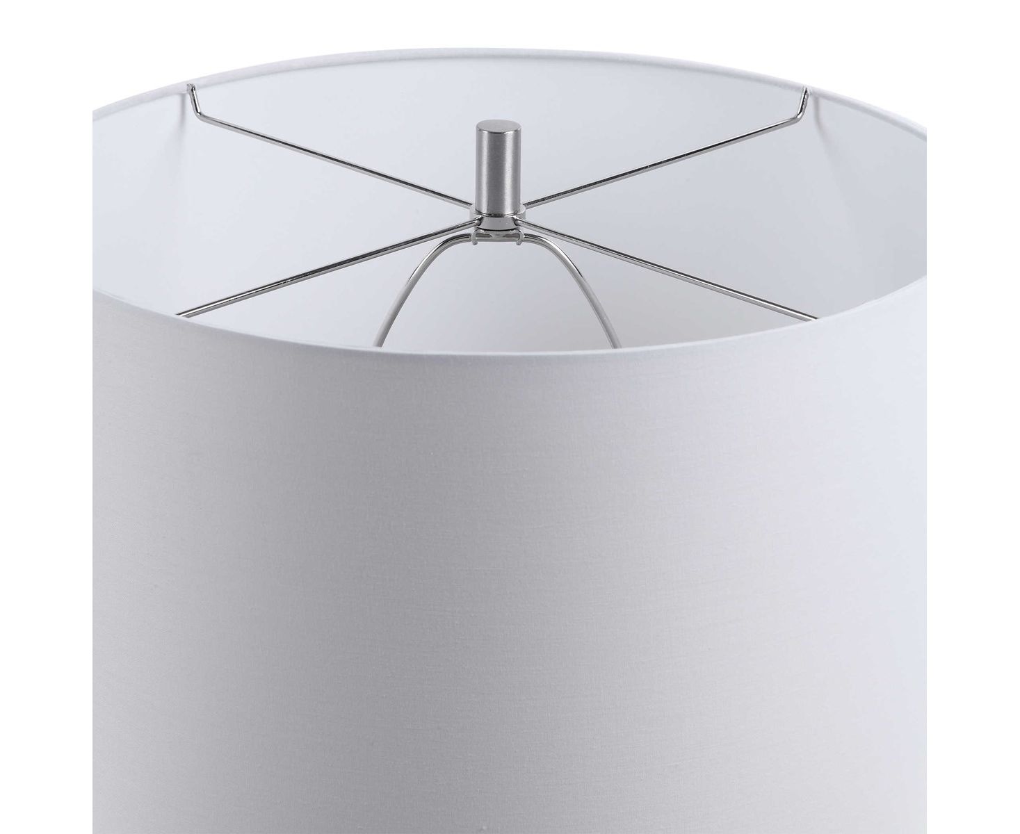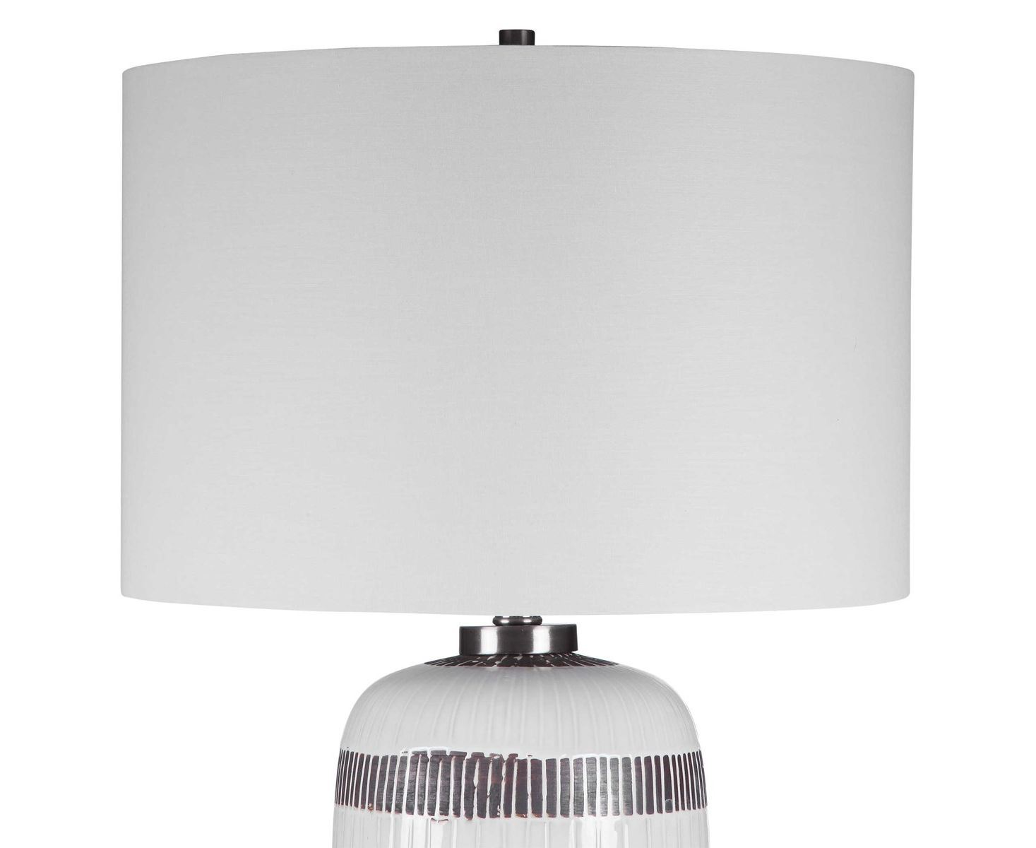 Придайте нотку стиля домика охотника вашему пространству с помощью этой керамической настольной лампы. Основа имеет вертикальную рельефную текстуру, отделанную состаренной белой глазурью с темными деталями шоколадно-коричневого цвета с акцентом из матового никеля. Твердый абажур в форме барабана - это белая льняная ткань.