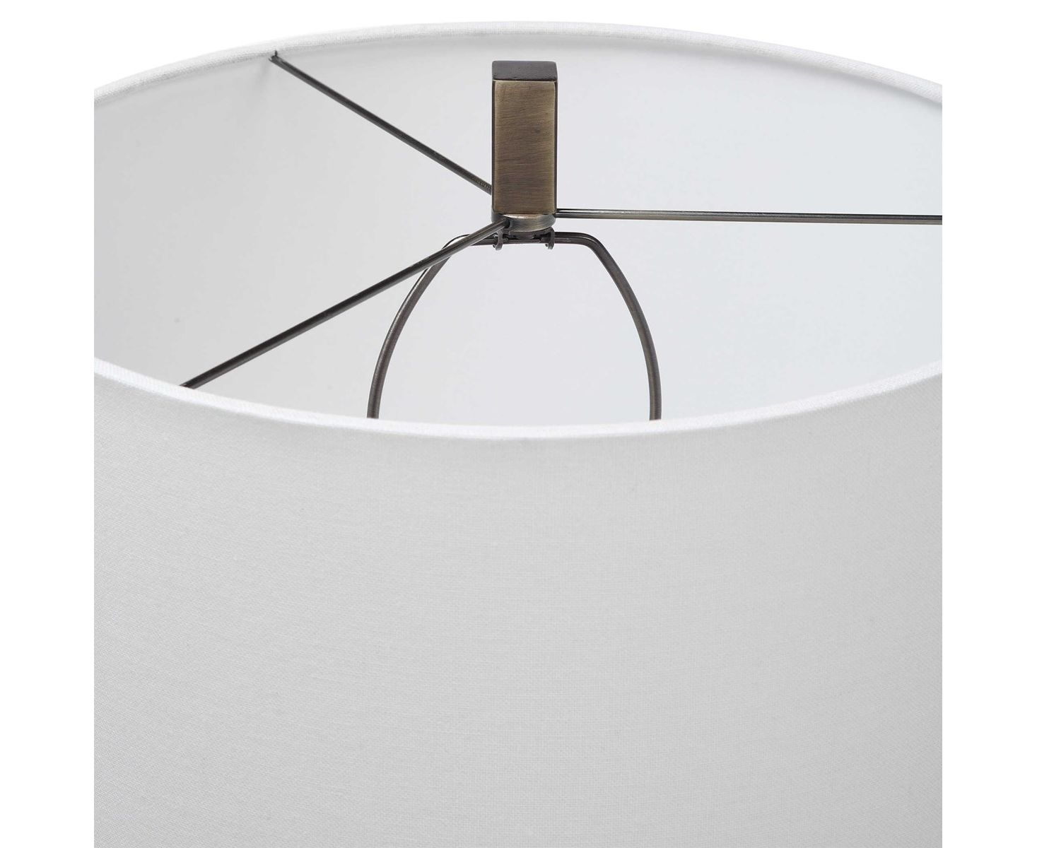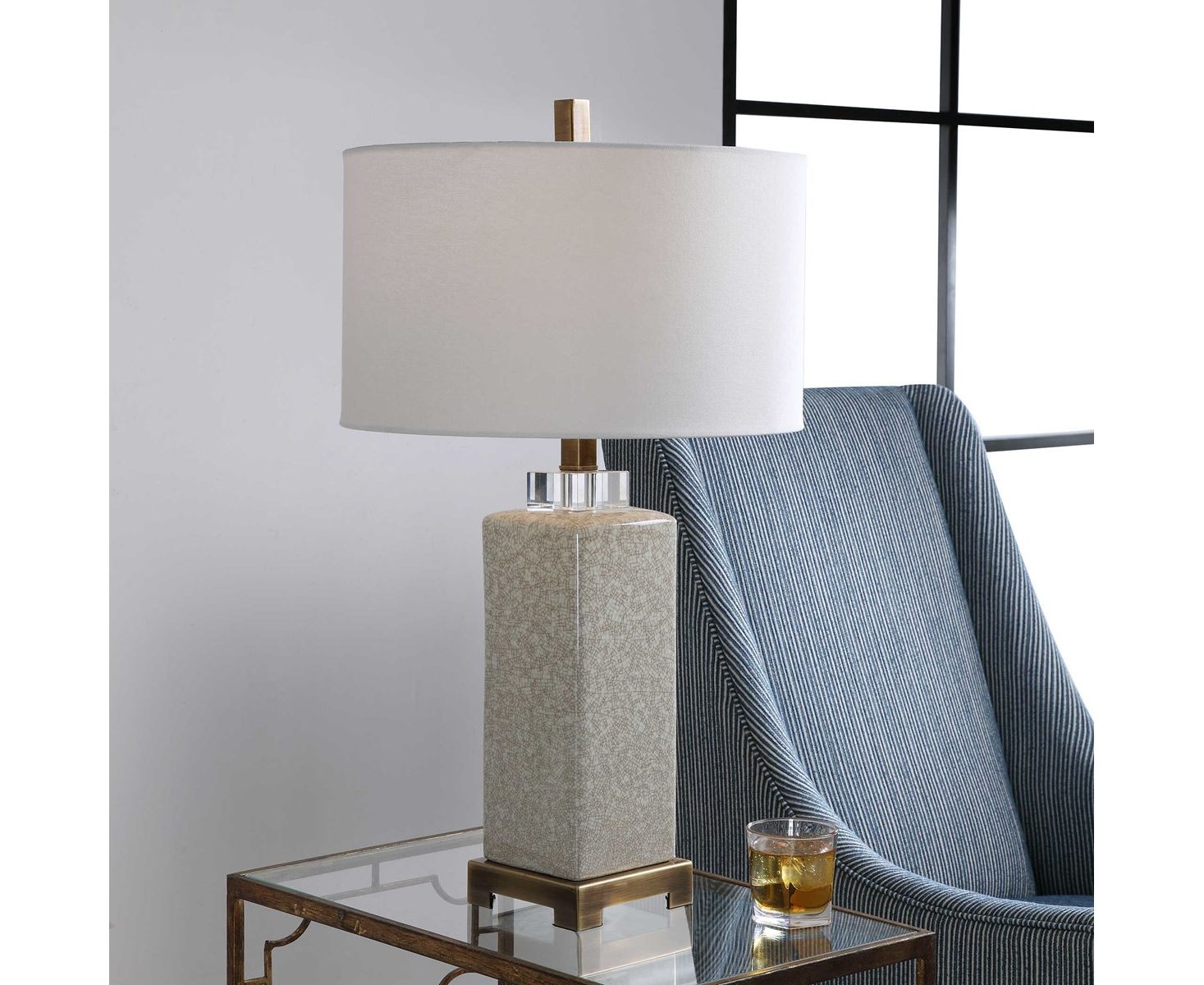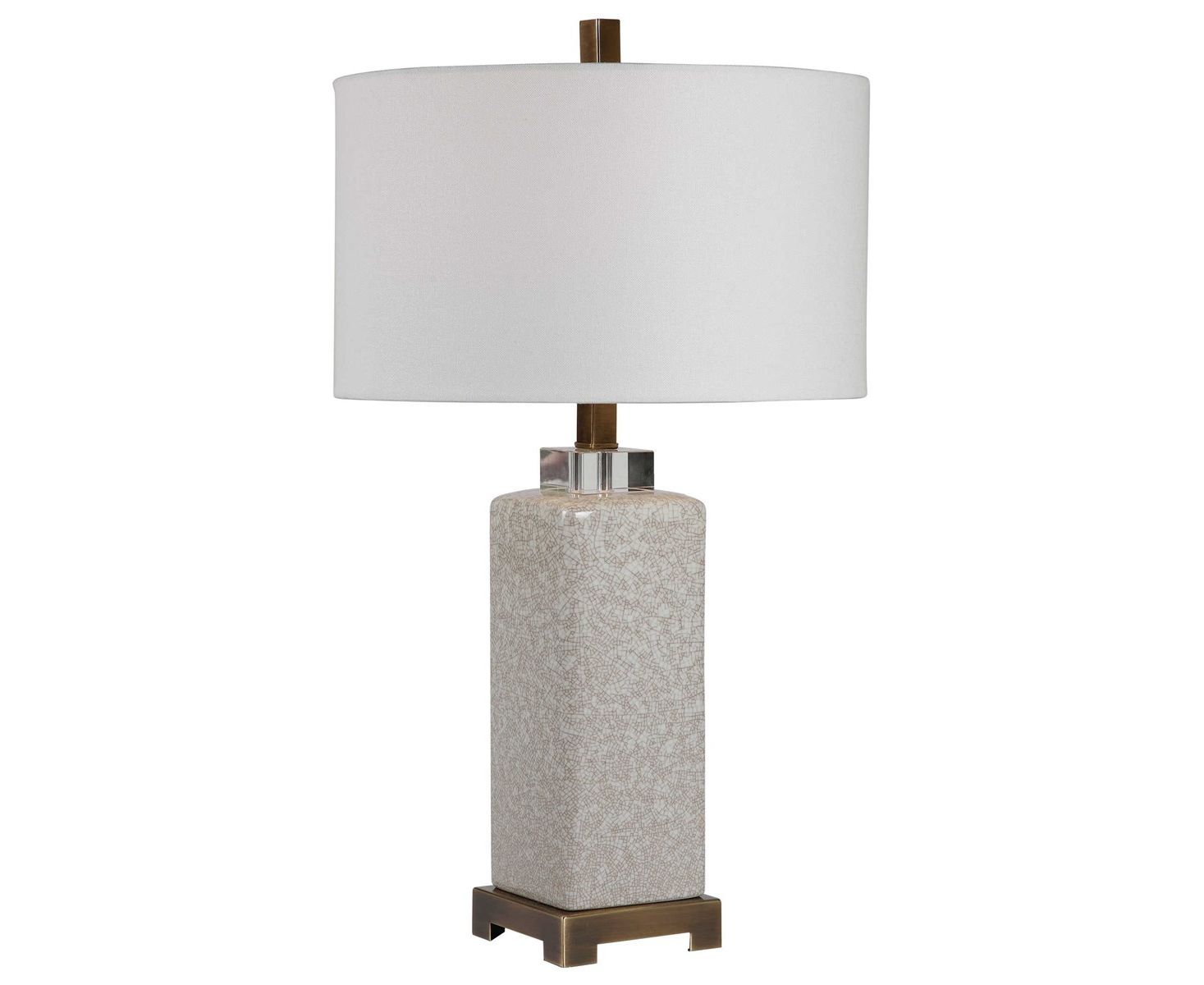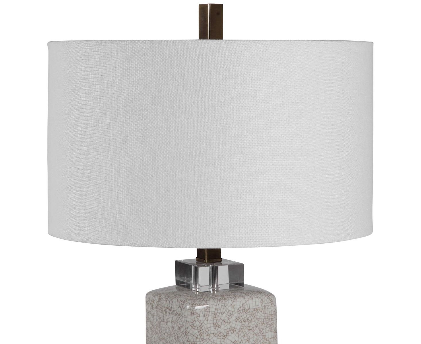 Керамическая настольная лампа имеет кремовую и темно-коричневую глазурь с антикварной матовой латунной отделкой и акцентами из хрусталя. Дополнена белым абажуром в форме барабана.