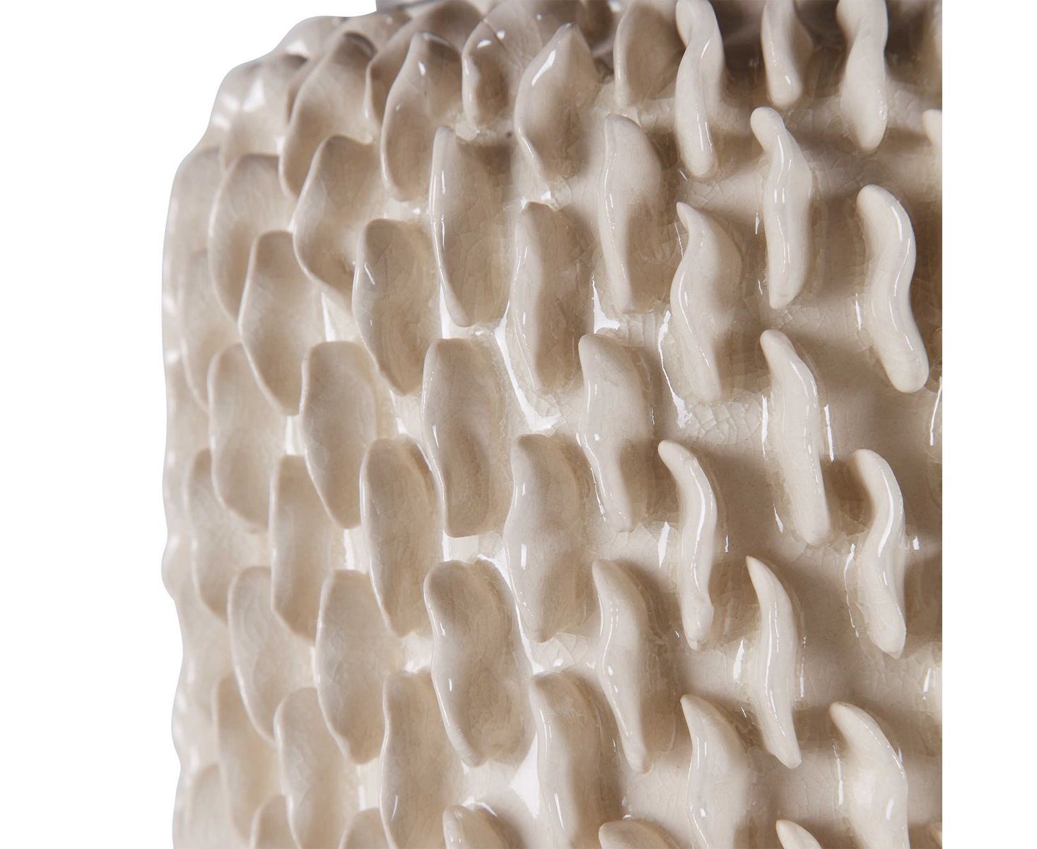 Керамическая лампа выполнена в органическом богемном стиле с глубокой текстурой, отделанной кремово-белой глазурью с акцентом из матового никелированного материала. Нижняя часть соединена с круглым абажуром в твердом переплете из серой льняной ткани.