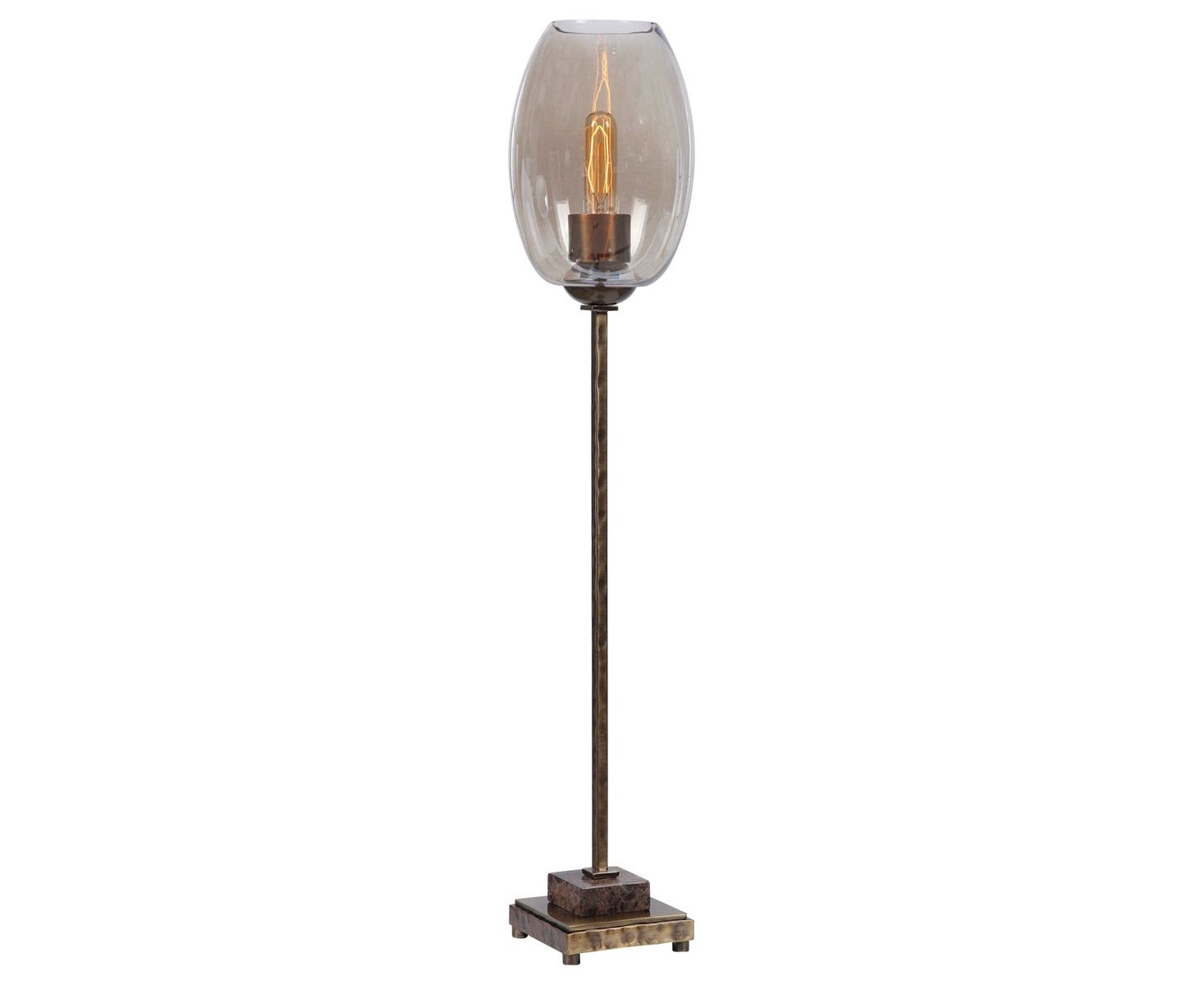 Эта лампа имеет цельную железную основу, отделанную античной матовой медью с кованой текстурой. Часть акцентирована коричневым мрамором и соединена с янтарным стеклом. В комплект входит одна 60-ваттная лампа.