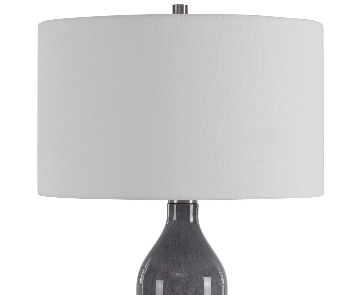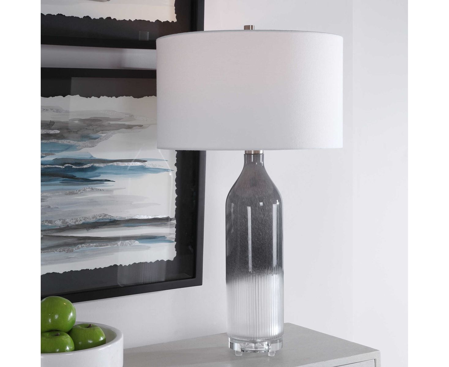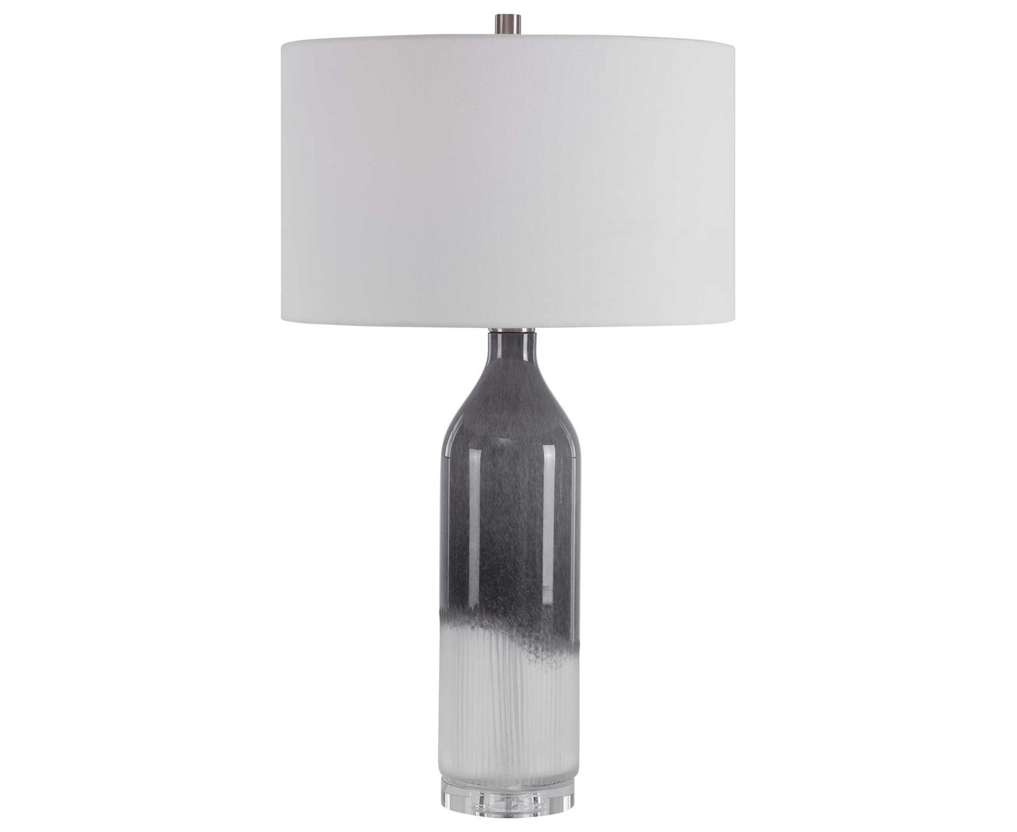 Идеально подходящий для любого стиля комнаты, этот настольный светильник из художественного стекла отличается переходным стилем с оттенком светло-серого и матового белого омбре, который отображается на толстой хрустальной ножке с акцентами из матового никеля. Лампа в паре с белой тканью барабанного абажура.