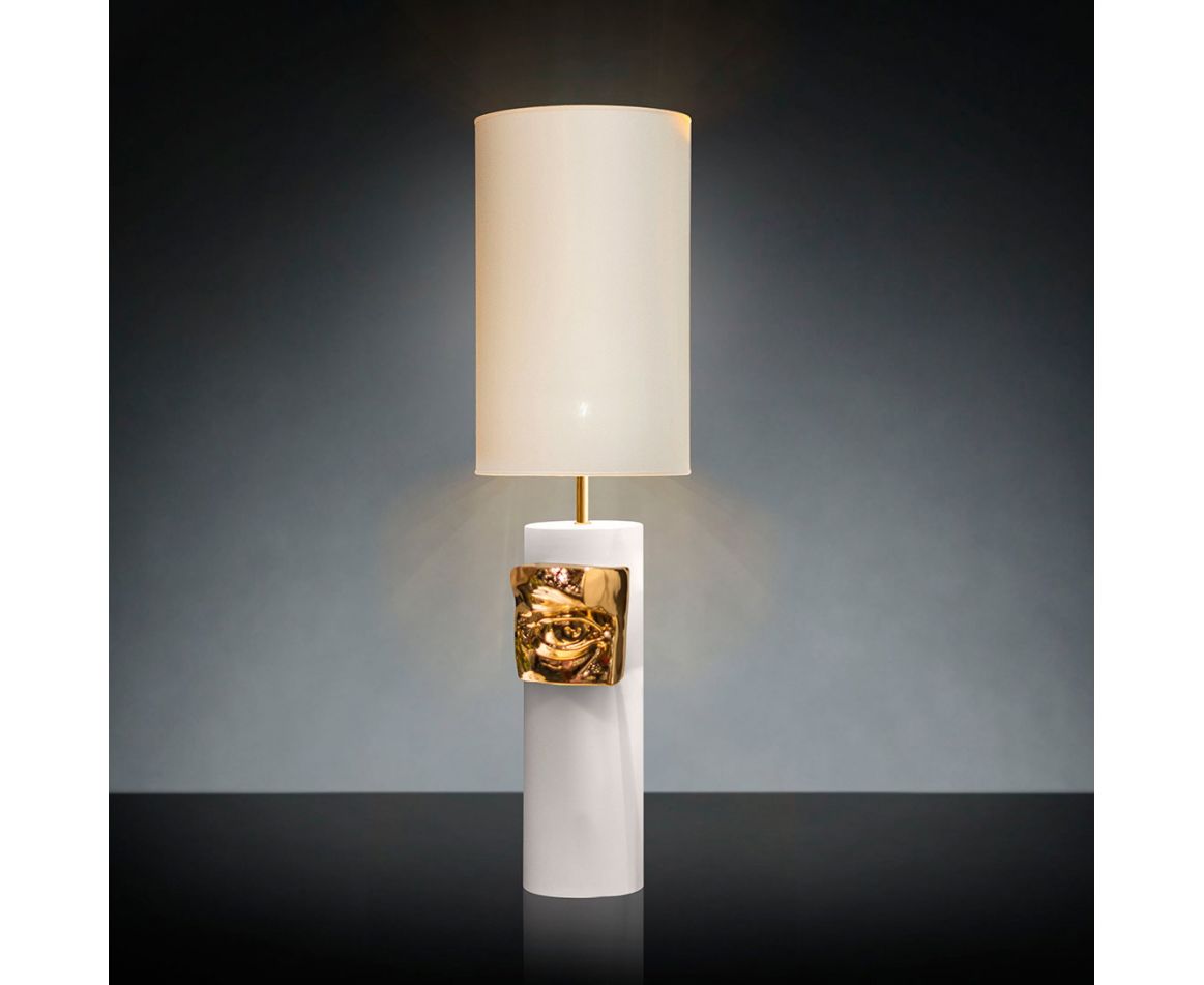 Торшер из керамики ручной работы, отличающийся современным дизайном и в тоже время вдохновленный классическими скульптурами итальянского искусства. Основа в матово-белом цвете с золотым 24К элементом, абажур белого цвета с золотым внутри.