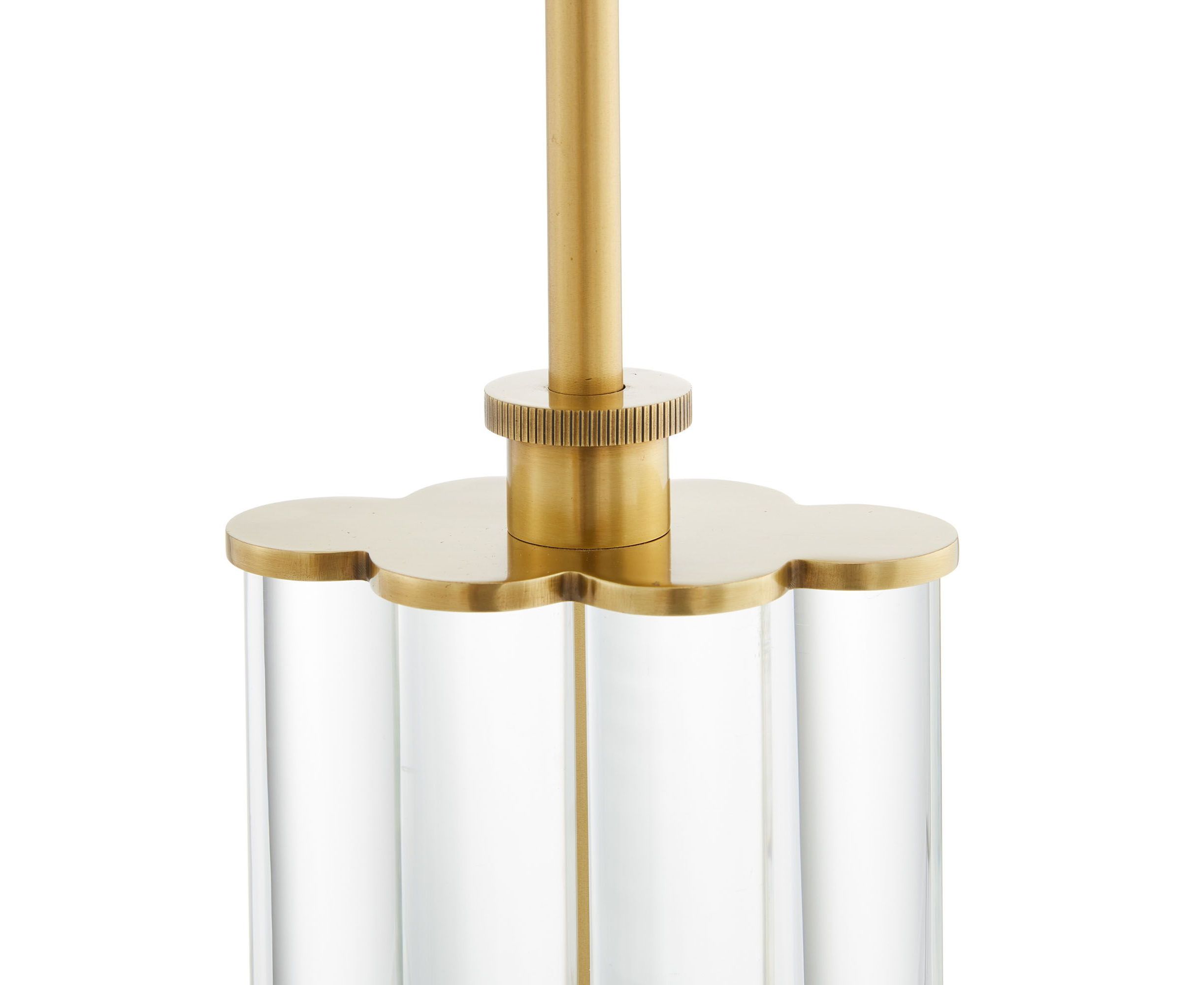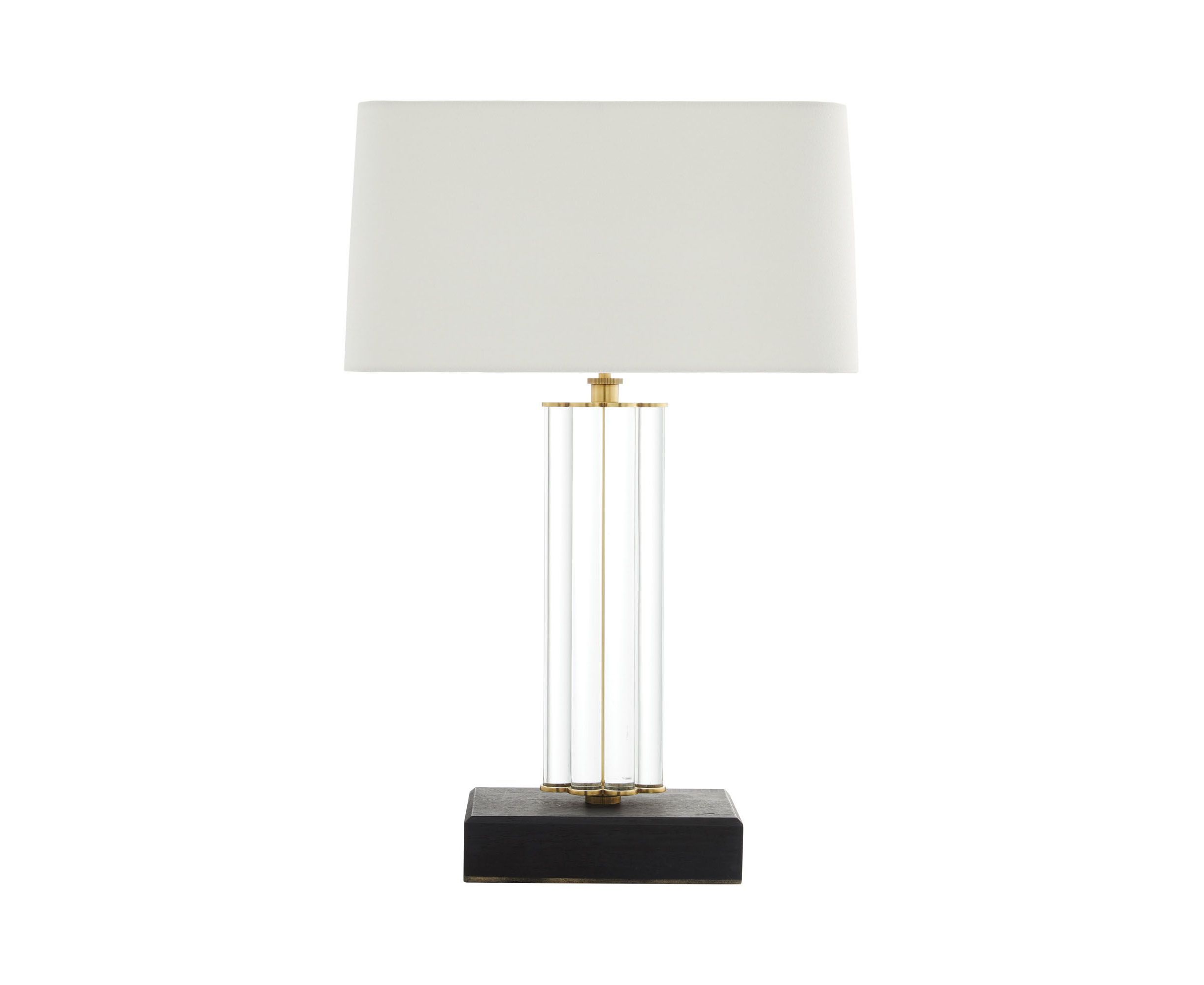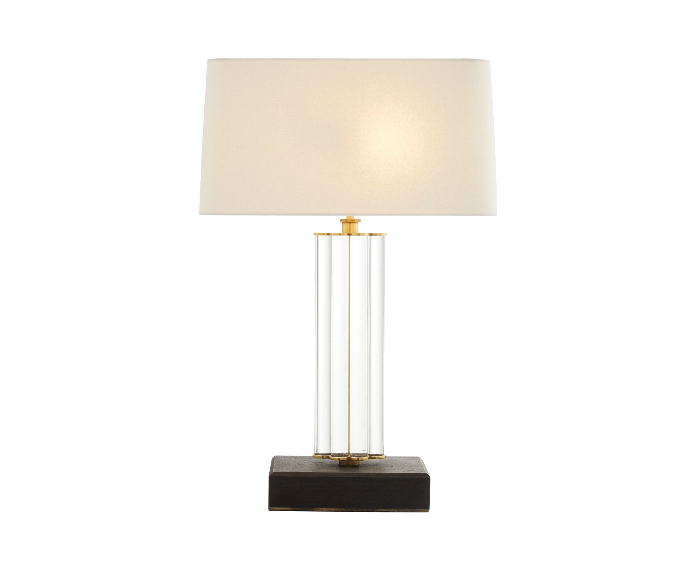 В простоте есть сила. Стержни из прозрачного стекла покрыты античной латунью и сгруппированы вместе, образуя колоннообразную лампу с основанием из черного дуба. Лампа увенчана белоснежным льняным прямоугольным абажуром с подкладкой в тон.