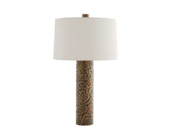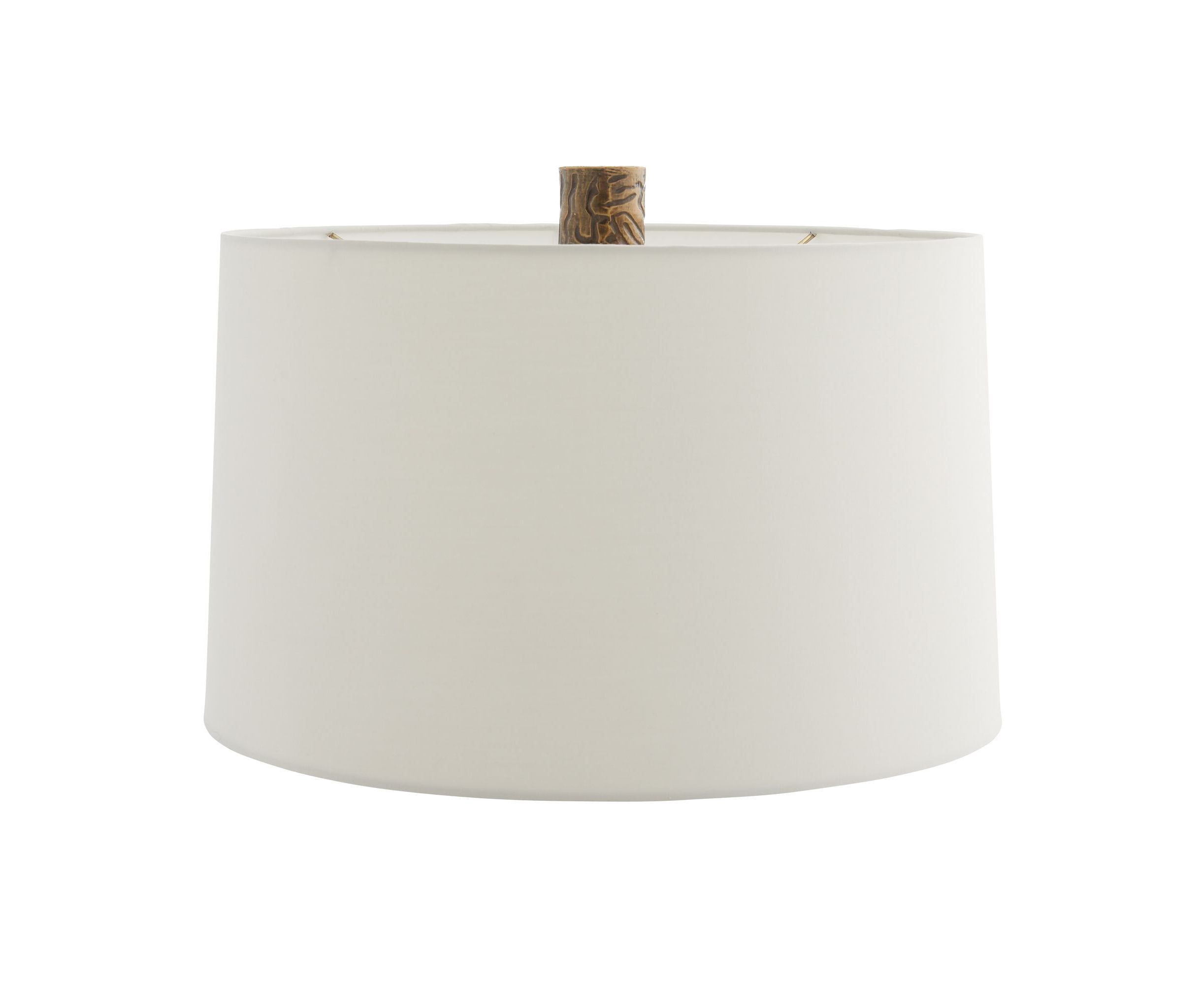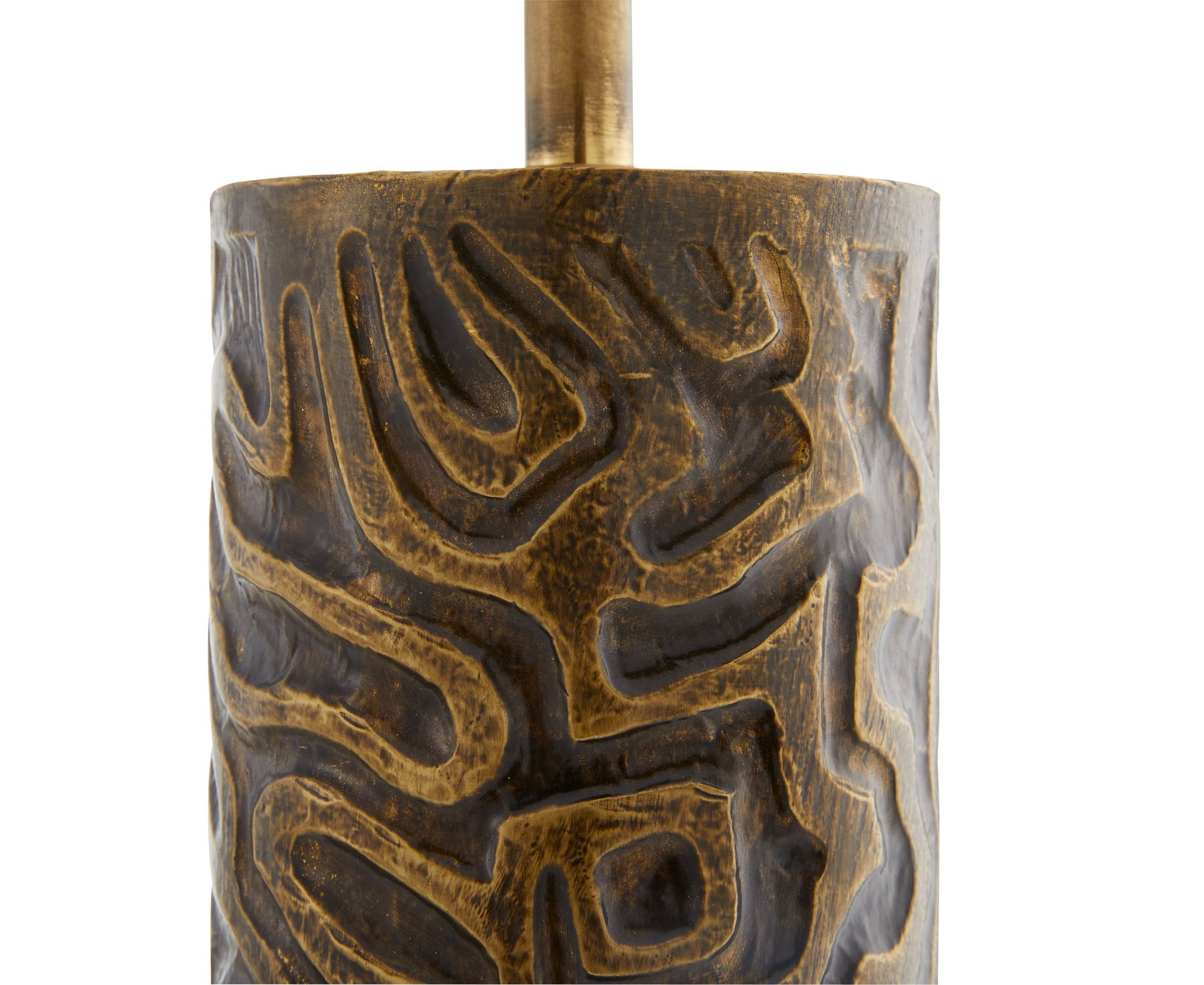 Каждая деталь лампы вырезана с изысканным мастерством, а похожий на лабиринт фасад покрыт слоем темной античной латунной облицовки. Когда светильник используется, свет привлекает внимание к изгибам и поворотам замысловатой линии. Сверху светло-серый хлопчатобумажный барабанный абажур с белой хлопчатобумажной подкладкой и соответствующими металлическими цилиндрическими навершиями.