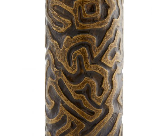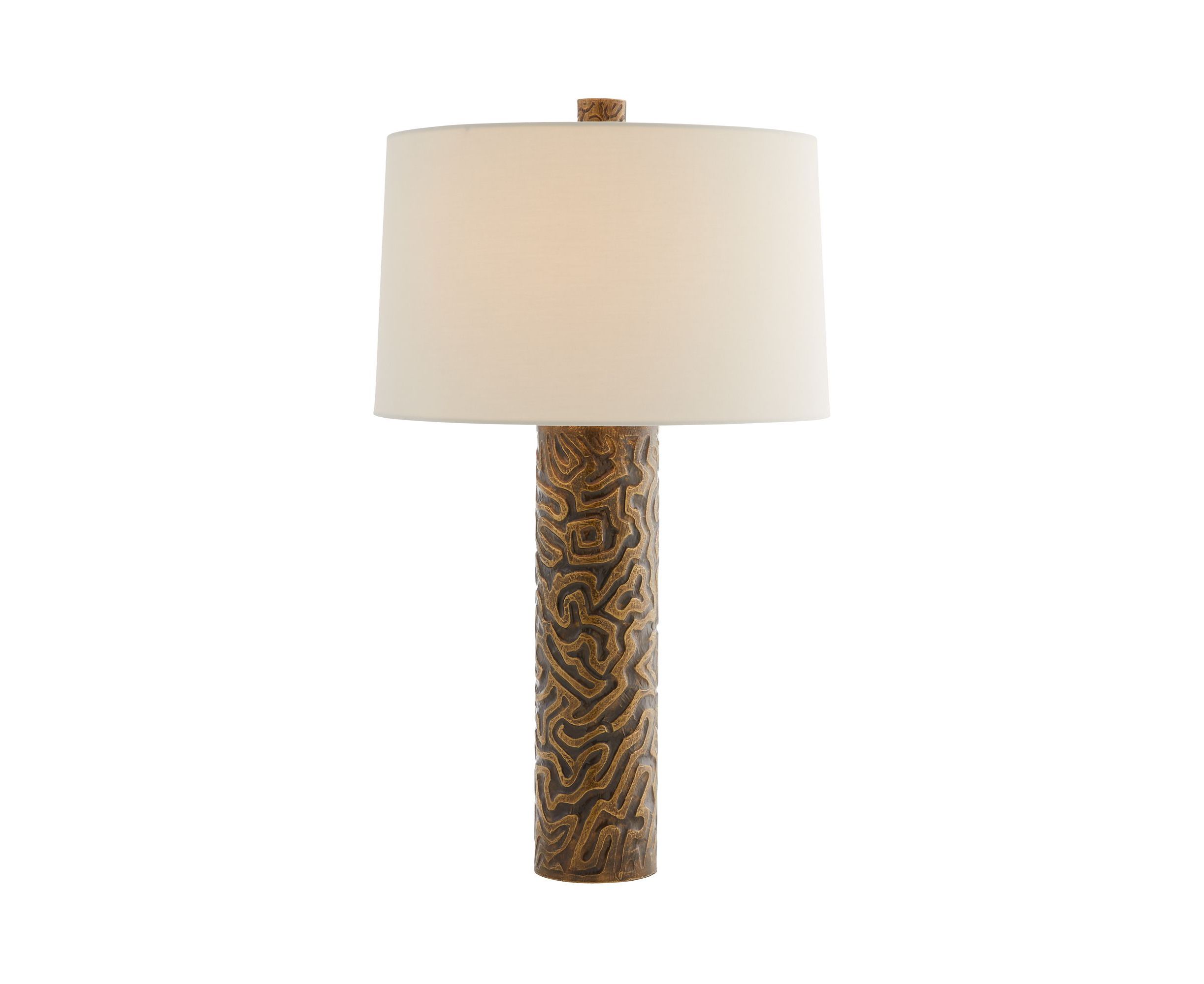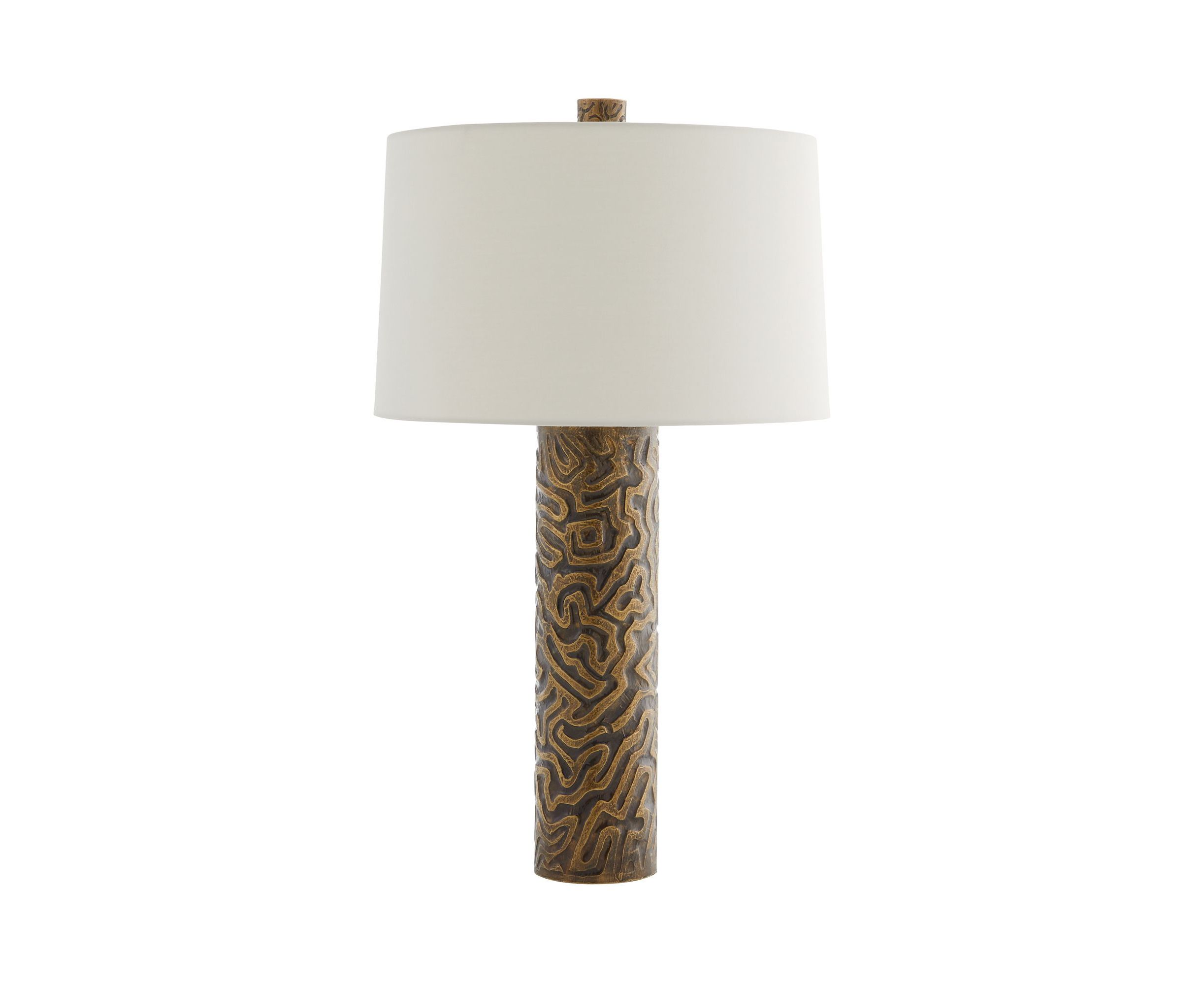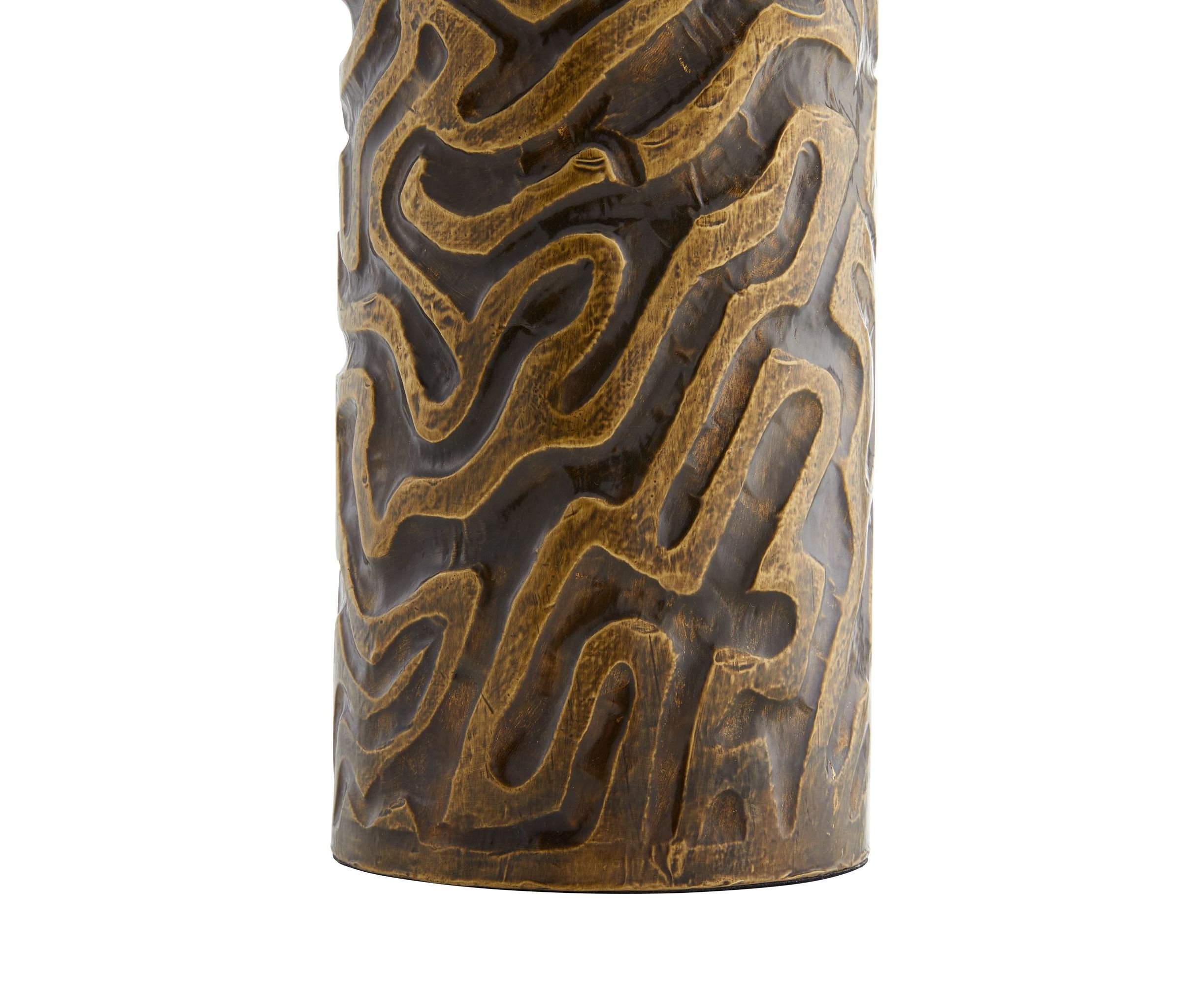 Каждая деталь лампы вырезана с изысканным мастерством, а похожий на лабиринт фасад покрыт слоем темной античной латунной облицовки. Когда светильник используется, свет привлекает внимание к изгибам и поворотам замысловатой линии. Сверху светло-серый хлопчатобумажный барабанный абажур с белой хлопчатобумажной подкладкой и соответствующими металлическими цилиндрическими навершиями.