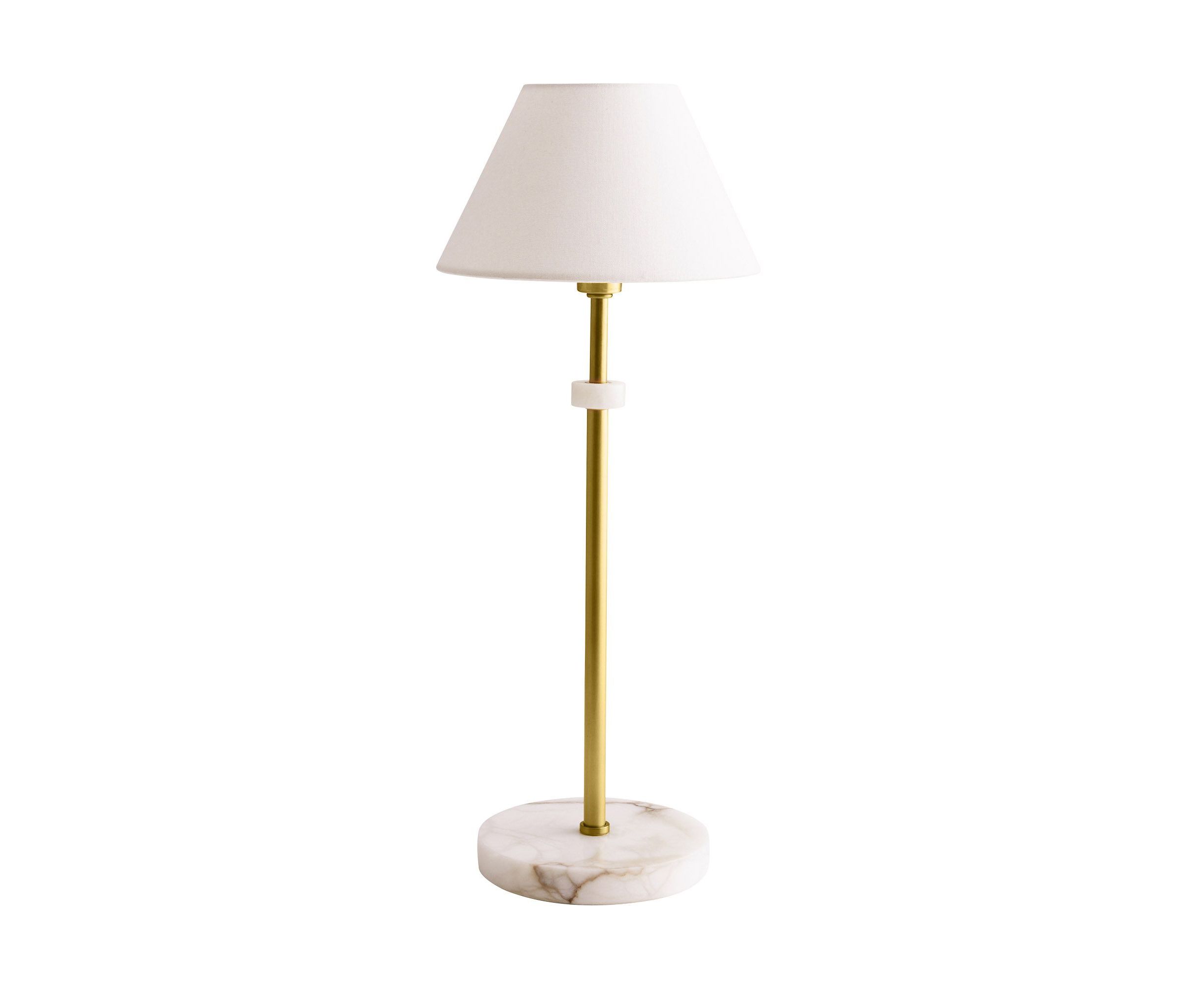 Newport привносит богатые материалы в переходный дизайн. Античная латунная стальная основа представлена на круглом белом алебастровом основании и дополнена одним подходящим алебастровым акцентом. Белый льняной абажур помогает смягчить свет.