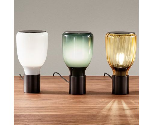 Стекло доступно в молочно-белом цвете или, в версии с оттенками или в полоску, в элегантном нефтяном или янтарном цвете. Лампы Acquerelli бывают двух видов. Размеры, большие или маленькие. В настольной версии два размера соответствуют двум разным формам абажура. В подвесной версии также доступен вариант с двойным остеклением, где маленький абажур в сочетании с большим образуют единый потолочный светильник, создающий удивительную игру света.
