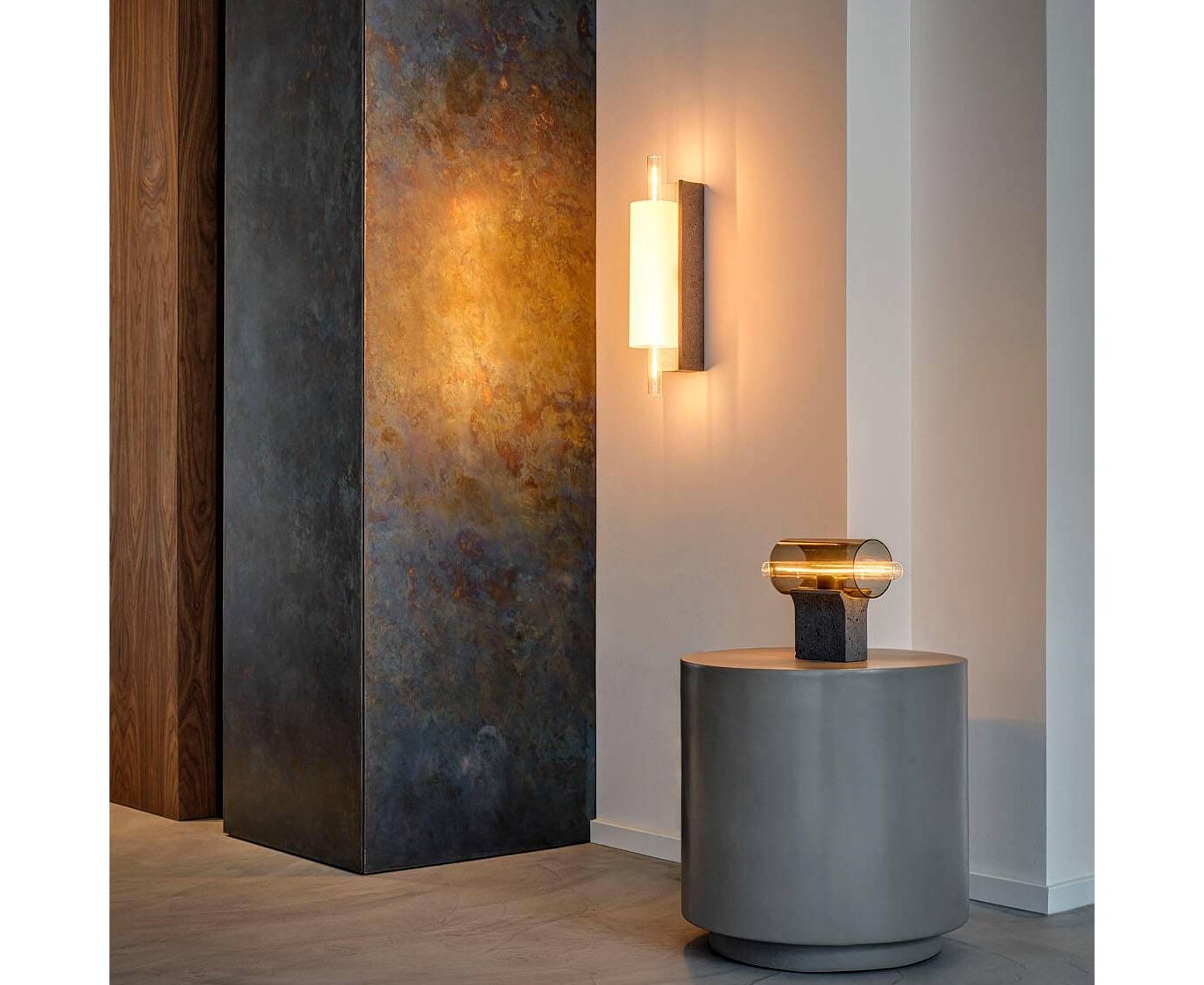 Современный, но неподвластный времени. Экстравагантный по своему стилю и использованию чистых геометрических форм. Вдохновленный архитектурой. Коллекция возникла в результате синтеза различных материалов на мудбордах в ходе творческого процесса, который включал поиск идей и ассоциаций между искусством и дизайном, наложение различных текстур и игру с объемами. Выдувные трубки из прозрачного стекла придают коллекции Overlay особый характер, а также уникальную бетонную лампу, в которую встроены фрагменты переработанного стекла с стекольной фабрики Janstein. Изделие отлито в различных прямоугольных объемах специально для каждого типа освещения, способных вместить как простые, так и множественные композиции. Внутри бетонной насадки находится тонкая втулка из матового или прозрачного стекла, ее центральную линию пересекает световая трубка, которая, по-видимому, парит внутри. Тематика коллекции Overlay включает в себя варианты горизонтального подвешивания, настольные лампы и настенные светильники, которые открывают дверь в новую область возможностей в области освещения